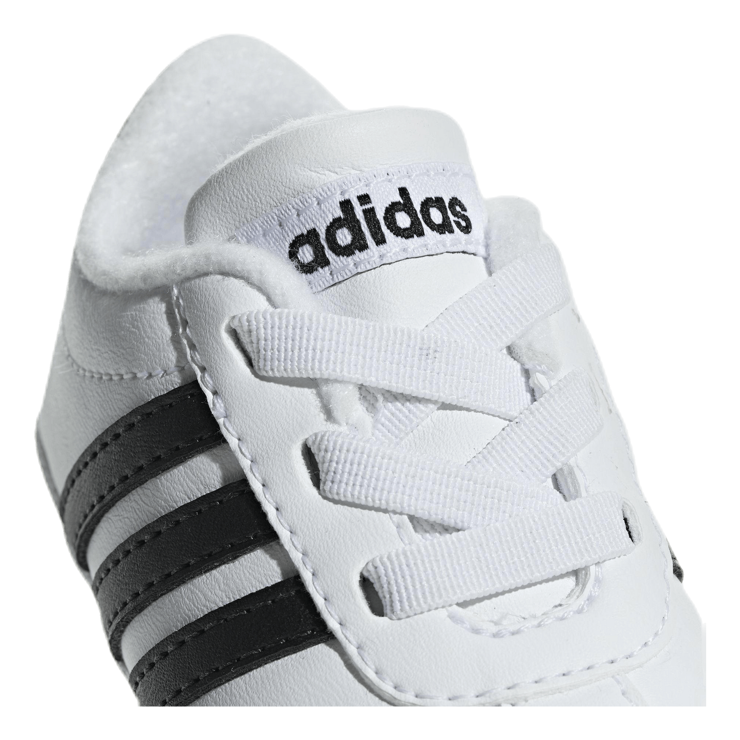 These toddler-friendly VL Court 2.0 shoes feature a durable, non-slip sole and a leather-like upper with Adidas' signature three-stripe design. The elastic shoelaces ensure easy on-and-off, while the padded midsole provides all-day comfort. With a classic white and black color scheme, these sneakers offer both style and practicality for active little feet.