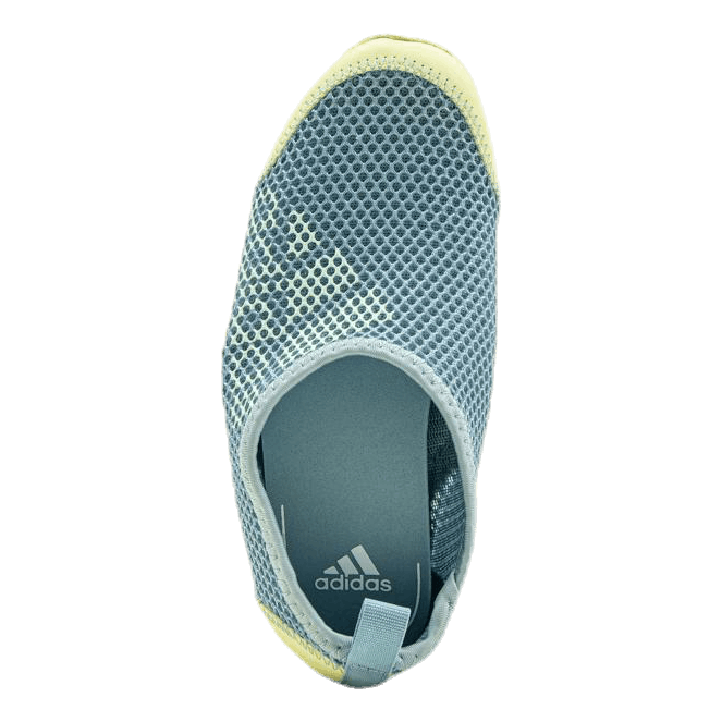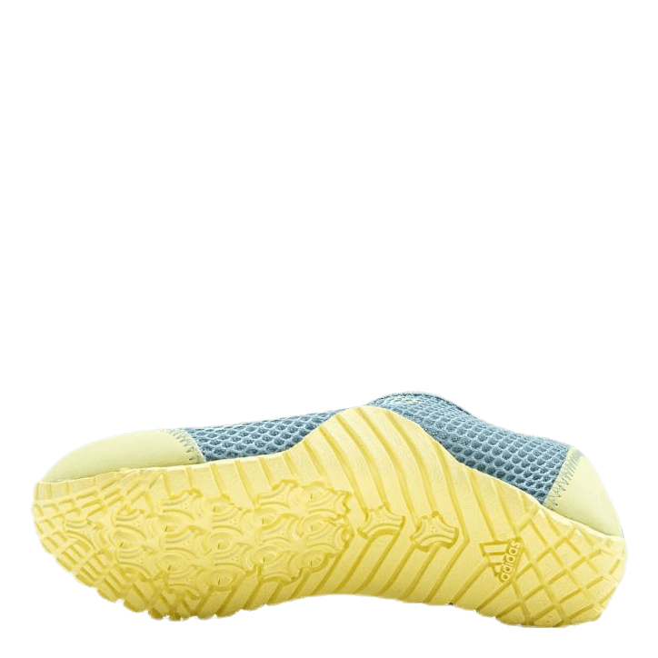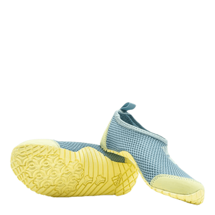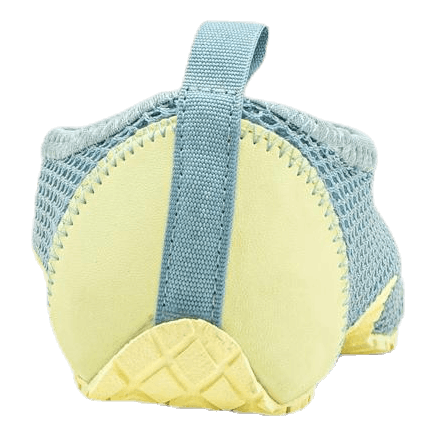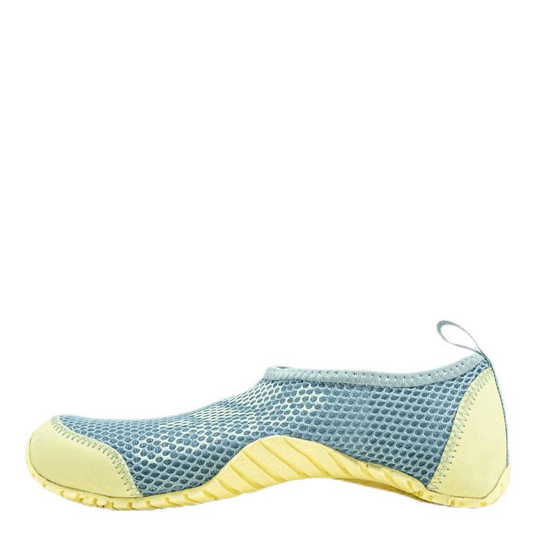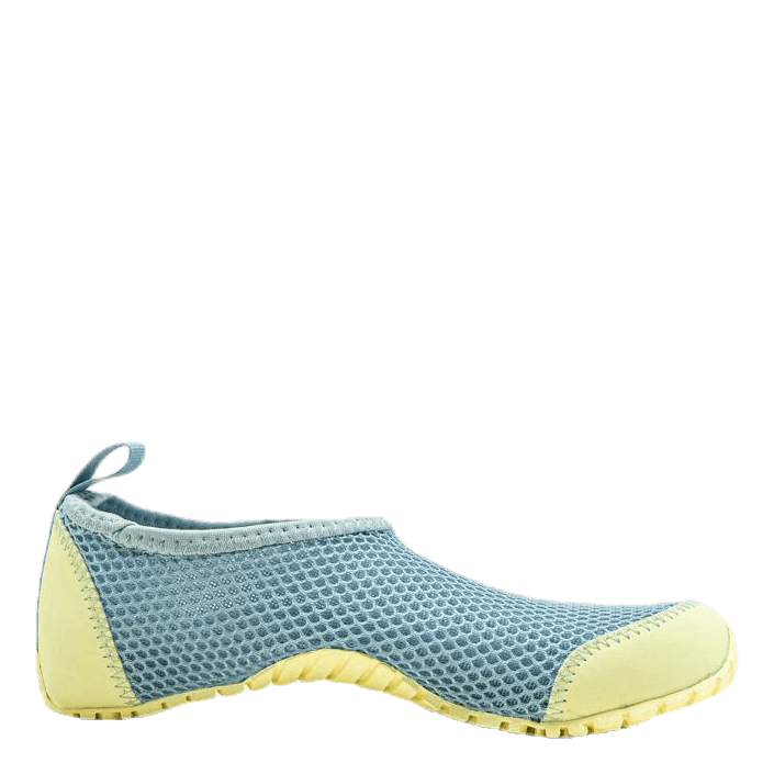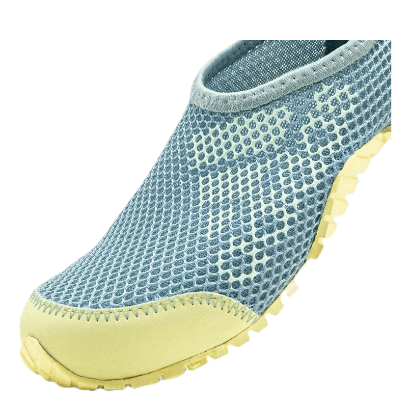 These versatile children's bathing shoes feature a breathable blue-grey mesh upper with protective yellow accents. Designed for beach and sea adventures, they offer a comfortable sock-like fit and easy slip-on style. The textured yellow outsole provides excellent grip for stability both in and out of the water, making them perfect for young explorers.