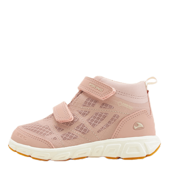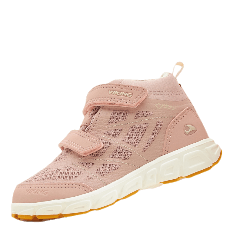 Lightweight and waterproof, the Veme Vel Mid Gore-Tex children's shoe combines sporty style with practical features. Its pink high-top design boasts a GORE-TEX® membrane for breathability, two easy-adjust Velcro straps, and a durable rubber outsole for excellent grip. The EVA midsole and molded insole ensure comfort, while the trendy mesh upper keeps active kids stylish in all weather conditions.