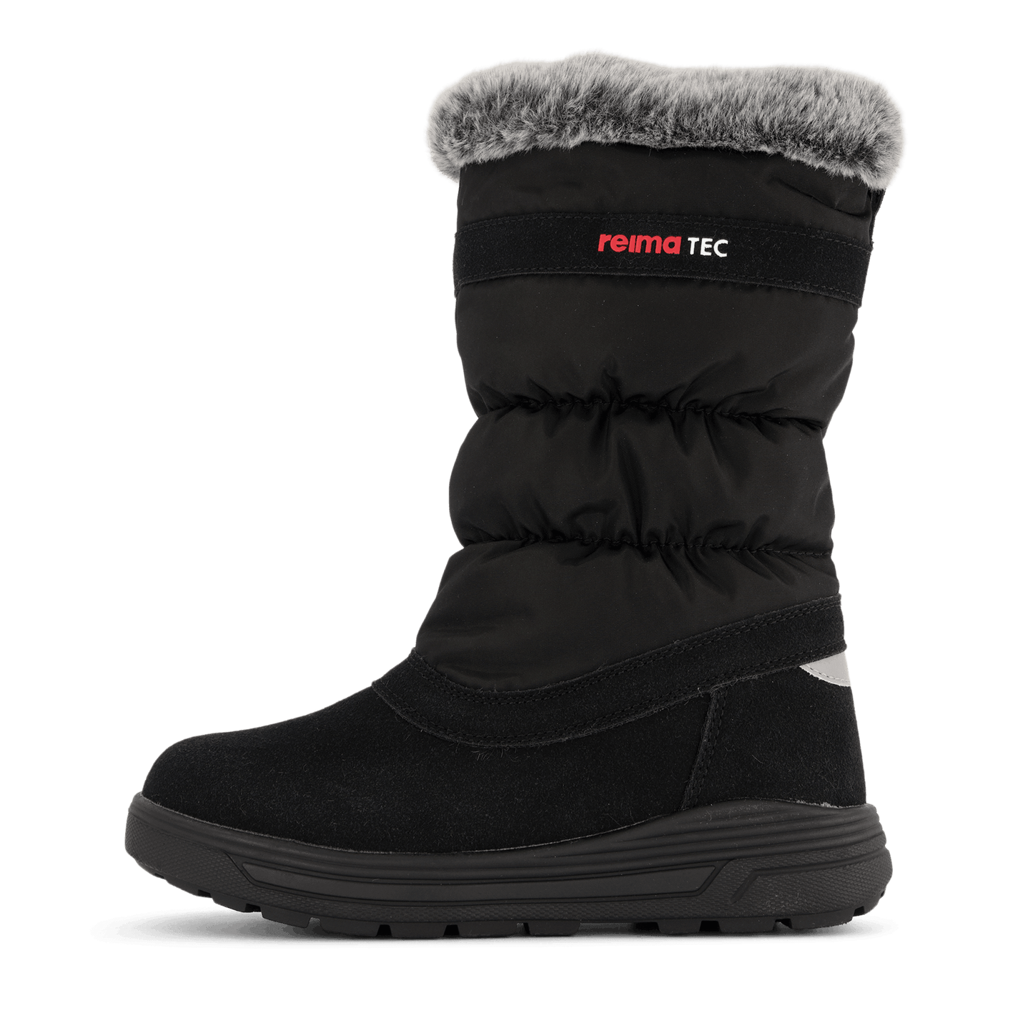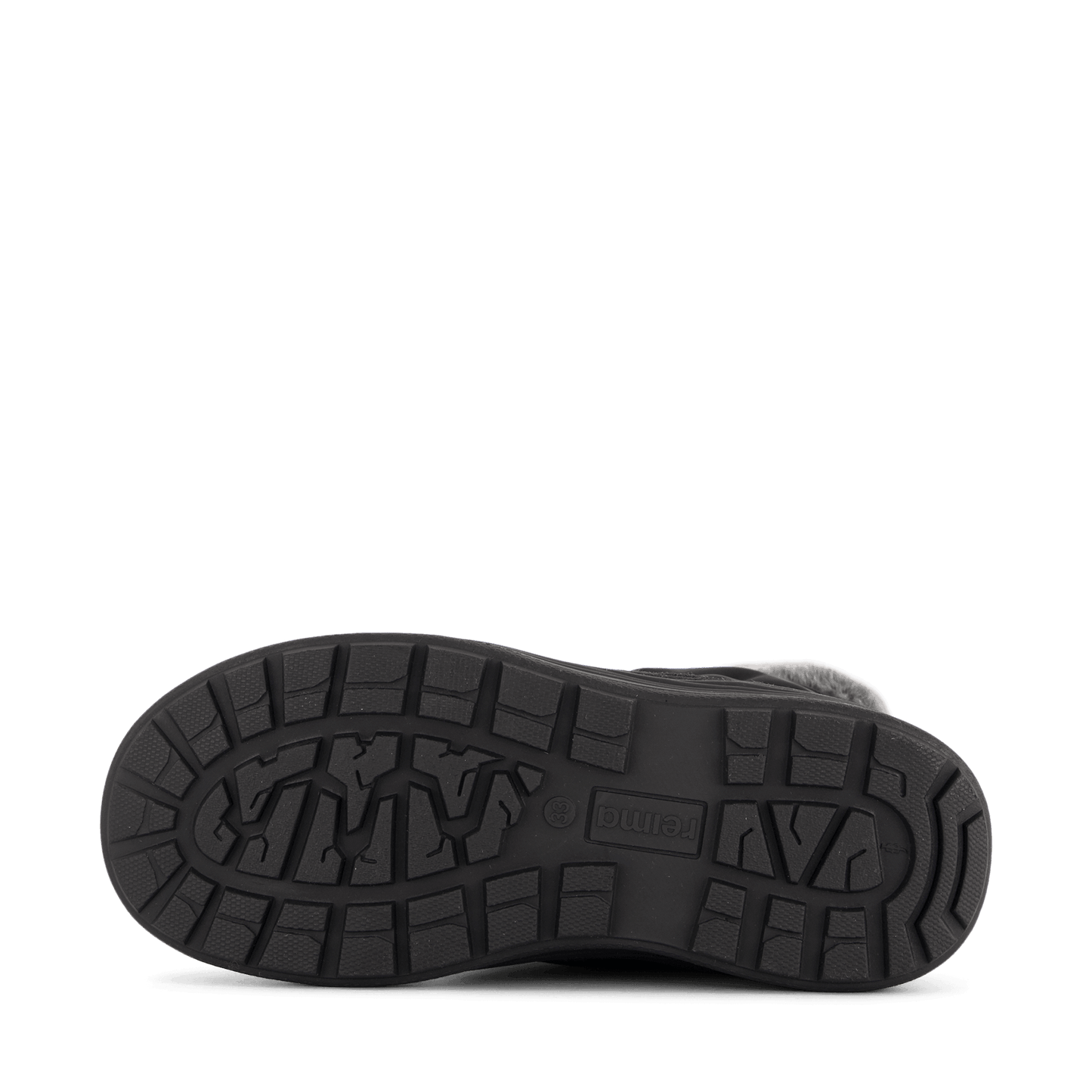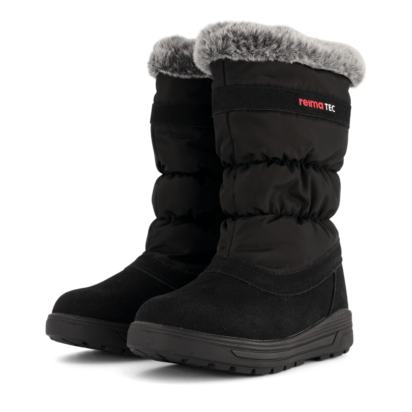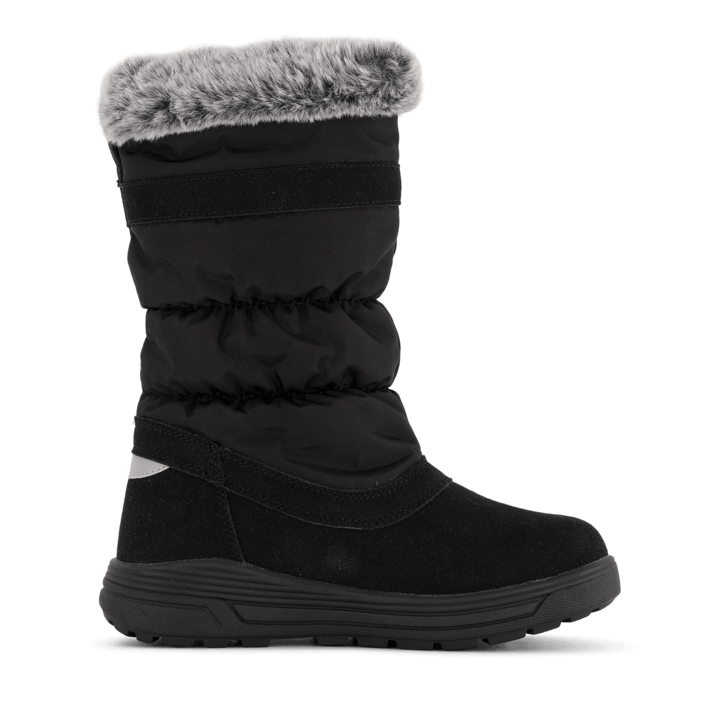 Stylish and functional, these Sophis Reimatec® Black children's winter boots feature a padded quilted shaft, cozy faux fur trim, and durable rubber sole for excellent traction. The black suede-like lower and quilted nylon upper combine warmth with fashion. Reflective details enhance safety, while the red Reimatec logo adds a pop of color to these cold-weather essentials.