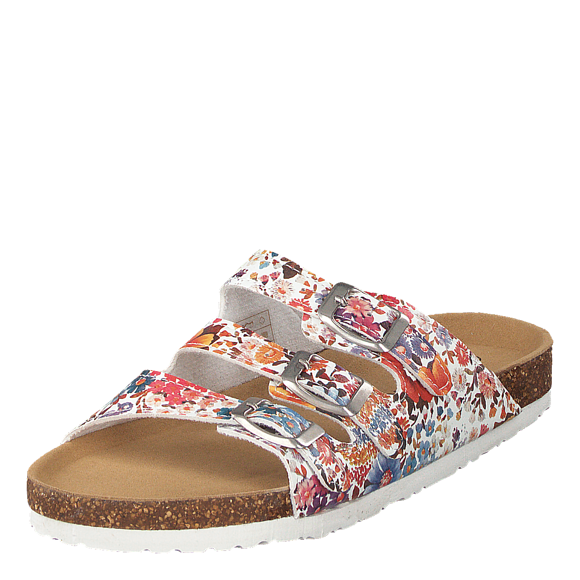 Elevate your summer style with these versatile slip-on sandals featuring a vibrant floral print on a white background. The three adjustable straps with silver buckles ensure a perfect fit, while the light brown footbed offers comfort and support. Perfect for beach outings or casual events, these sandals combine bohemian charm with practical design for effortless warm-weather wear.