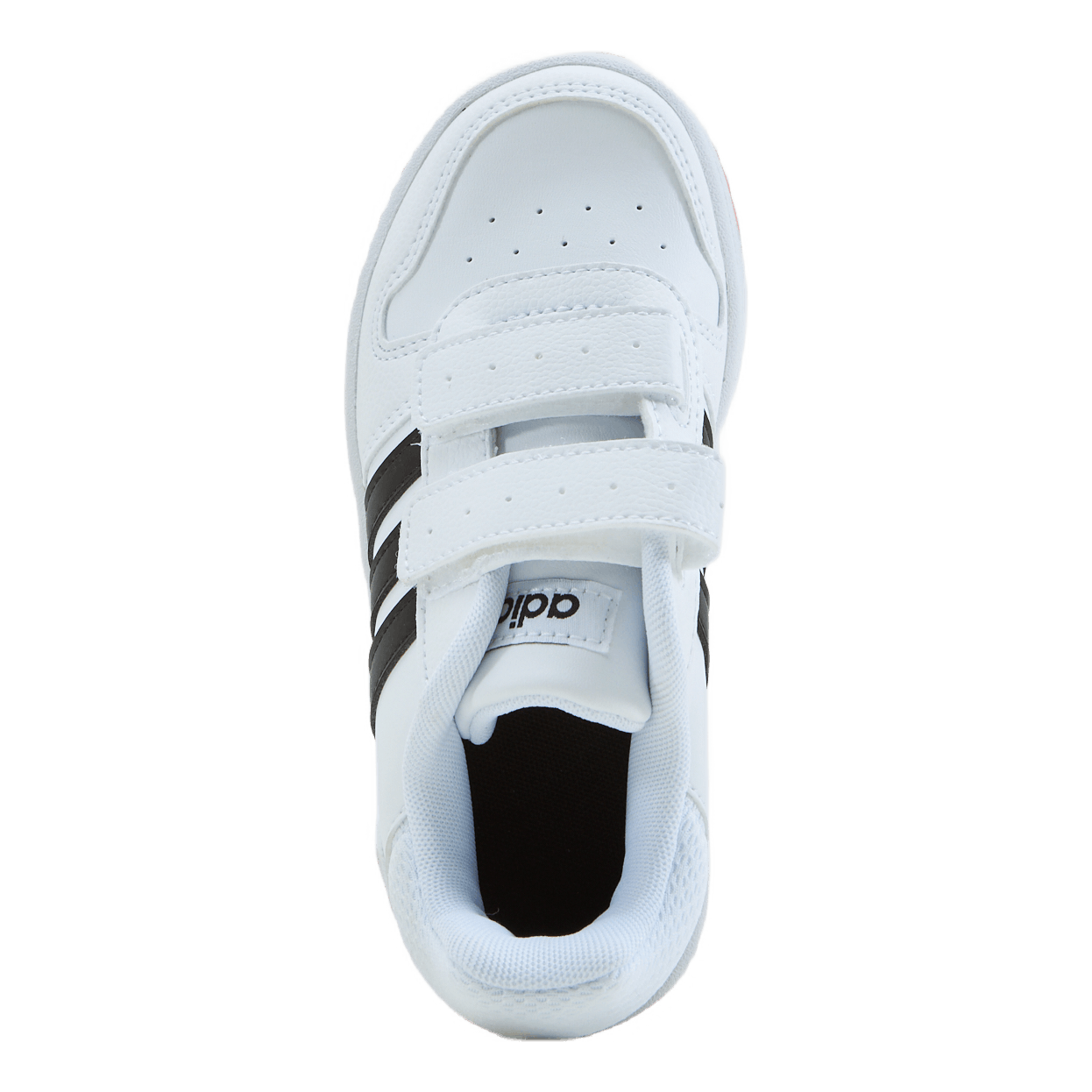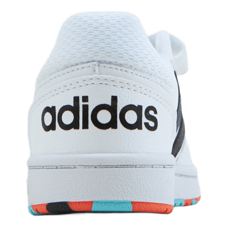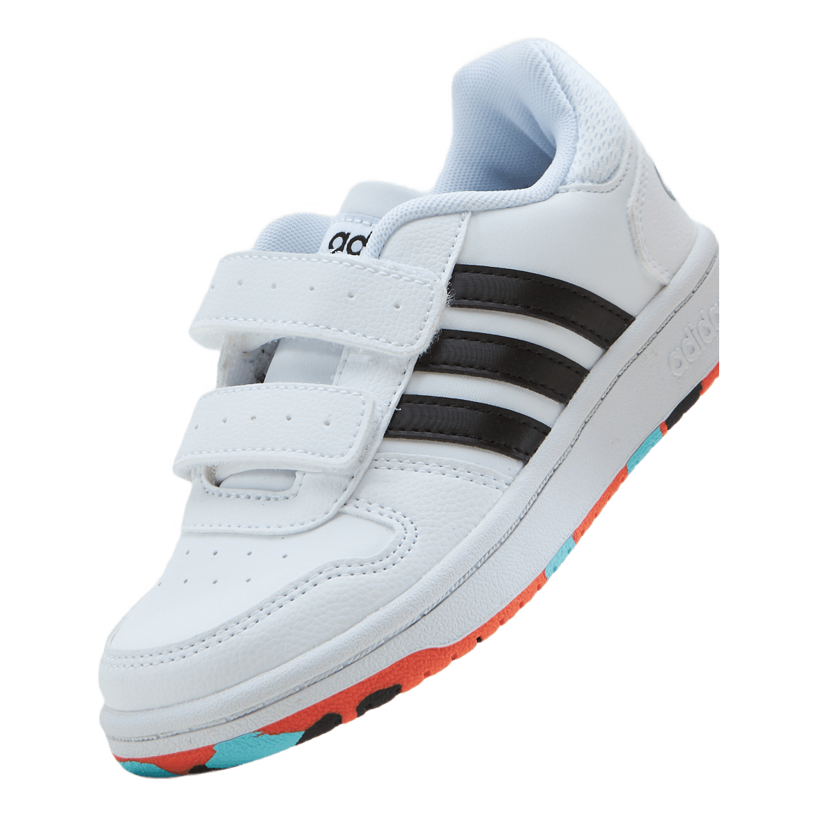 Elevate your child's style with these Adidas Hoops 2.0 shoes. Featuring a sleek white synthetic leather upper with iconic black 3-Stripes, these low-profile trainers offer a modern take on classic basketball design. Easy-to-use velcro straps, a breathable mesh collar, and a playful multi-colored outsole combine comfort, practicality, and fun for everyday wear.