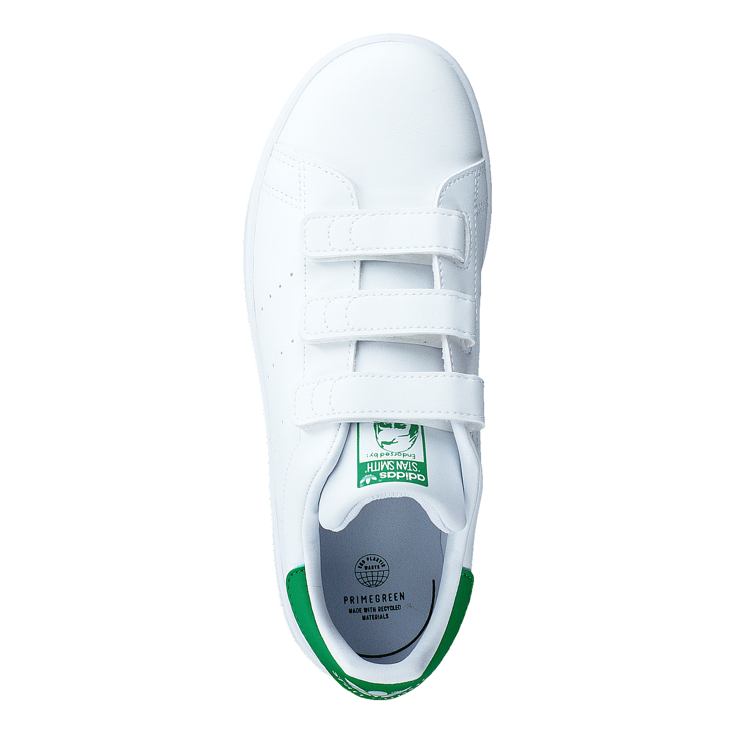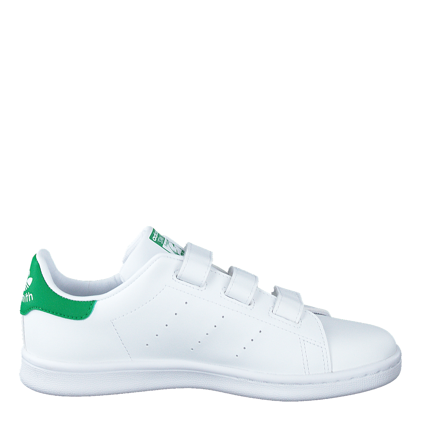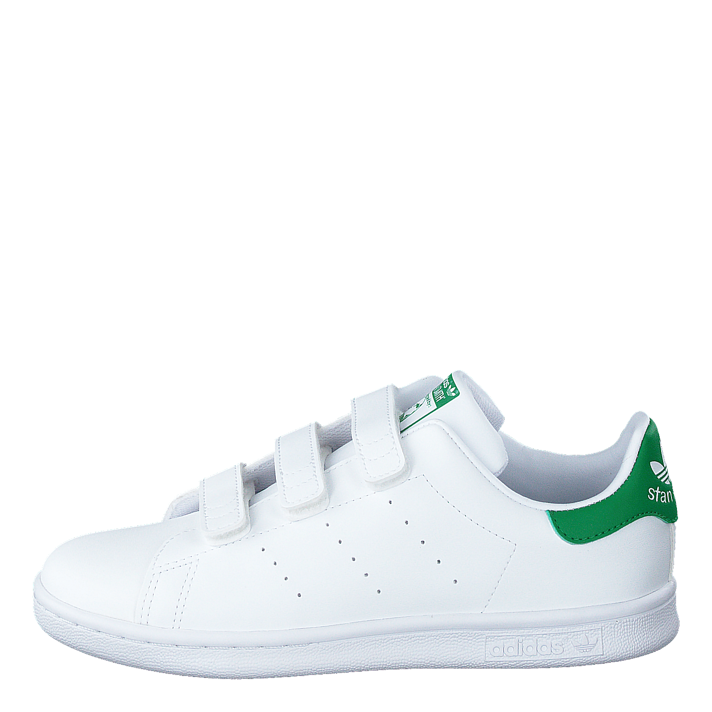 Classic Adidas Stan Smith sneakers designed for kids, featuring a white leather upper with iconic perforated three-stripe design. These shoes come with three convenient velcro straps for easy fastening, perfect for little feet. The vibrant green heel tab adds a pop of color and showcases the Adidas logo. Made with recycled materials, these sneakers combine style and sustainability.
