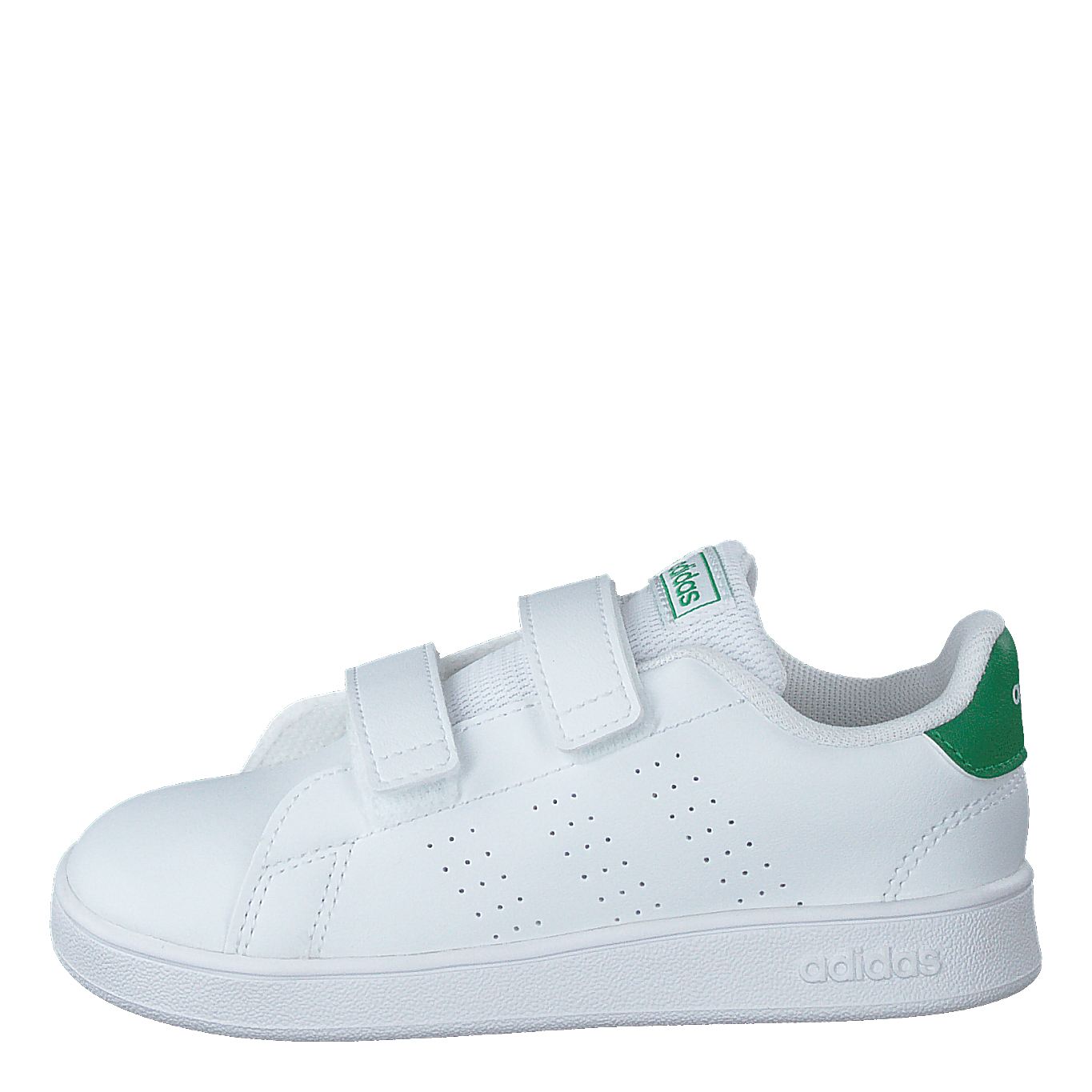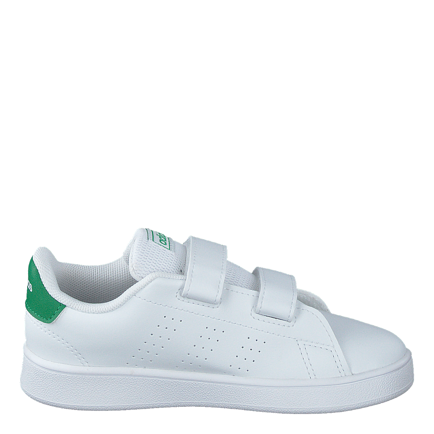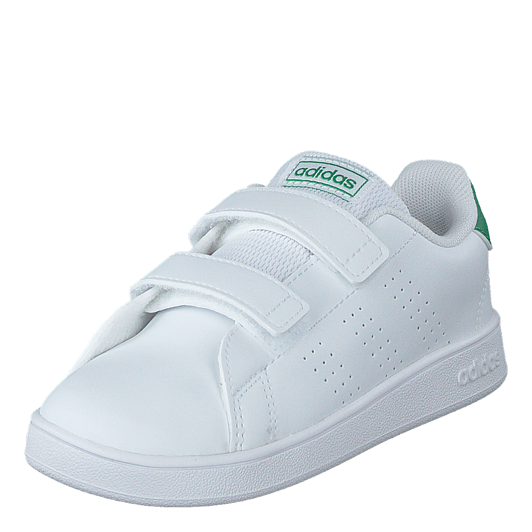 Sleek and versatile, these Advantage Shoes from adidas feature a clean, minimalist design in Cloud White with Green and Grey Two accents. The smooth upper boasts perforated sides for breathability, while two velcro straps offer easy on-off functionality. A green heel tab adds a pop of color, complementing the white rubber sole for a modern, casual look.