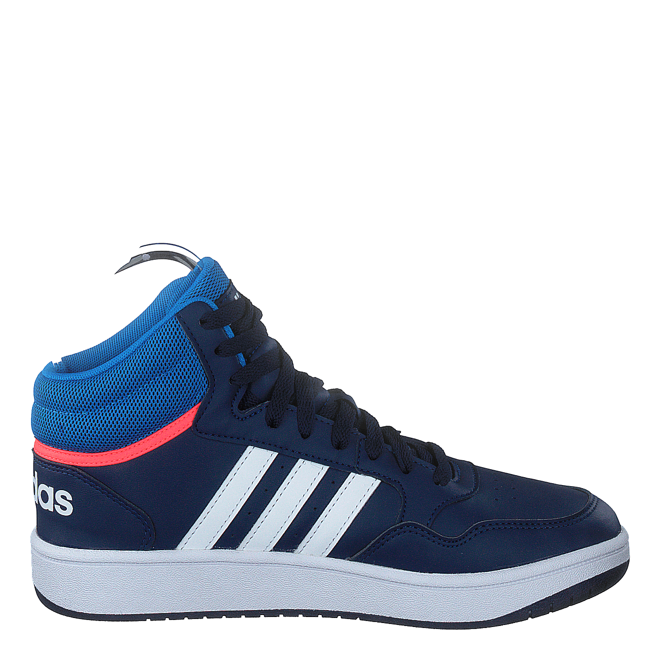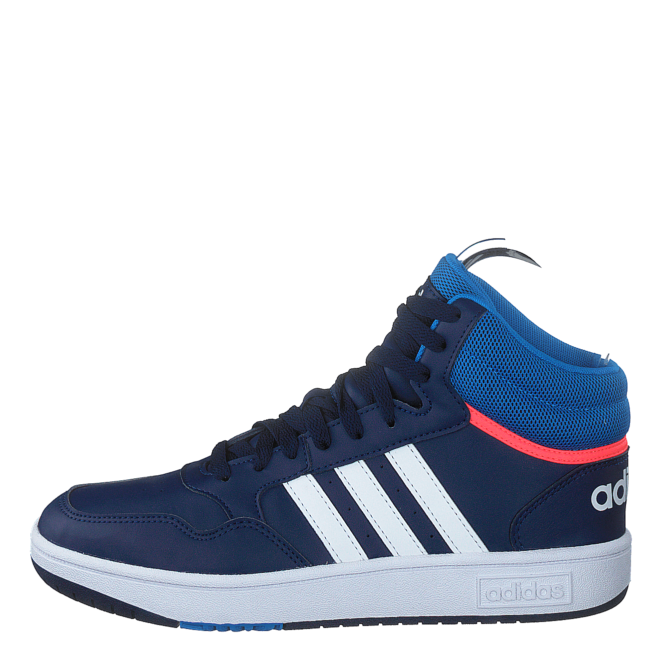 Elevate your game with adidas Hoops Mid Shoes in Dark Blue, Blue Rush, and Turbo. These basketball-inspired sneakers feature a sleek synthetic leather upper, breathable mesh collar, and signature three-stripe design. With a contrasting white rubber sole for superior grip and a bright red accent stripe, these mid-top shoes blend style and performance for both on-court action and casual wear.