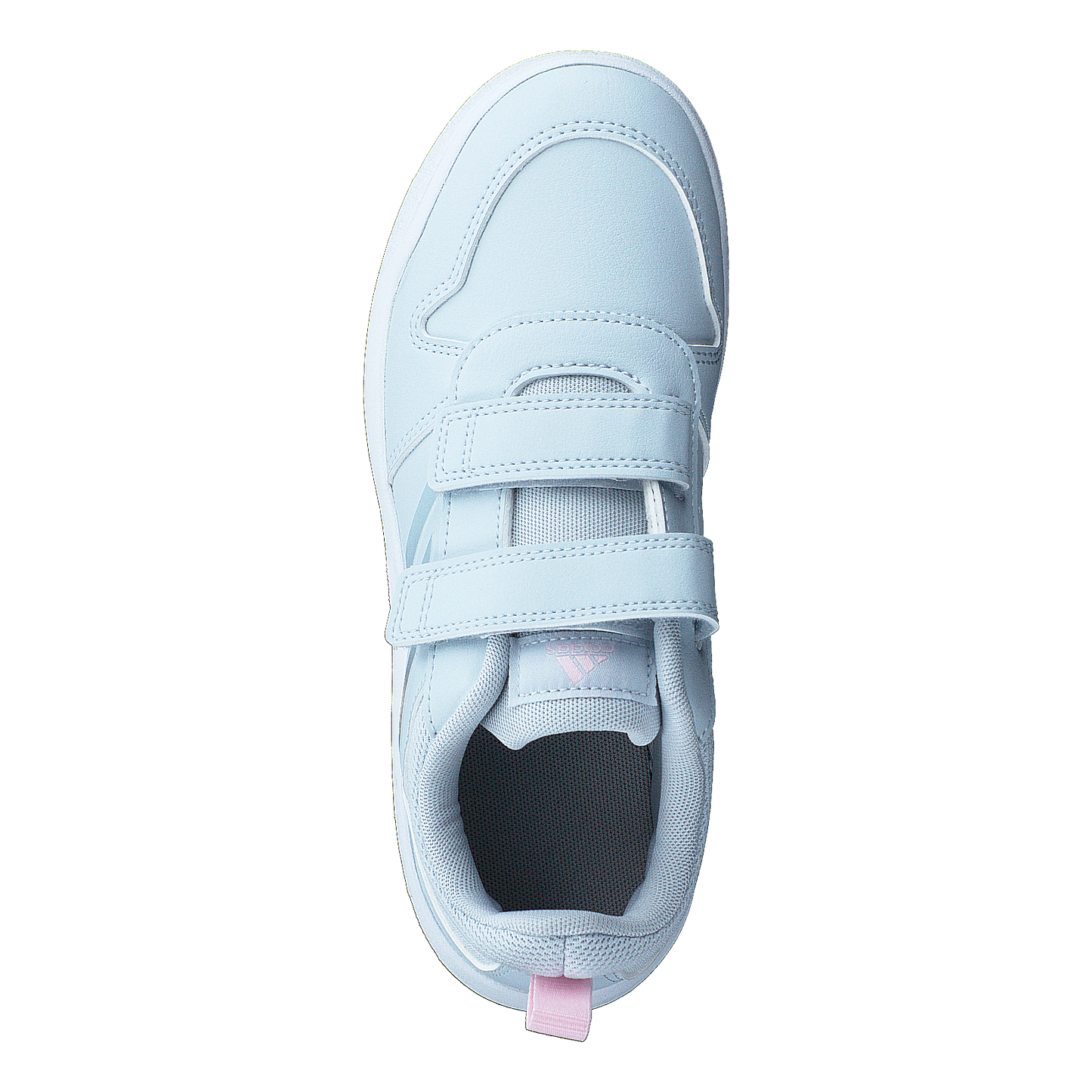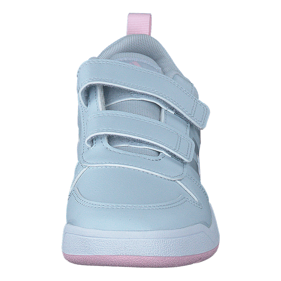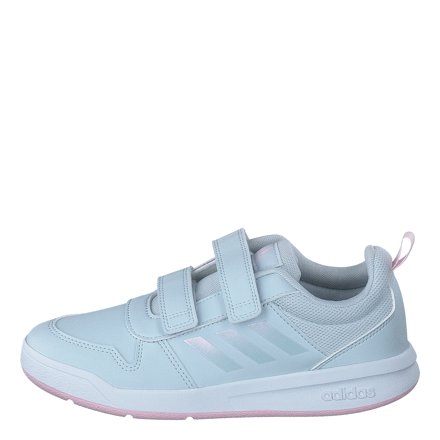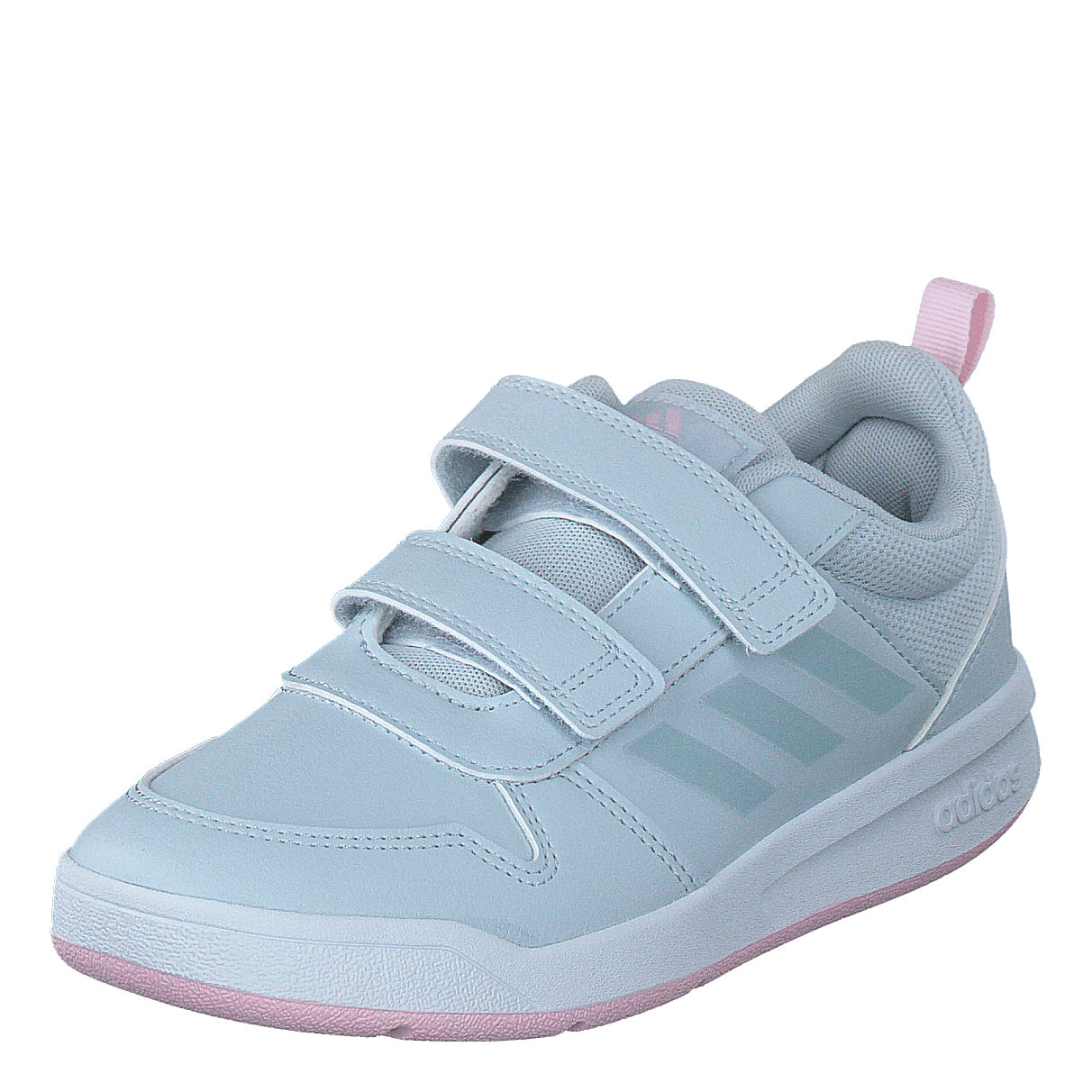 These adidas Tensaur kids' athletic shoes feature a light blue upper with iridescent stripes and pink accents. The durable textile construction offers support, while two hook-and-loop straps ensure easy wear. A non-marking rubber outsole provides traction, making these shoes ideal for everyday activities and light sports.