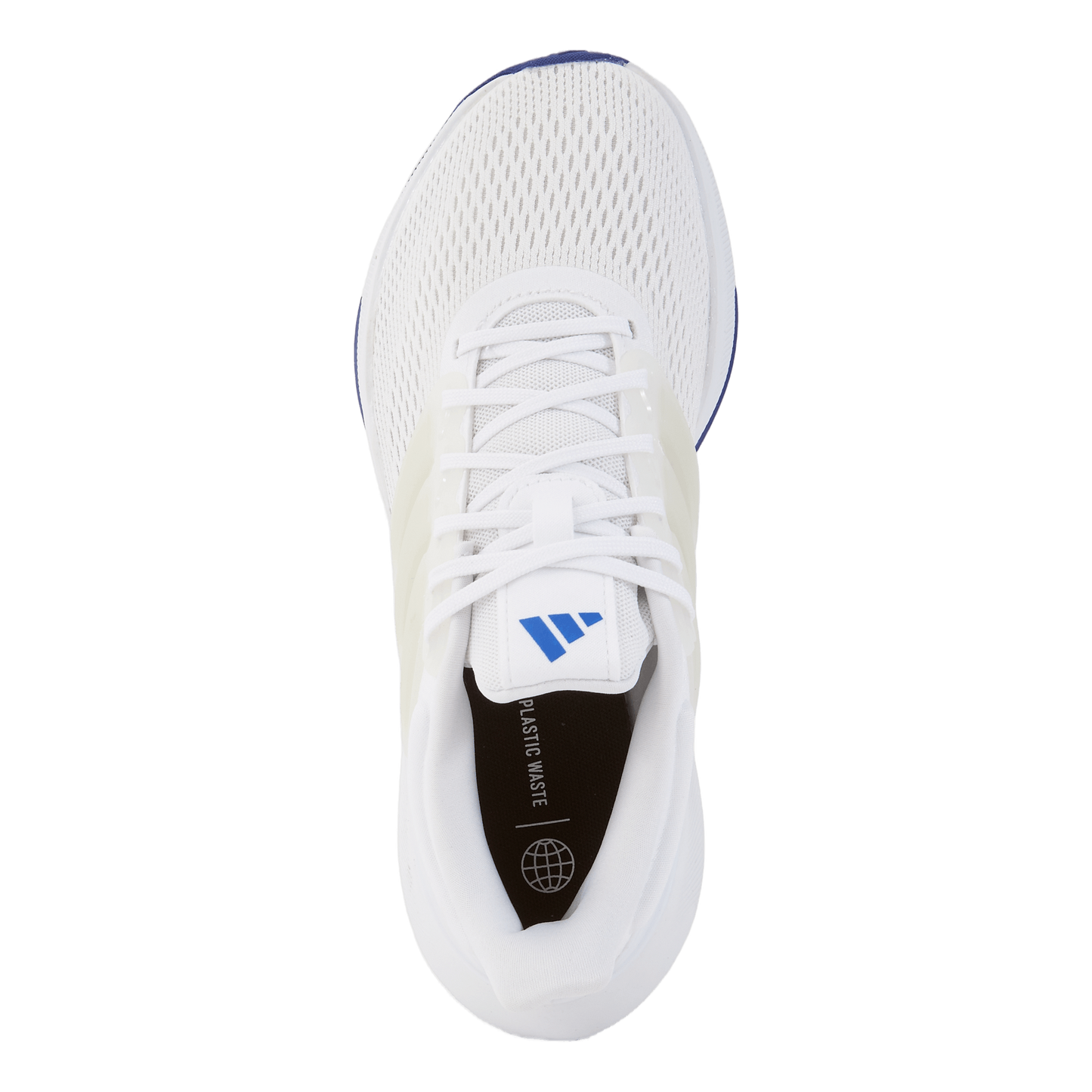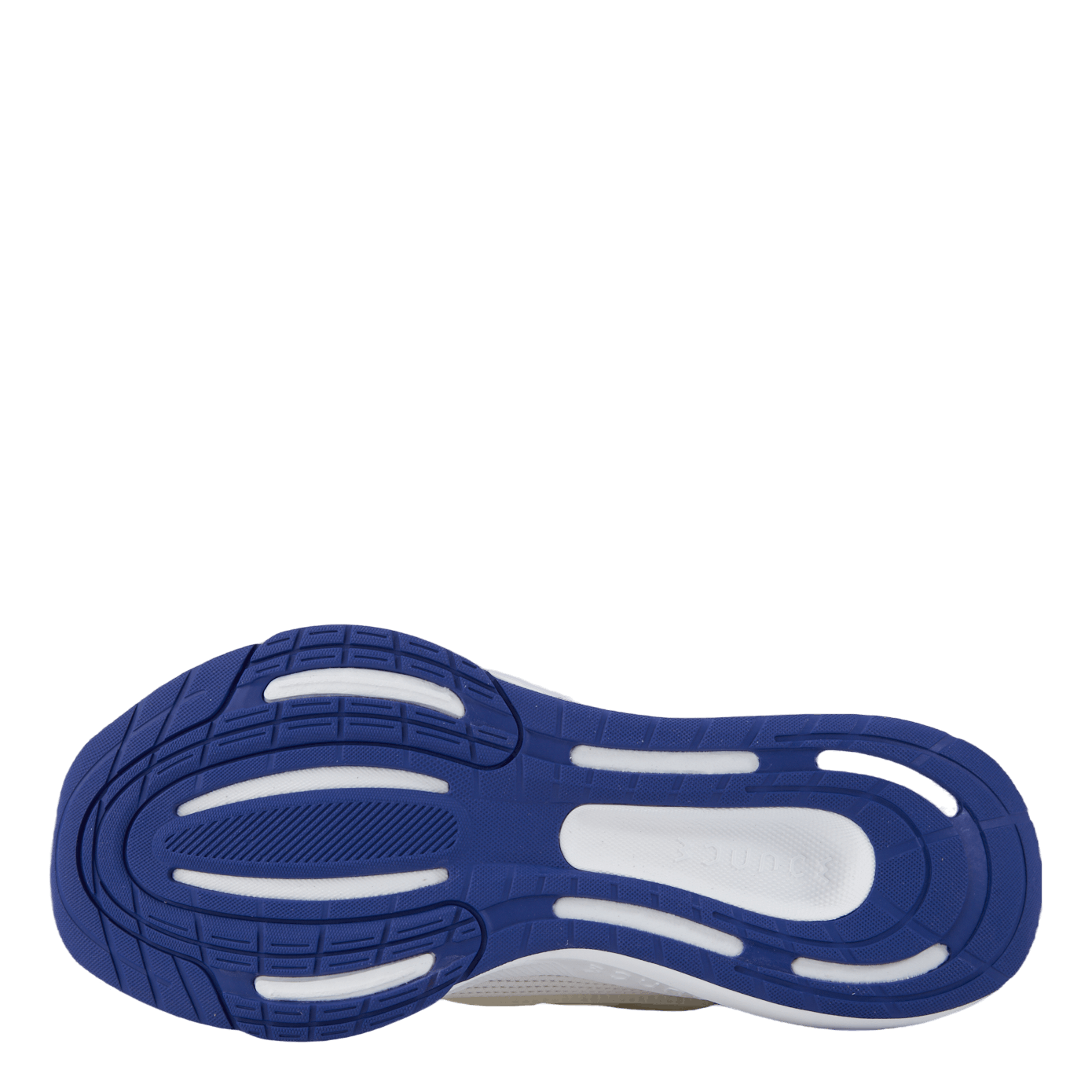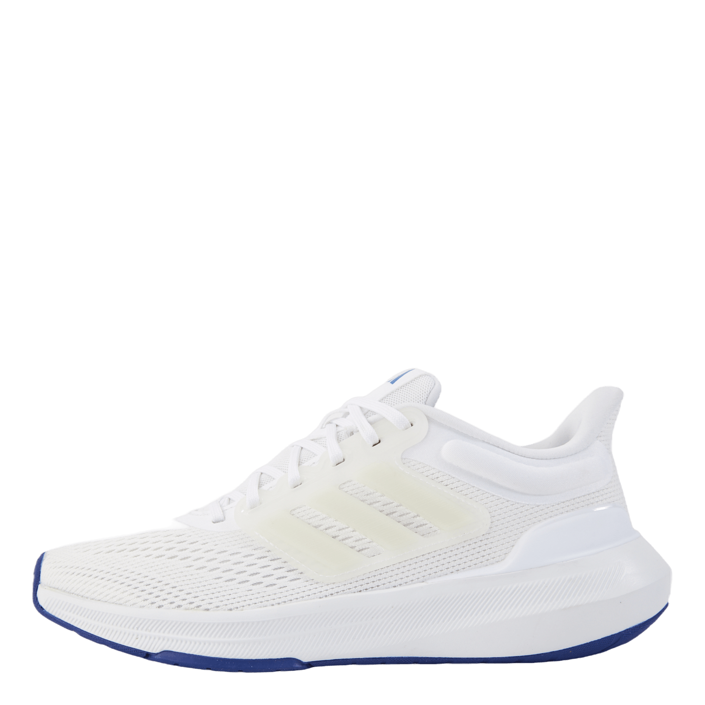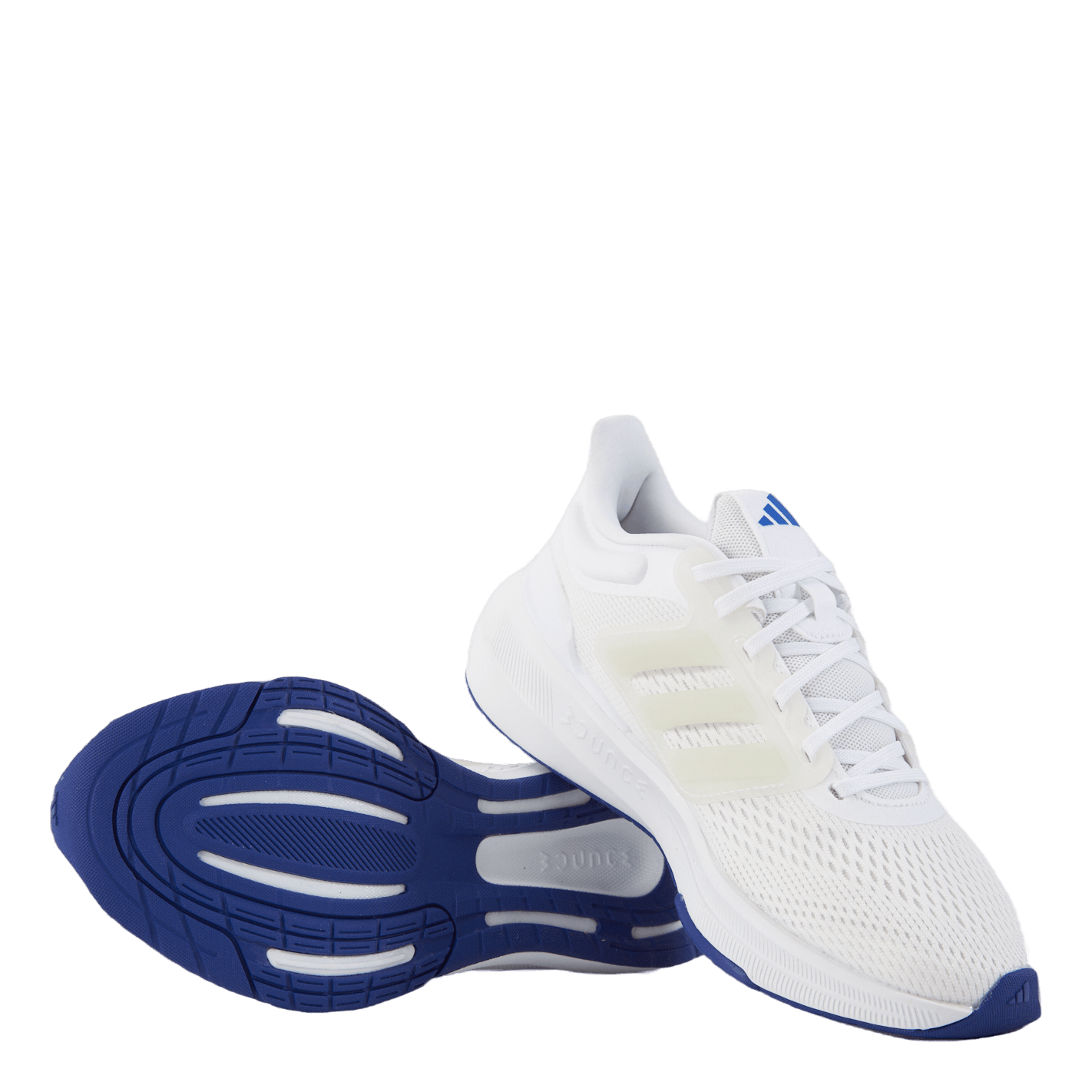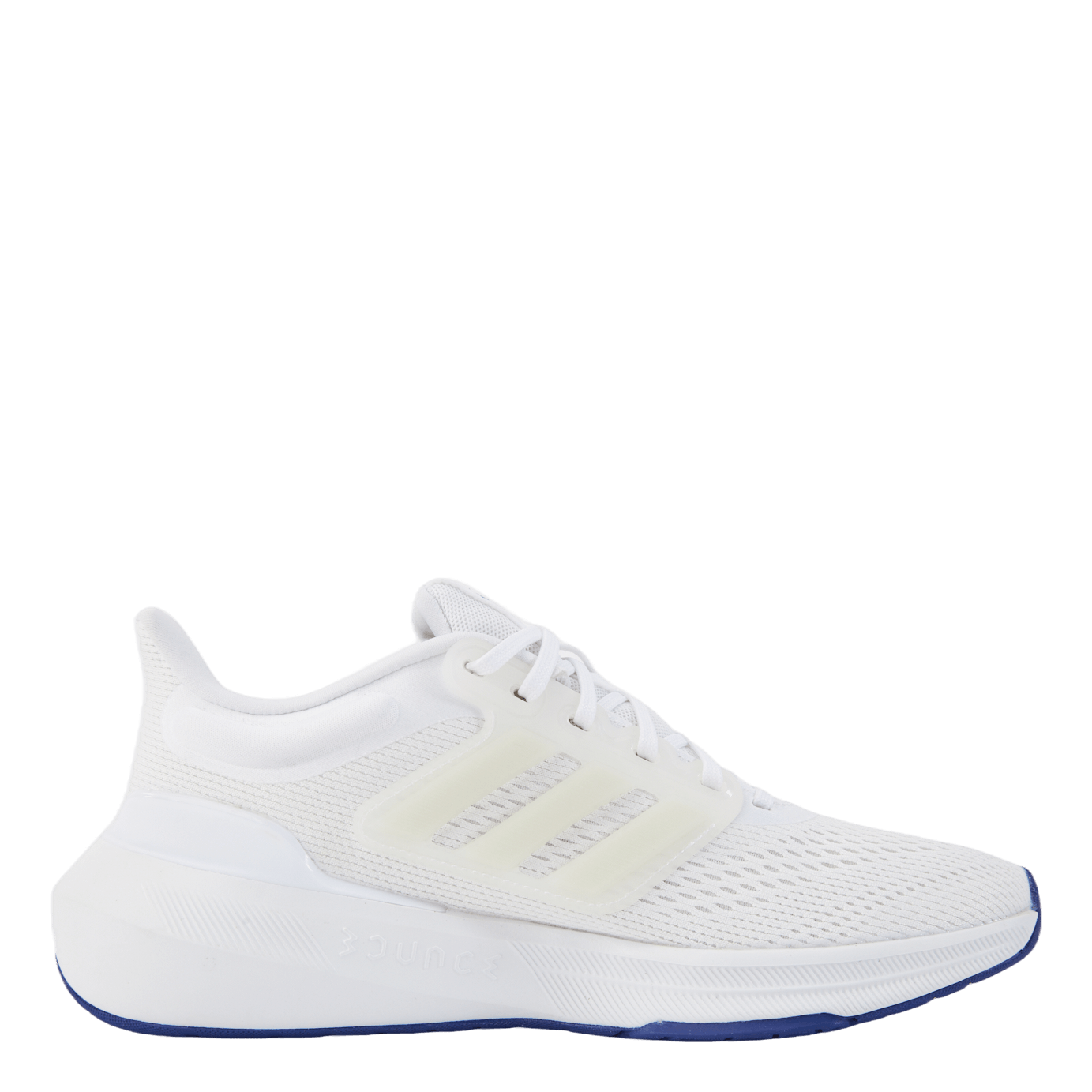 Adidas Ultrabounce Junior shoes combine style and performance for young athletes. Featuring a breathable white mesh upper, lightweight Bounce cushioning, and a non-marking rubber outsole, these shoes offer comfort and grip. The sleek design includes subtle branding and a blue accent on the sole. Made partly with recycled materials, they're eco-friendly and fashion-forward.