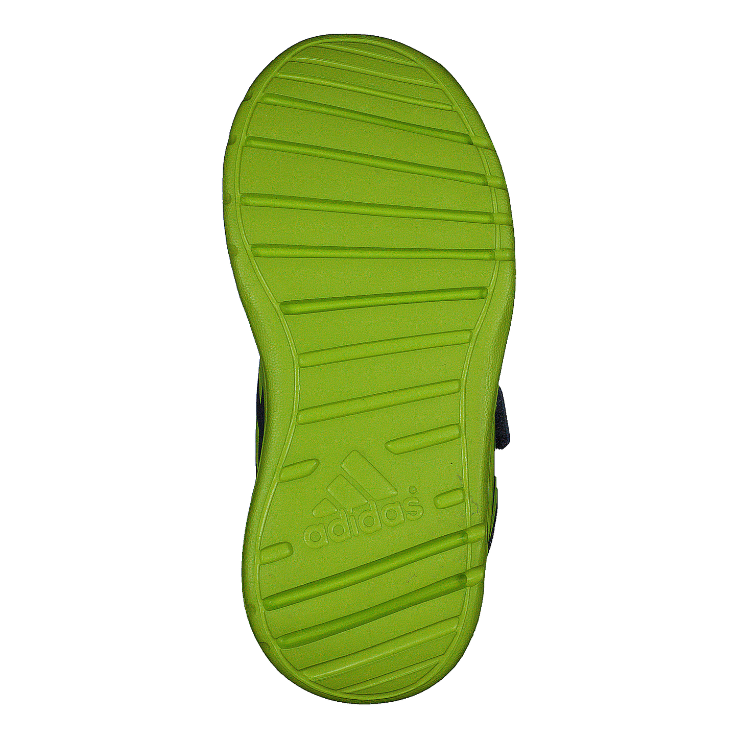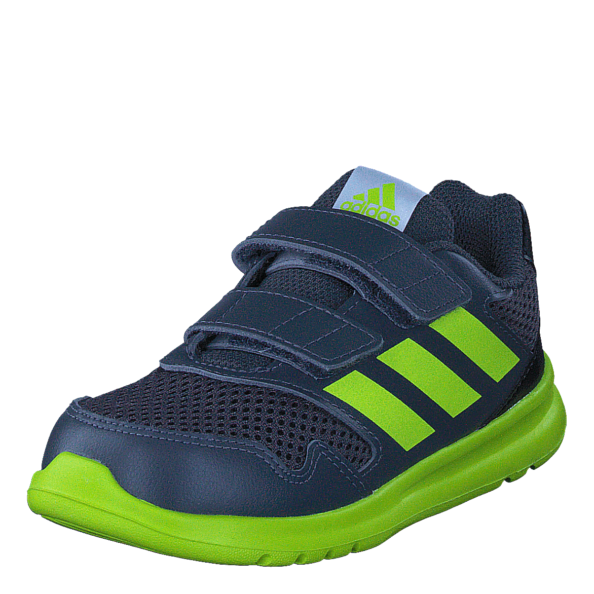 Adidas AltaRun children's athletic shoes feature a dark navy blue upper with vibrant neon green accents. The breathable mesh and synthetic materials offer comfort, while two velcro straps ensure a secure fit. The striking neon green sole contrasts with the upper, creating a dynamic, sporty look. Designed for young, active wearers, these shoes combine style and functionality for energetic kids on the move.