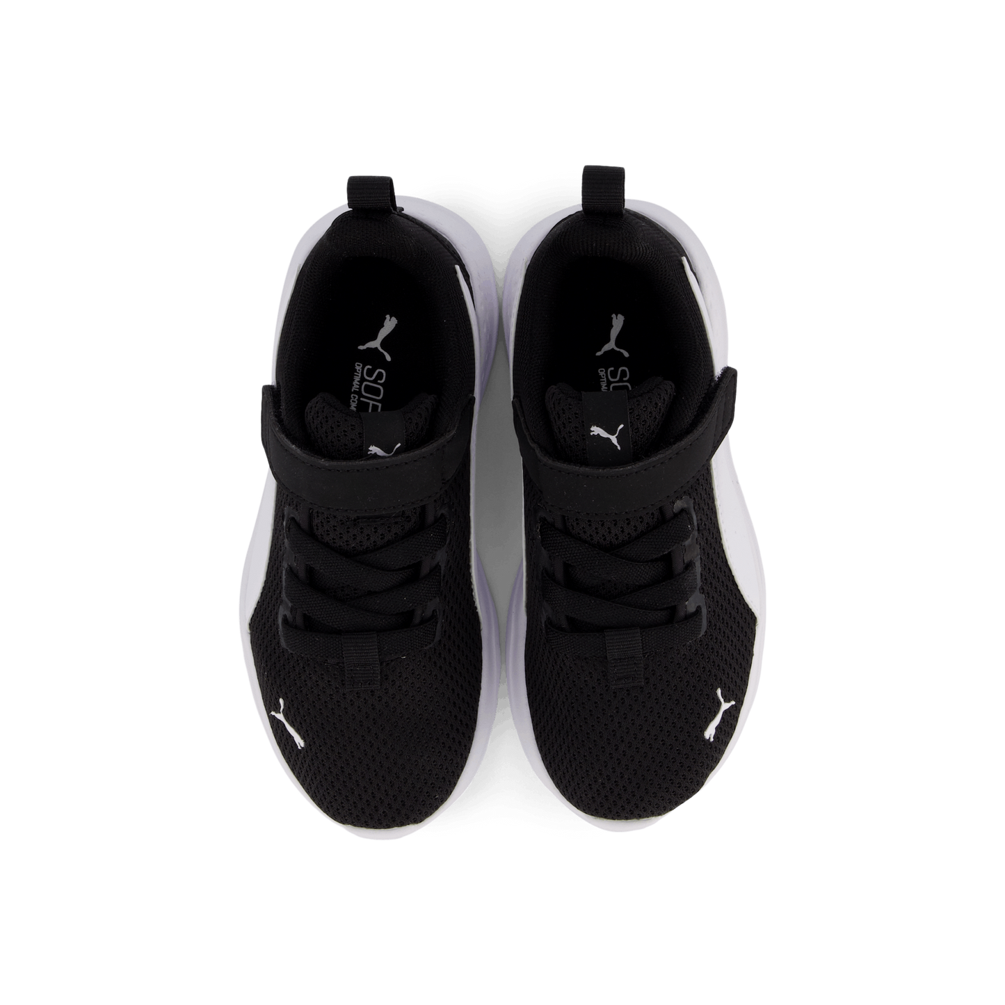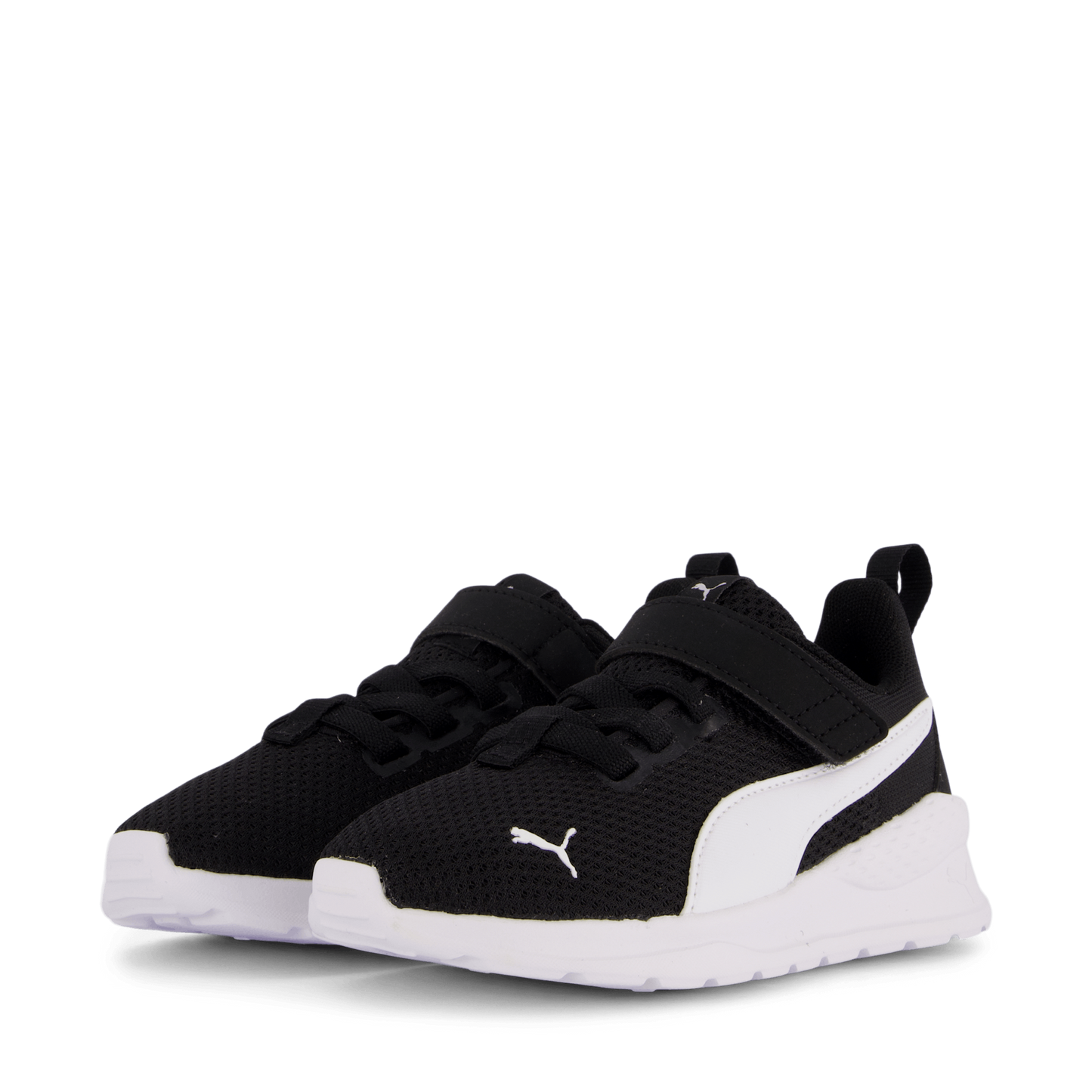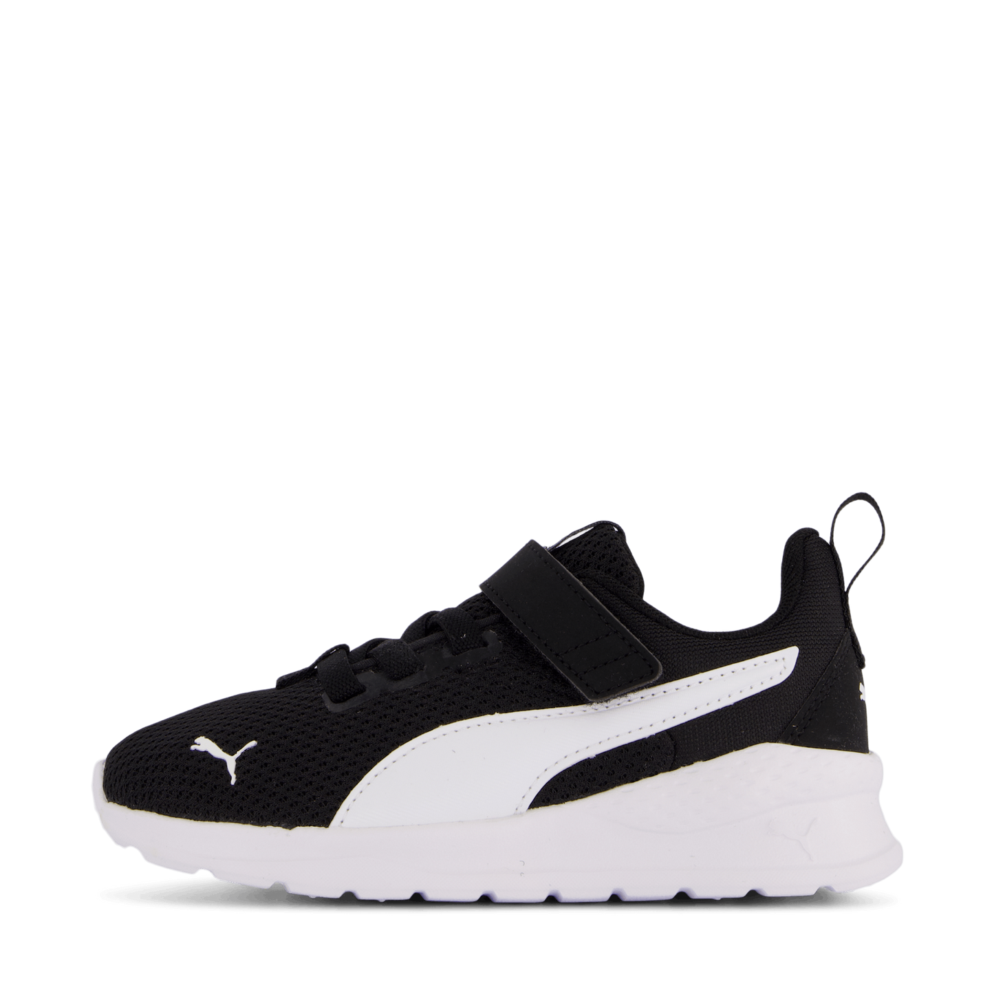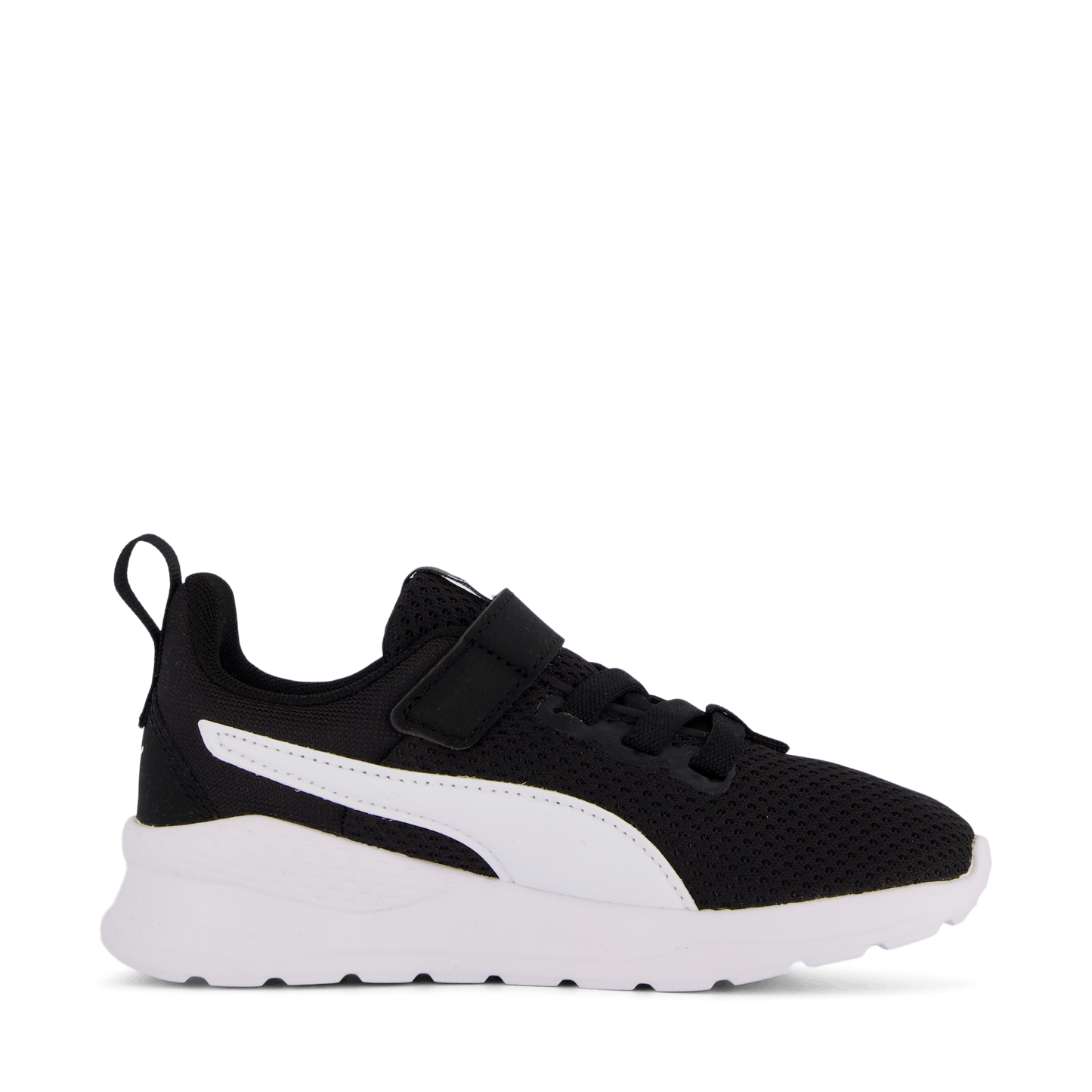 Puma's Anzarun Lite Ac Ps combines style and comfort for young kids aged 4-8. This low-profile athletic shoe features a breathable black mesh upper with a contrasting white Puma Formstrip. The shoe offers easy on/off with laces and a velcro strap, while the SoftFoam+ sockliner and EVA midsole provide cushioning. Perfect for casual wear or light activities.