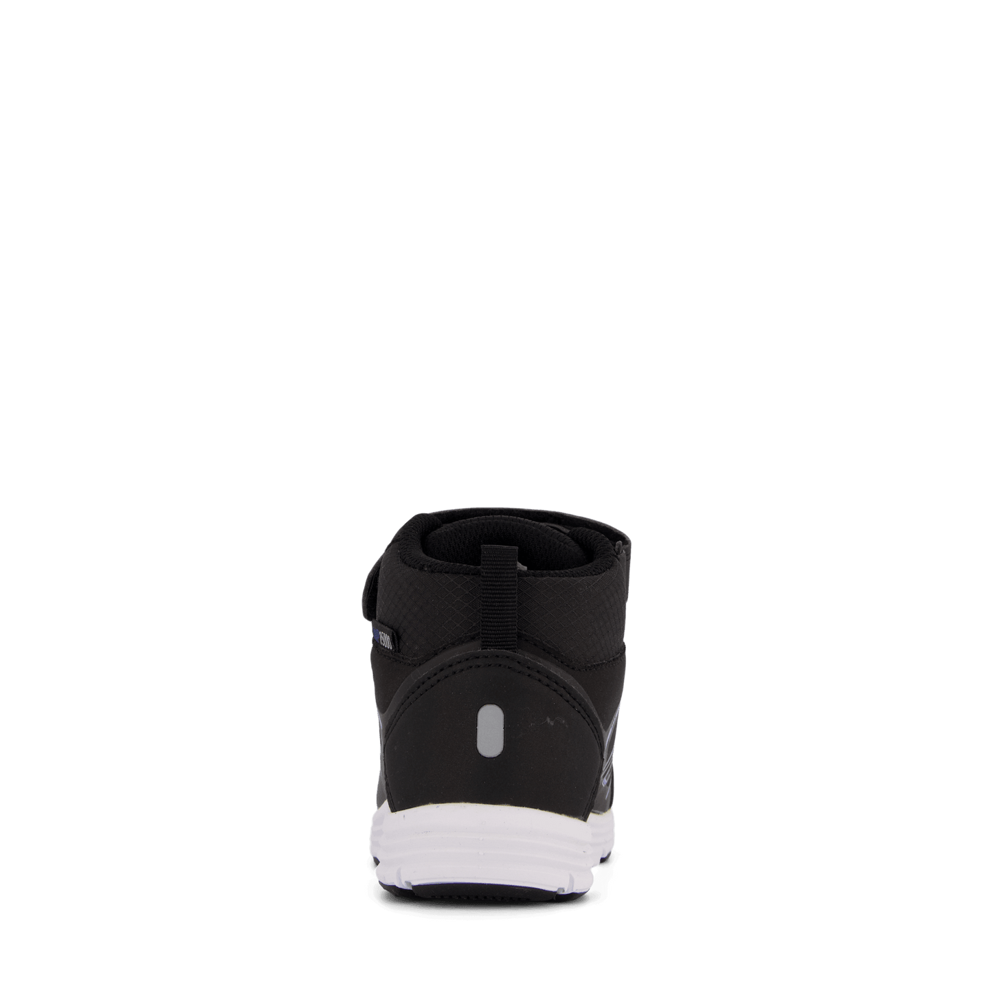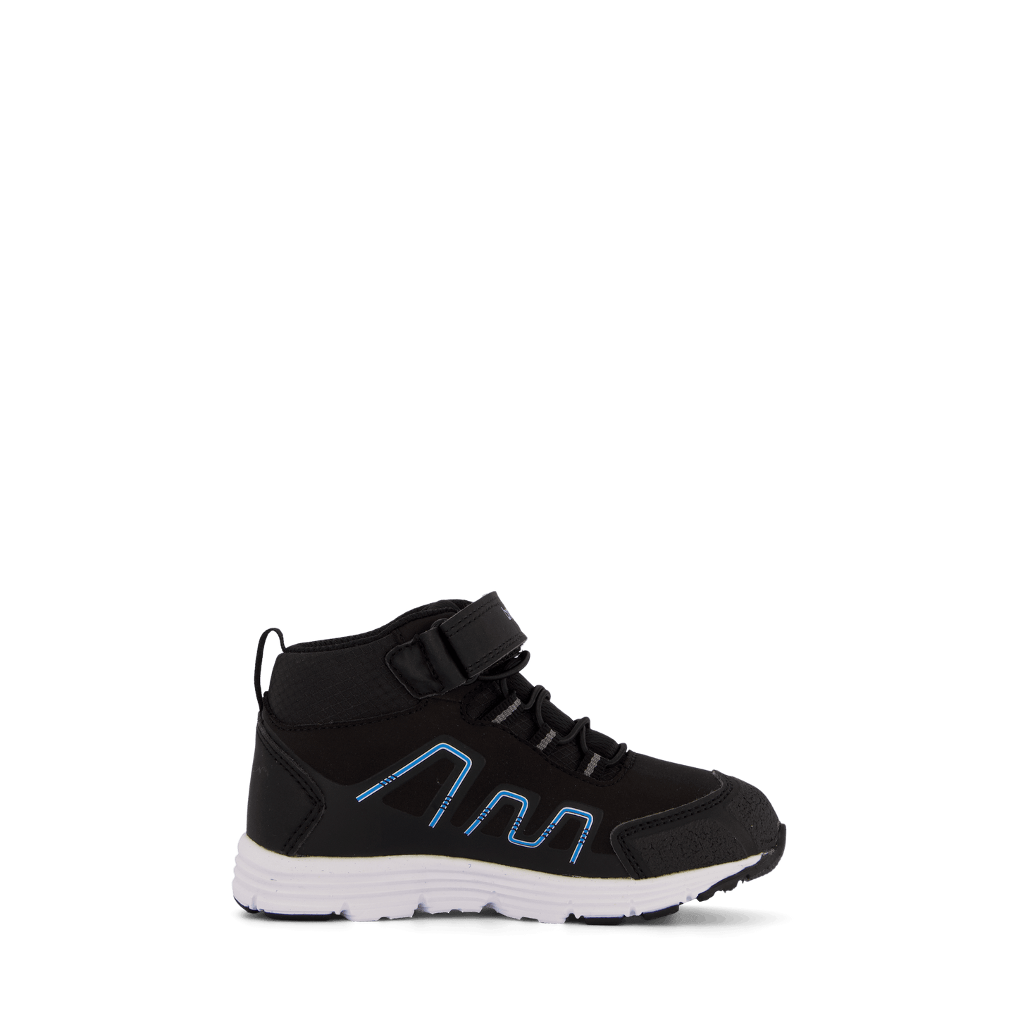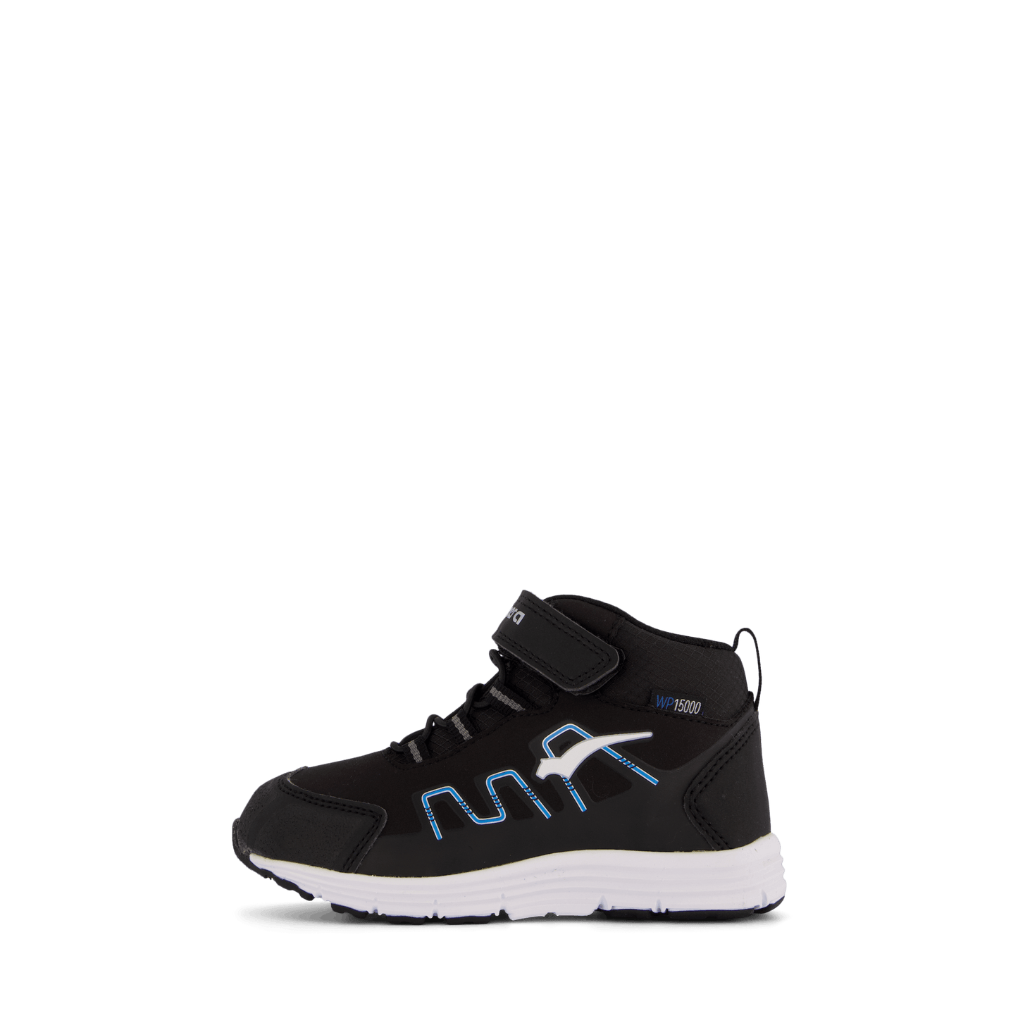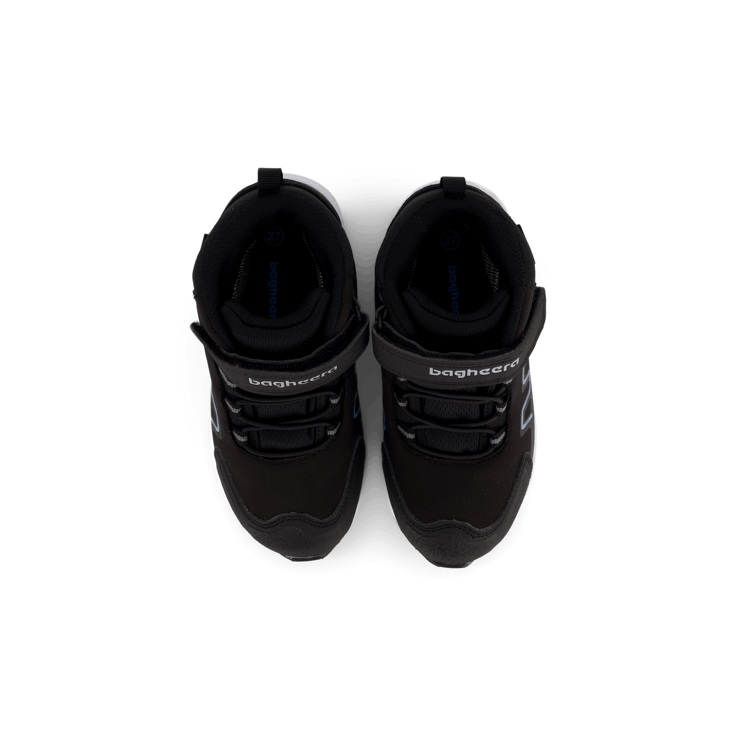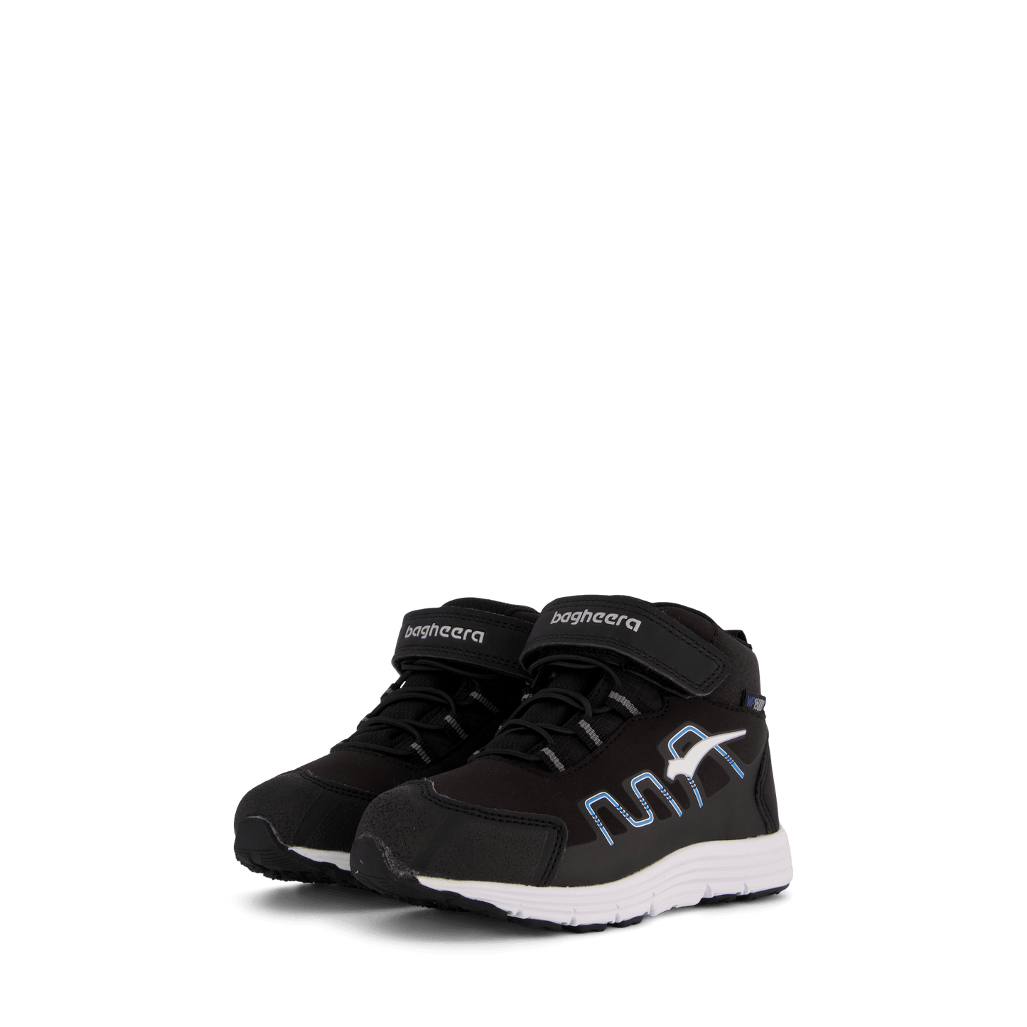 Bagheera's Wega Black/turquoise is a high-top athletic shoe designed for active children. Featuring a durable black synthetic upper with vibrant turquoise accents, it combines style and functionality. The shoe offers easy wear with a velcro strap and elastic laces for a secure fit. Its white sole provides contrast, while the sporty design ensures versatility for various activities.