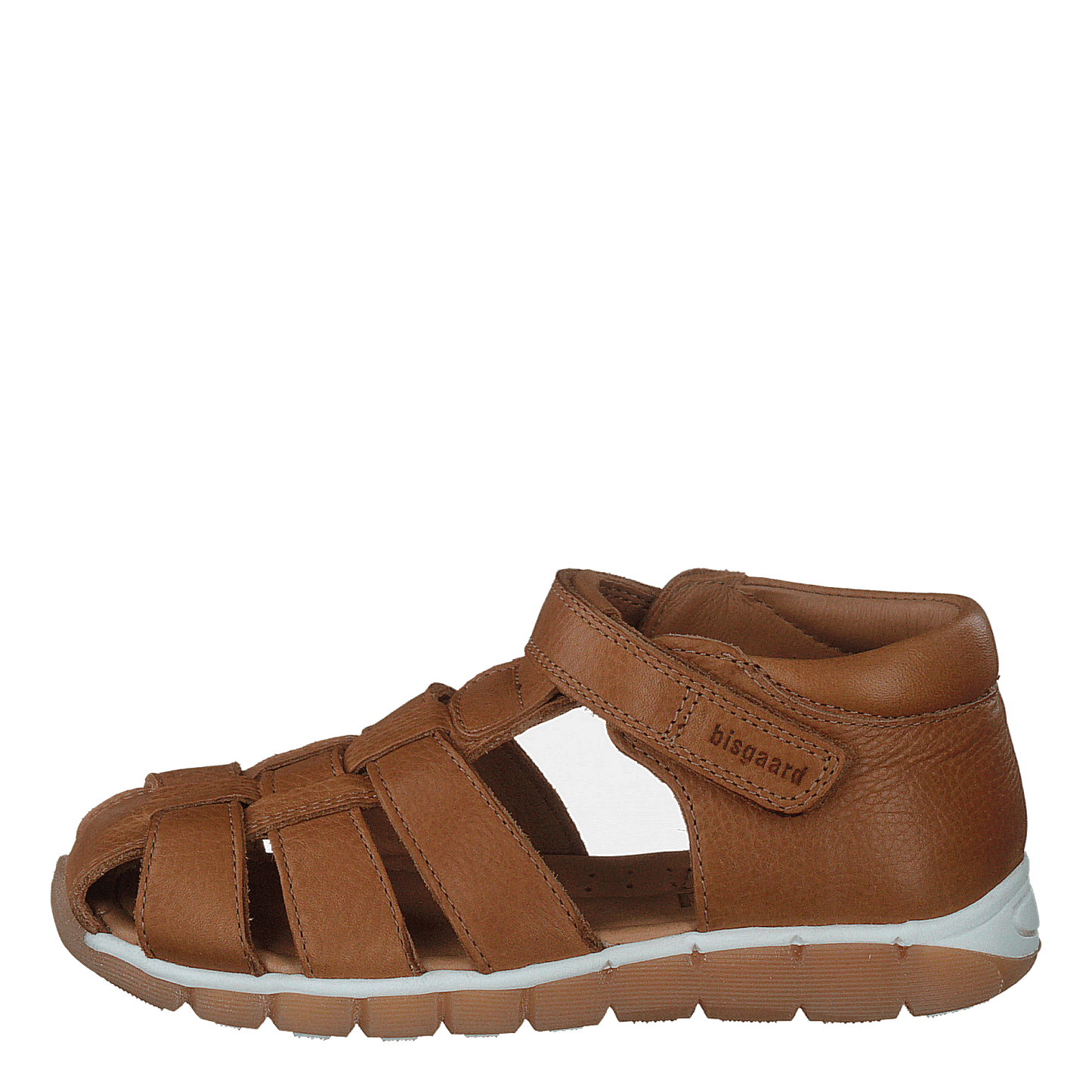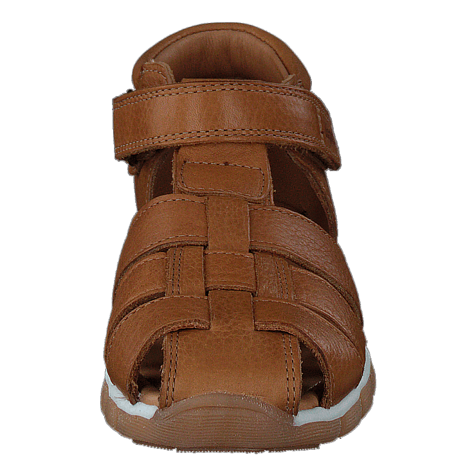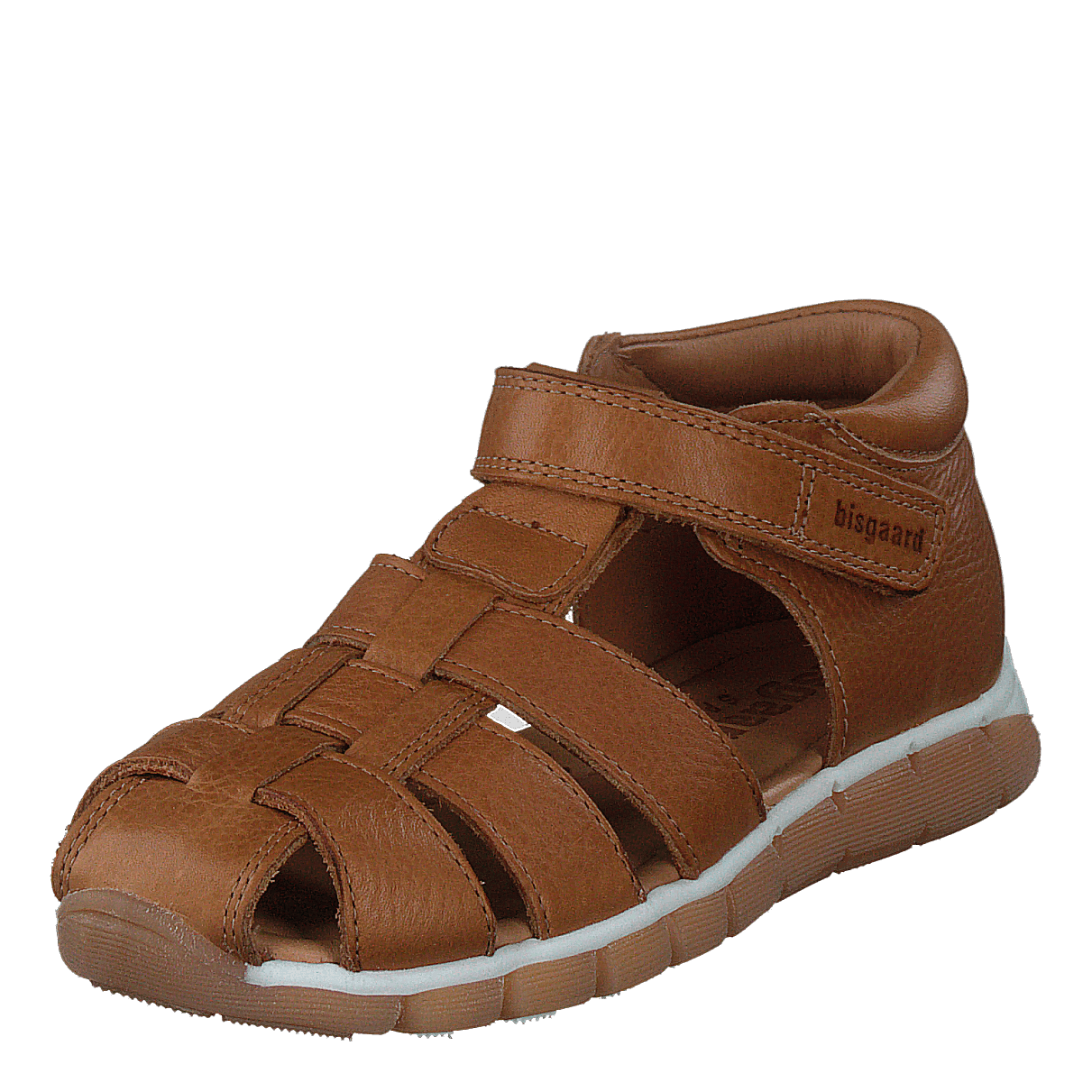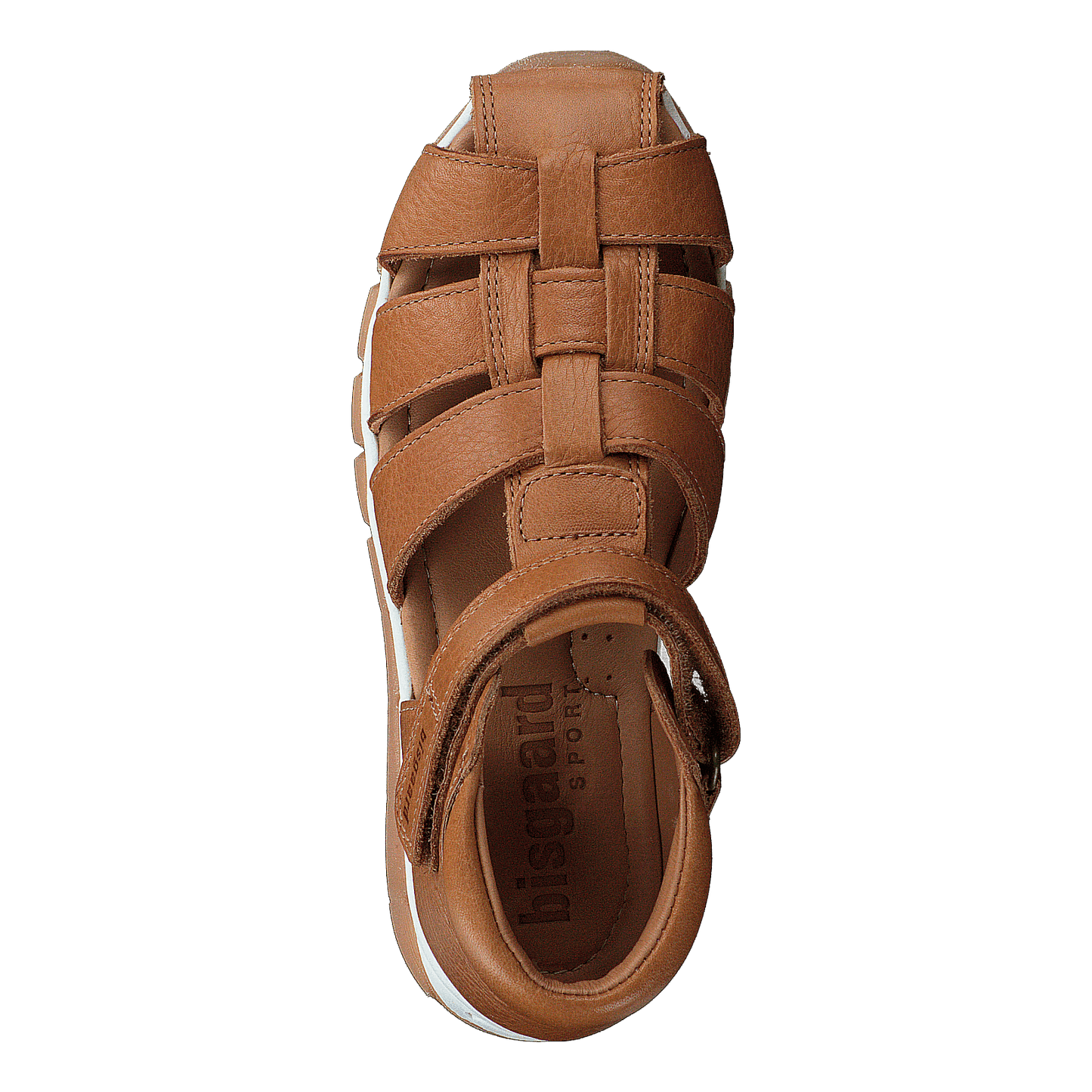 Bisgaard Billie Brandy is a stylish children's sandal crafted from high-quality brown leather. It features a closed-toe design with multiple wide straps, creating a protective cage-like structure. The adjustable velcro closure ensures easy wearing, while the soft insole and rubber outsole provide comfort and good traction. This versatile sandal blends classic and modern elements, suitable for various occasions.