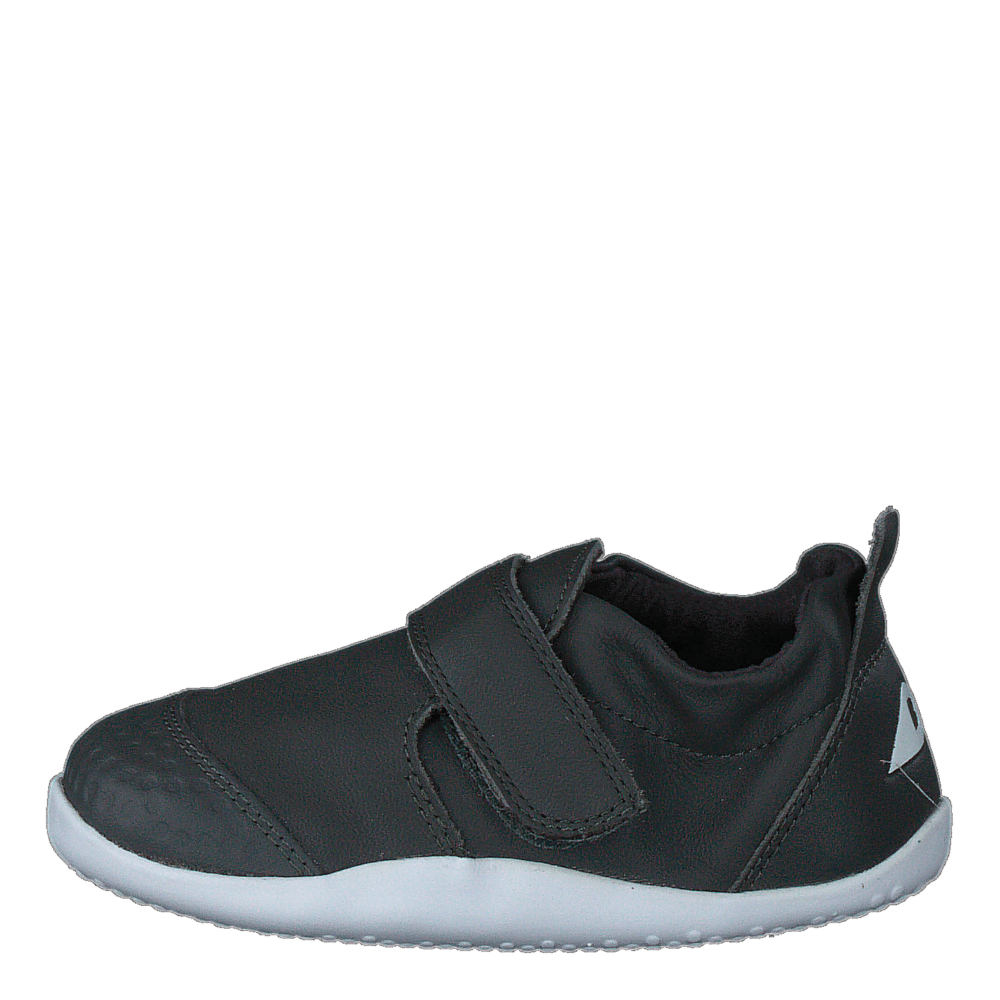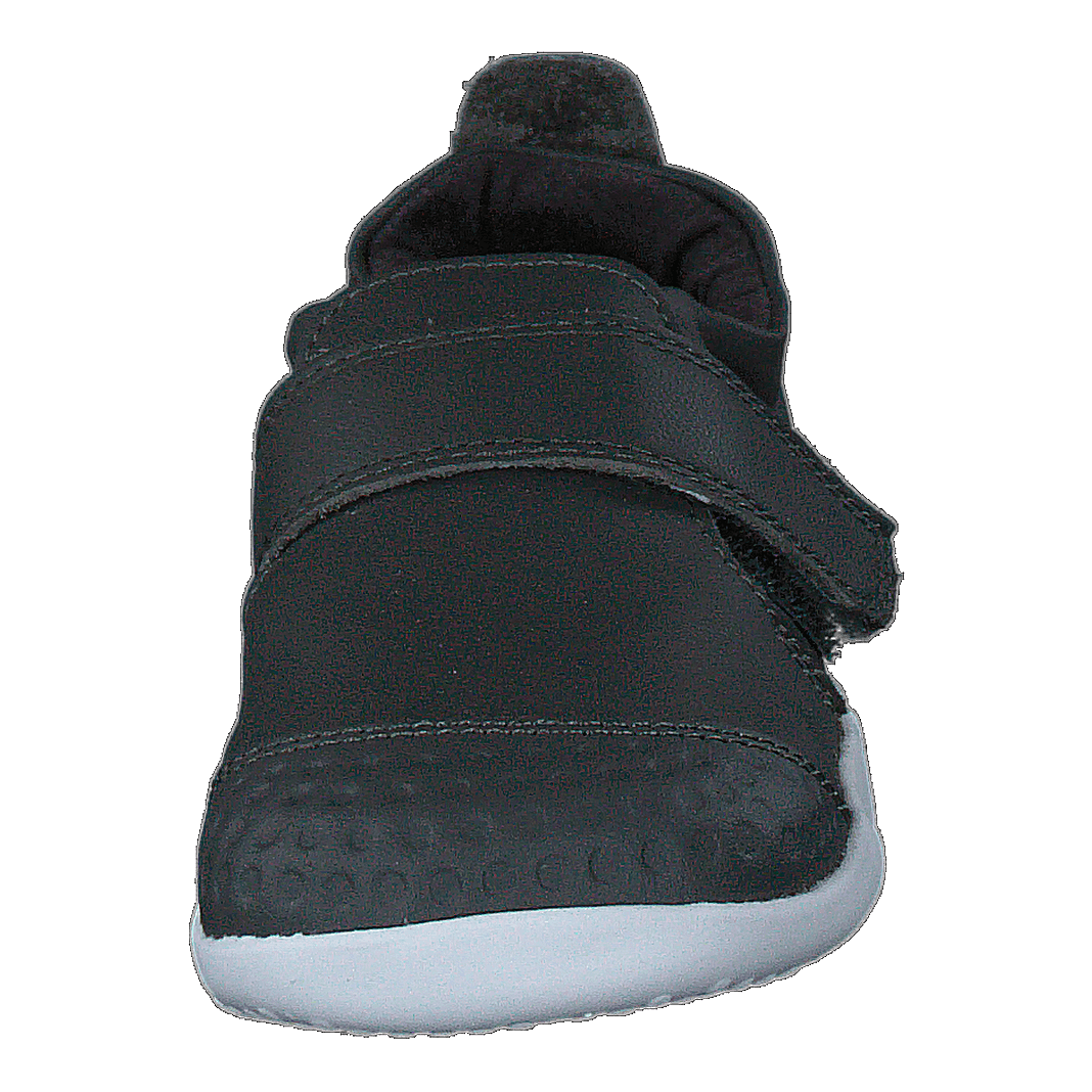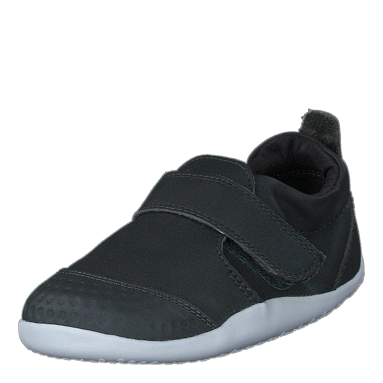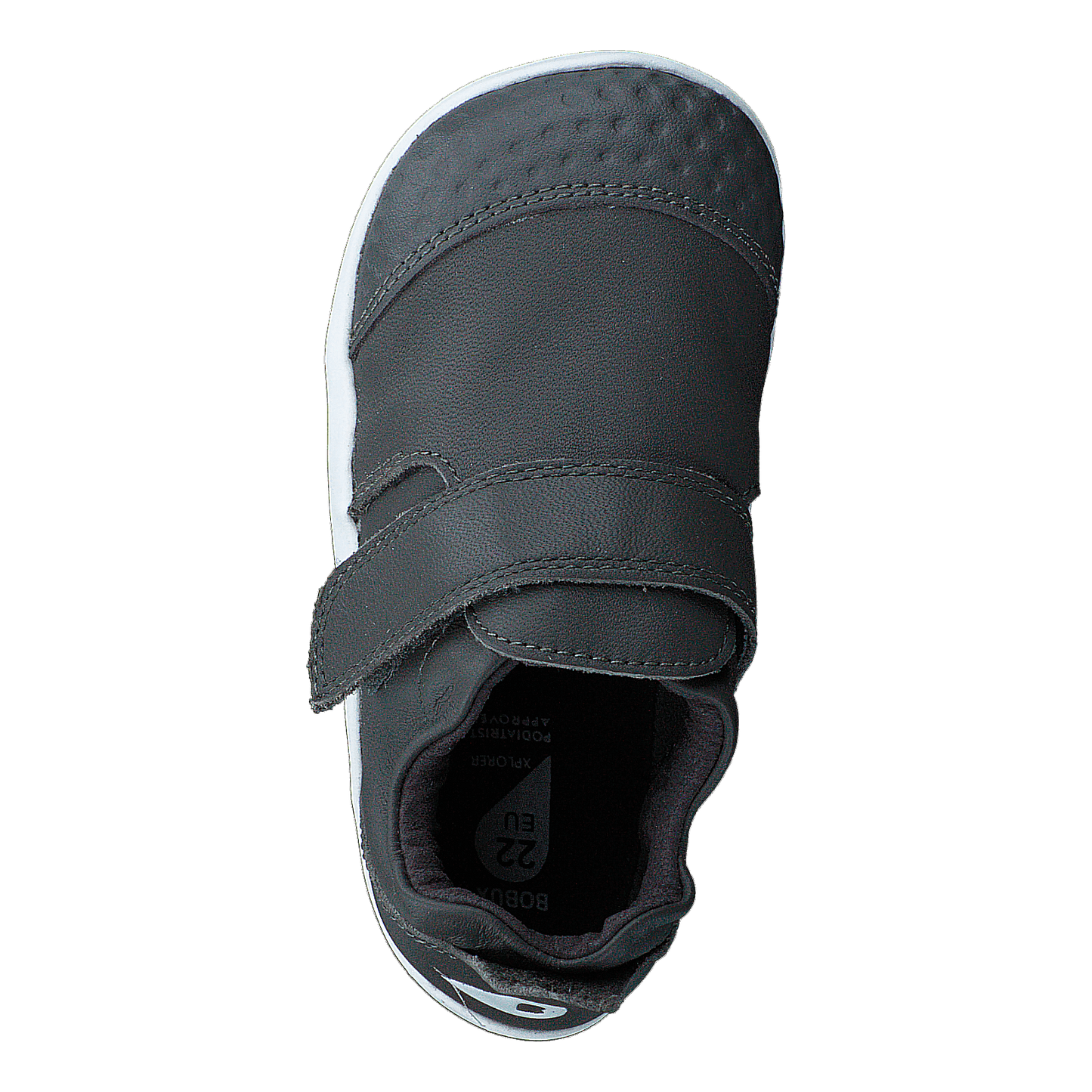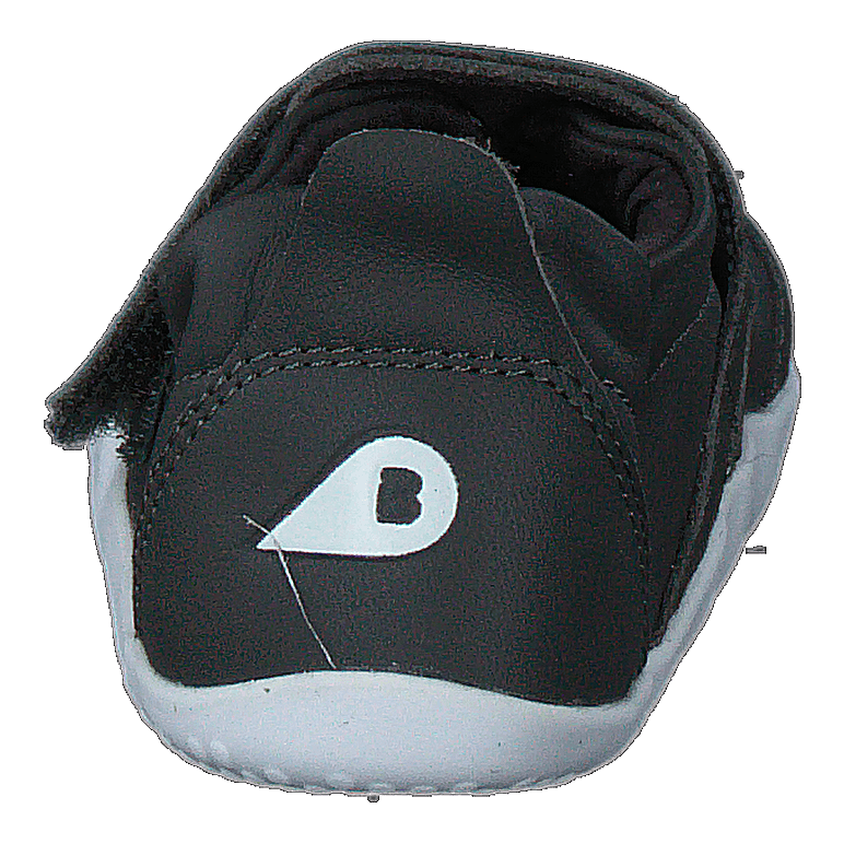 Sleek and modern, this black children's shoe by Bobux combines style with practicality. Featuring a smooth, leather-like upper and a contrasting white sole, the Go Smoke boasts a single velcro strap for easy adjustment. Its slip-on design with an elasticated opening ensures comfort and convenience for active little feet. The minimalist aesthetic makes it perfect for everyday wear or light activities.