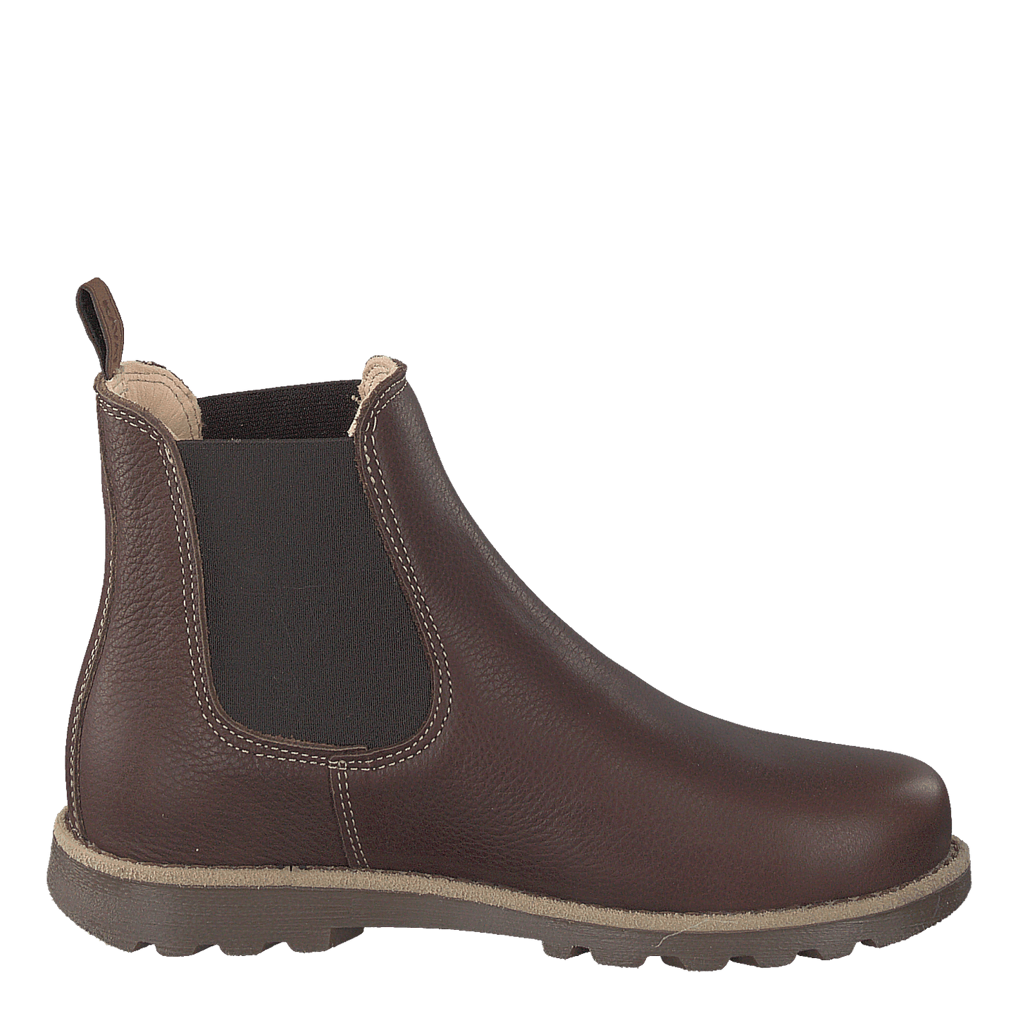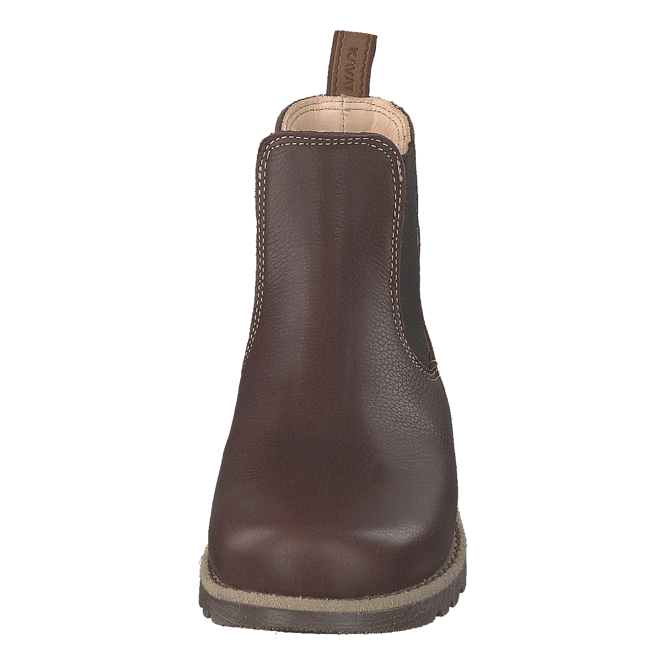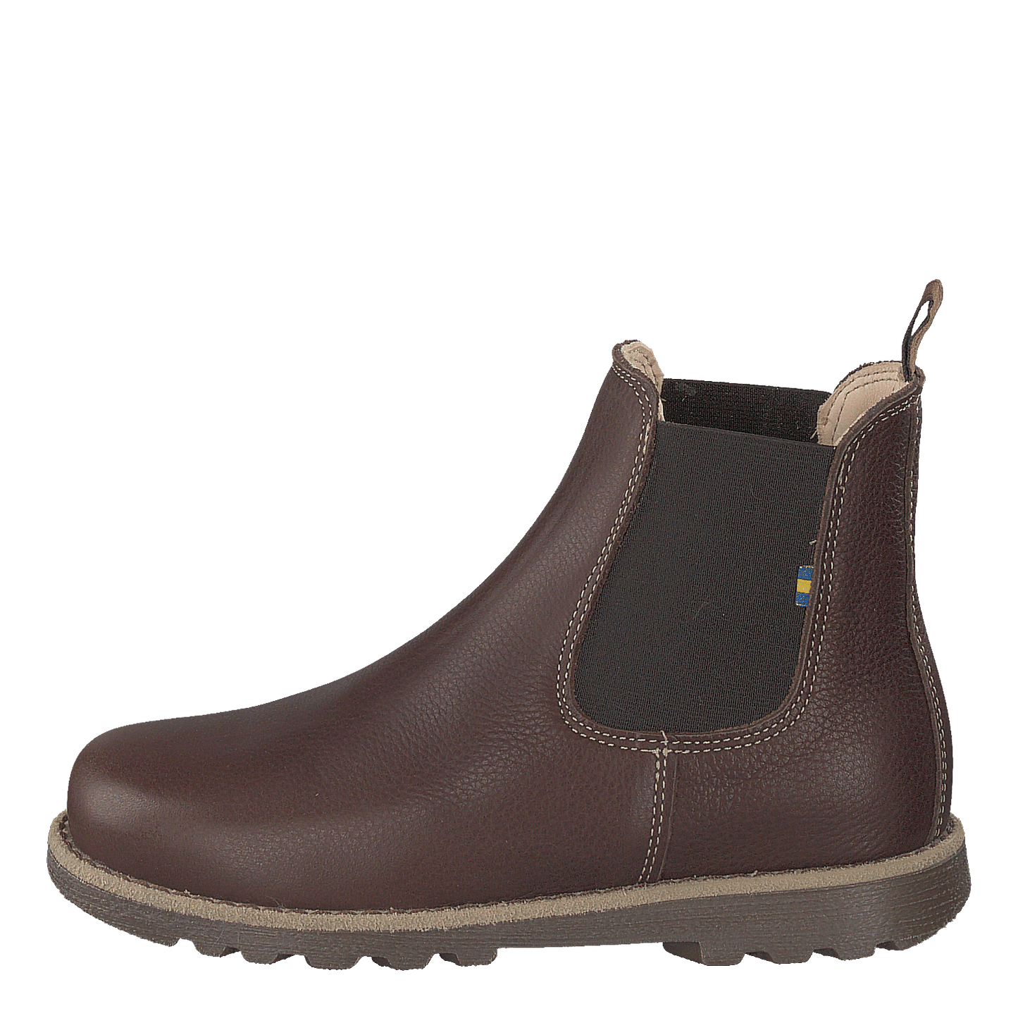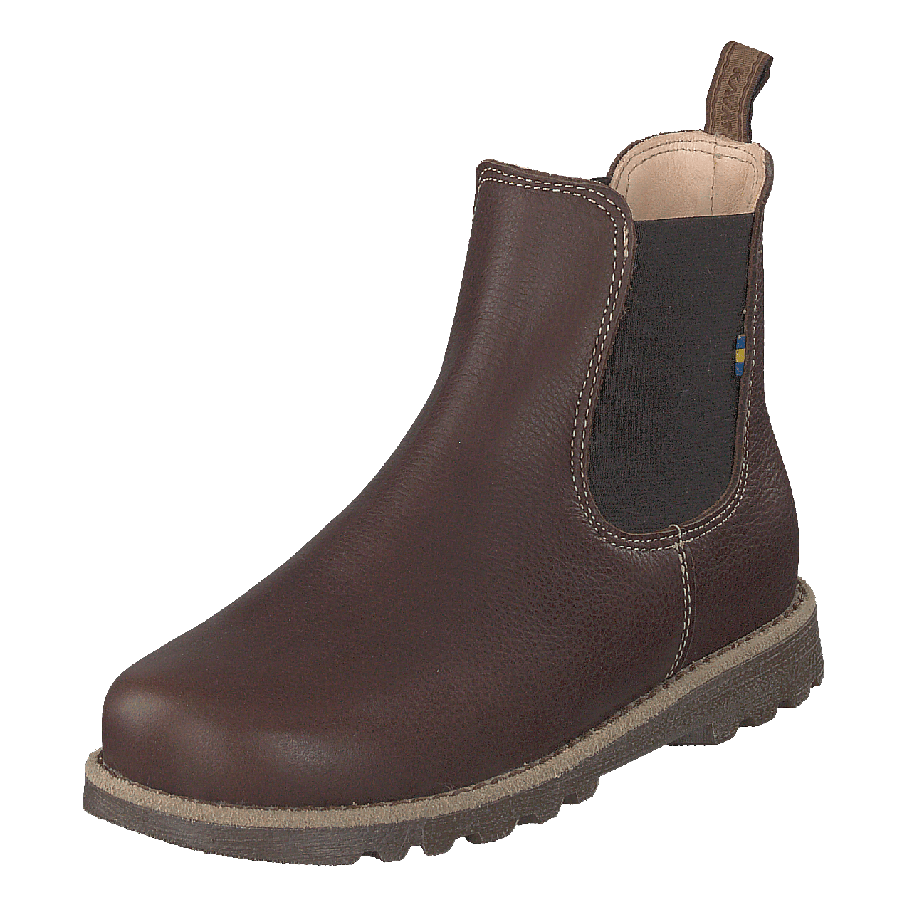 Elevate your child's style with Kavat's Bodås Jr Ep Chelsea boots in luxurious dark brown leather. These comfortable, slip-on boots feature elastic side panels for easy wear and a durable rubber sole with tread for grip. The classic design, rounded toe, and handcrafted appearance make them versatile for both casual and slightly formal occasions. A pull tab and small flag emblem add functional and stylish touches.