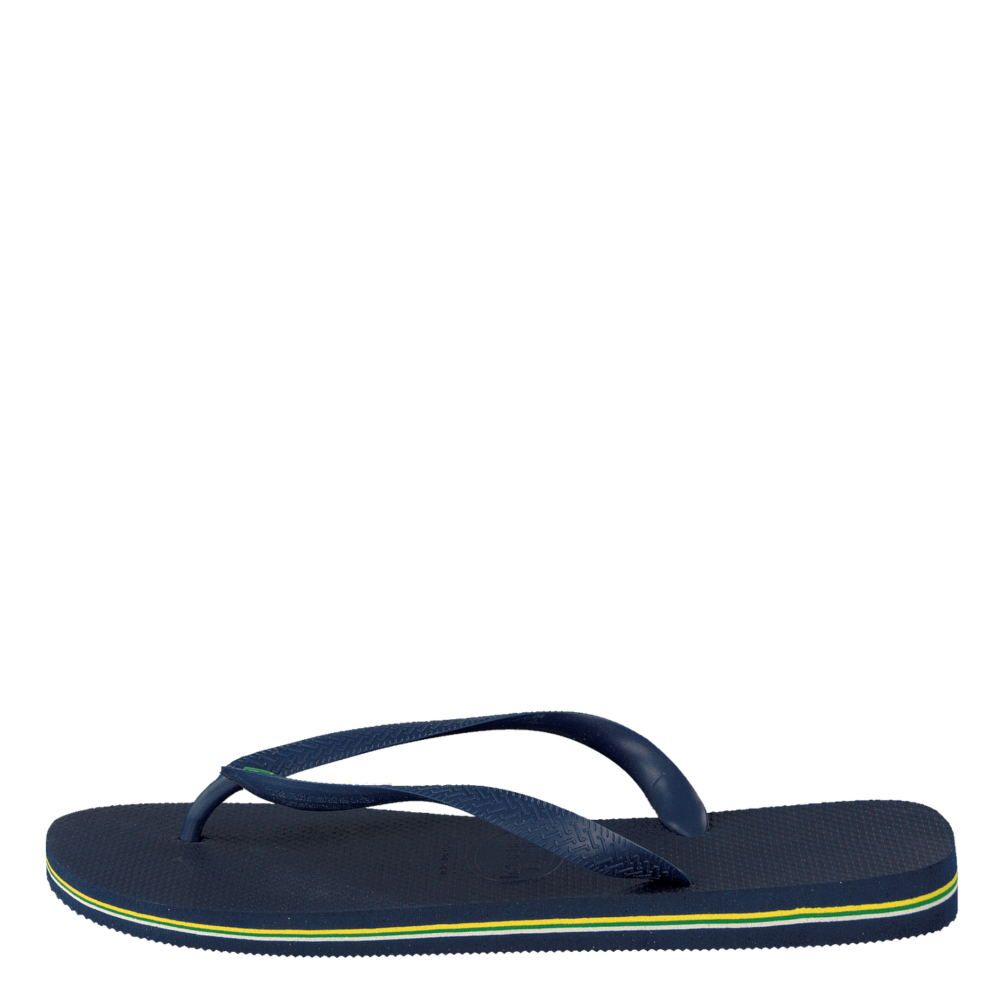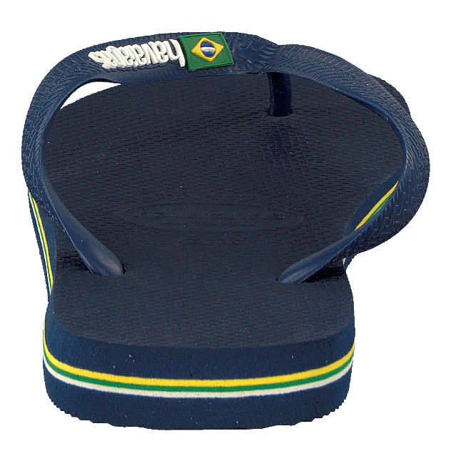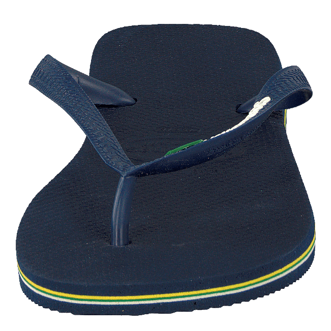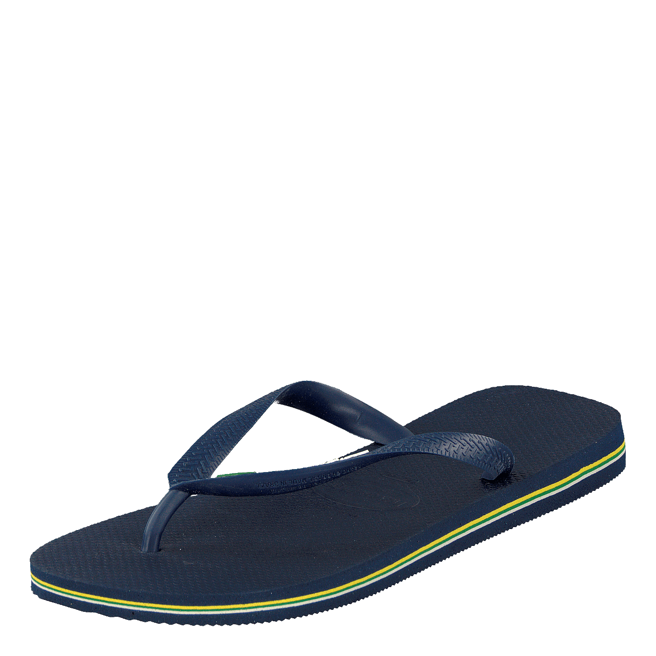 Havaianas' Brasil Logo Navy Blue flip-flops offer classic comfort with a patriotic twist. These navy blue sandals feature a thick, textured rubber sole for durability and grip, complemented by a sleek, matching strap. The standout detail is a subtle Brazilian flag-inspired stripe along the sole's edge, adding a touch of national pride to this minimalist, beach-ready design.