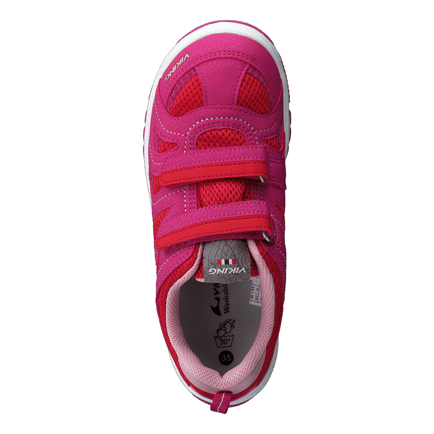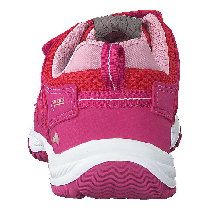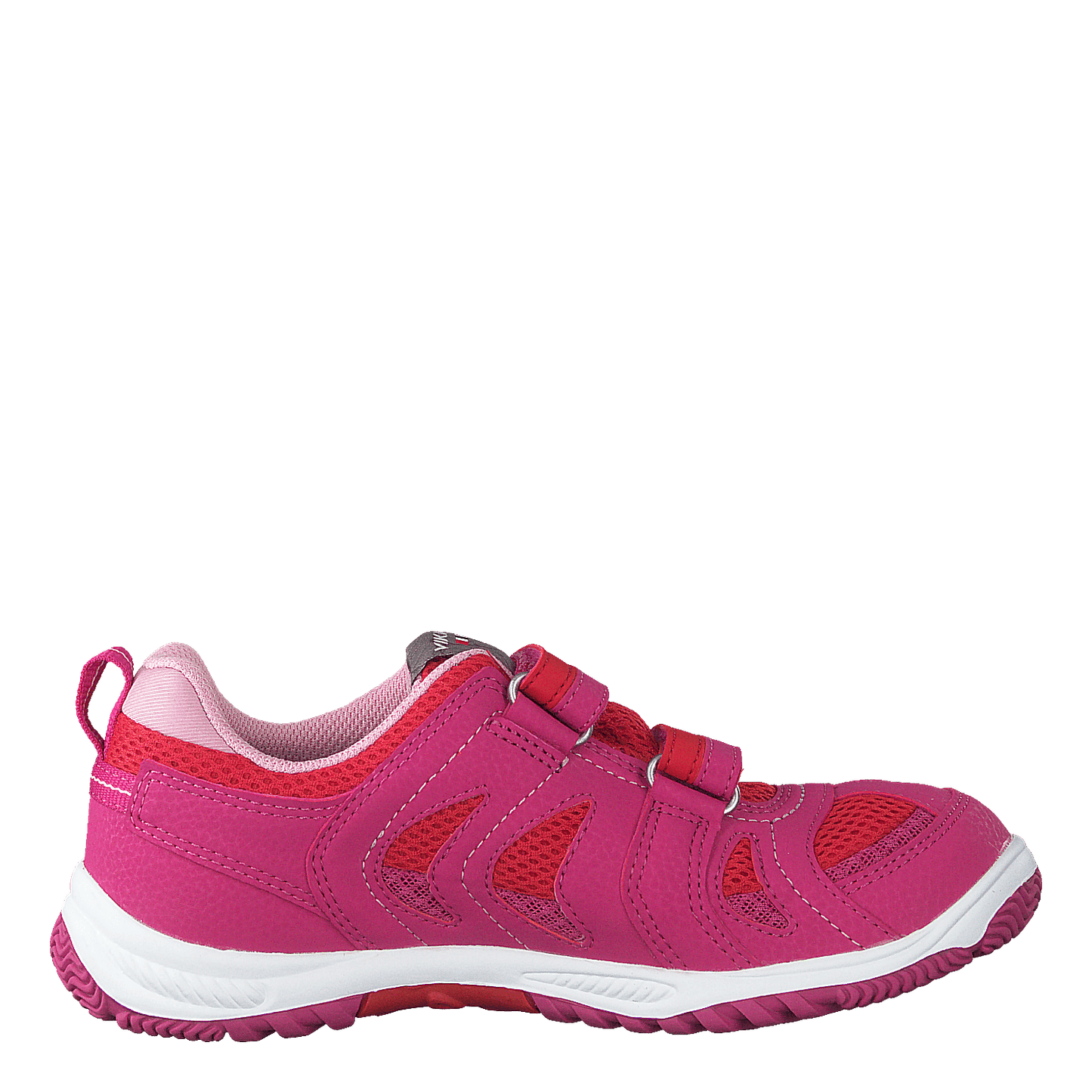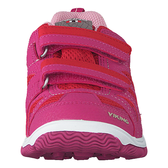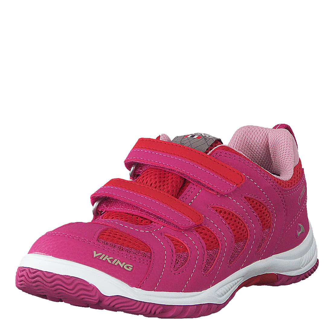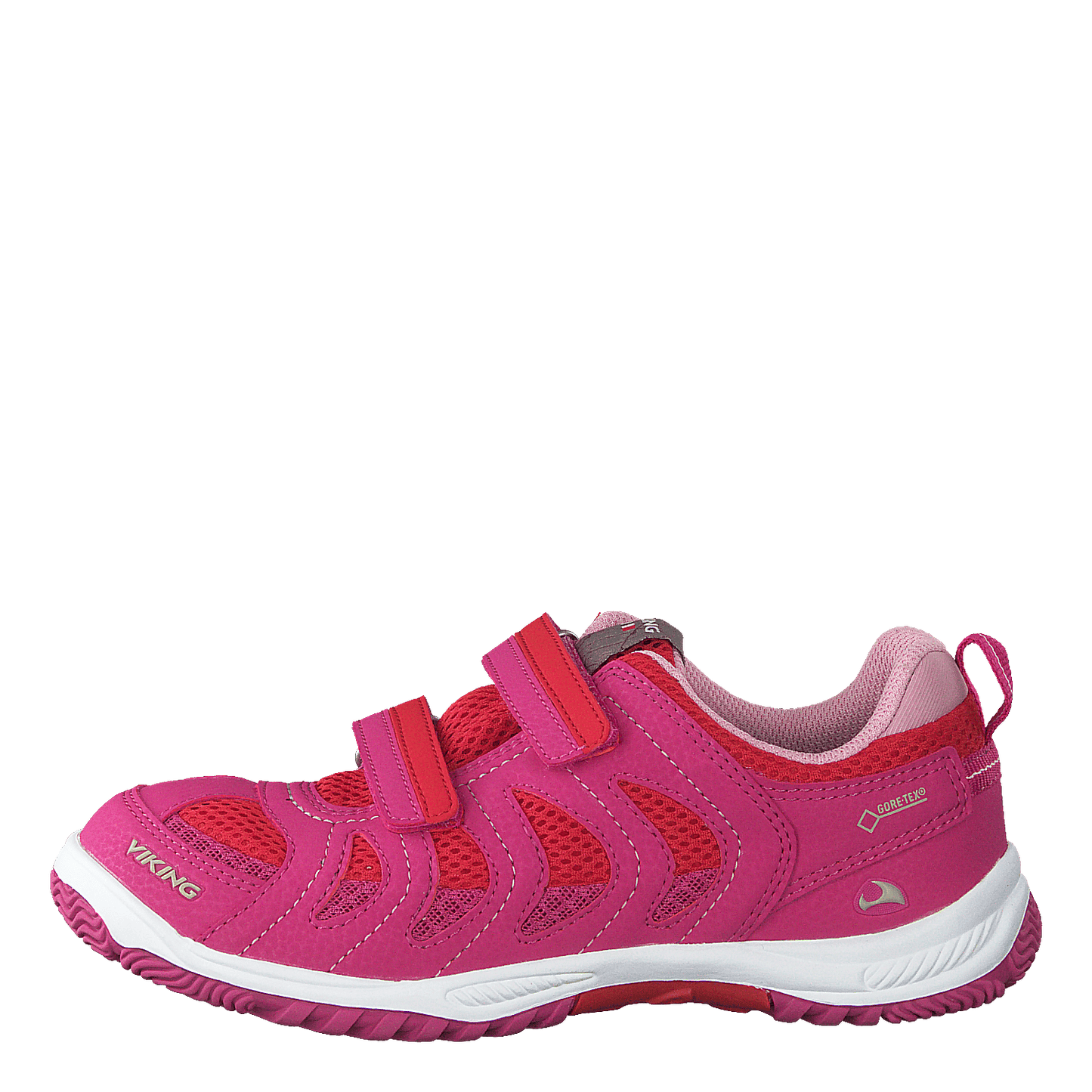 Viking's Cascade II Magenta/red is a durable, waterproof children's shoe designed for active kids. Featuring a vibrant magenta and red mesh upper with PU reinforcements, GORE-TEX® membrane for breathability, and two easy-adjust Velcro straps. The heavily patterned rubber sole provides excellent grip, while the reinforced last ensures stability and comfort for all-weather adventures.