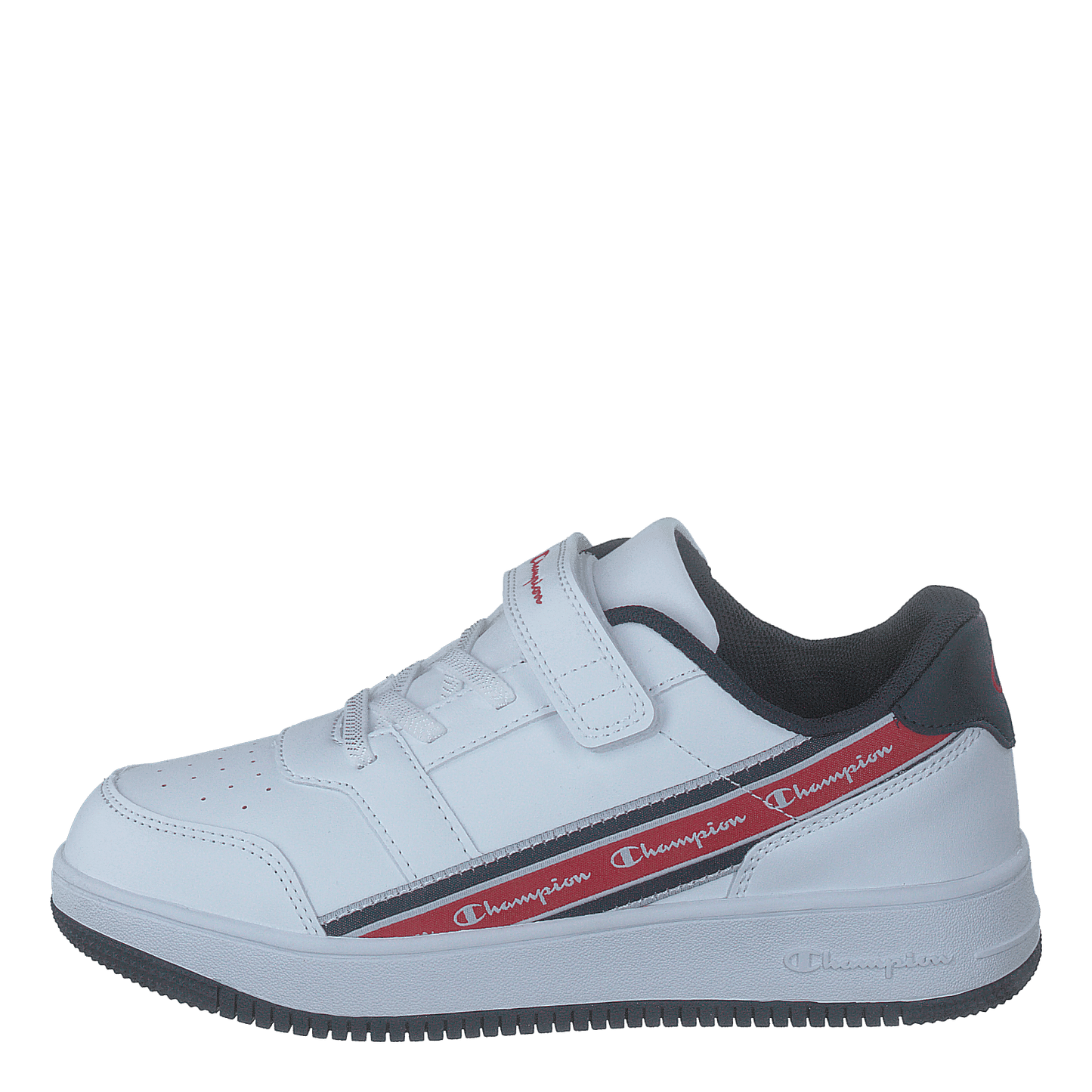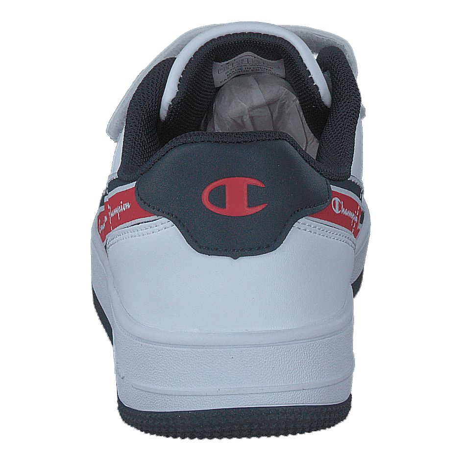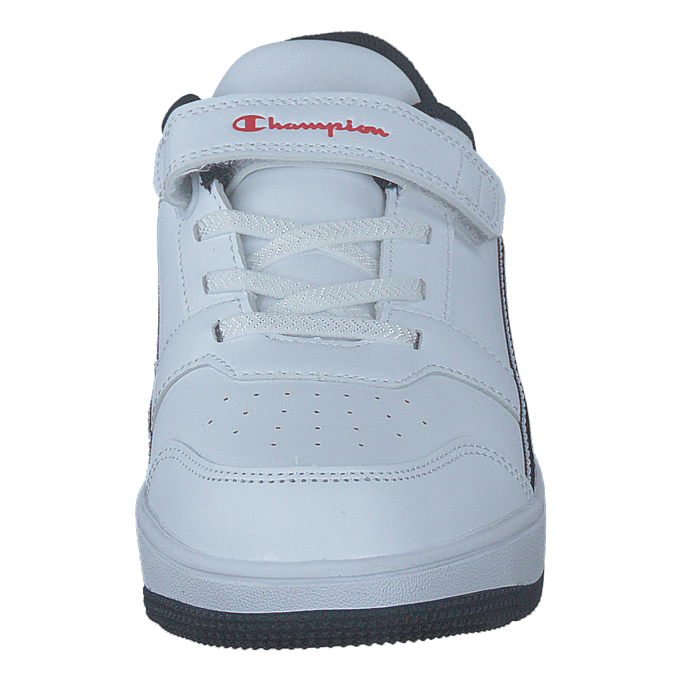 Champion's Alter Low B Ps White A is a sleek, low-top sneaker designed for easy wear. Featuring a predominantly white leather-like upper with a convenient velcro strap, it offers both style and practicality. The chunky white sole provides sturdy support, while the distinctive side stripe with Champion branding adds a sporty touch to this modern, casual footwear.