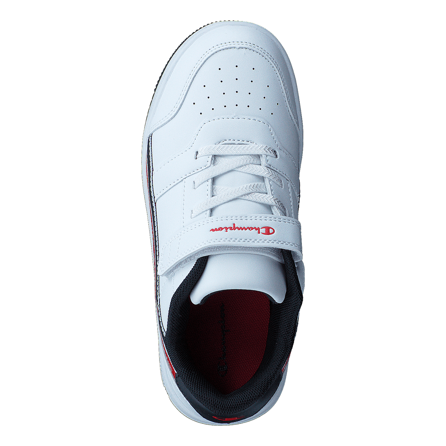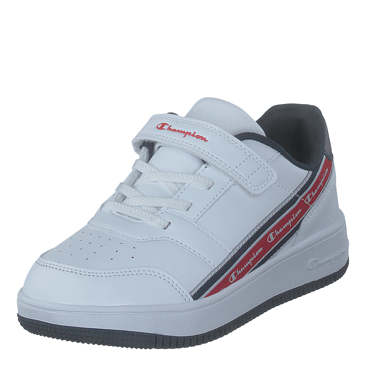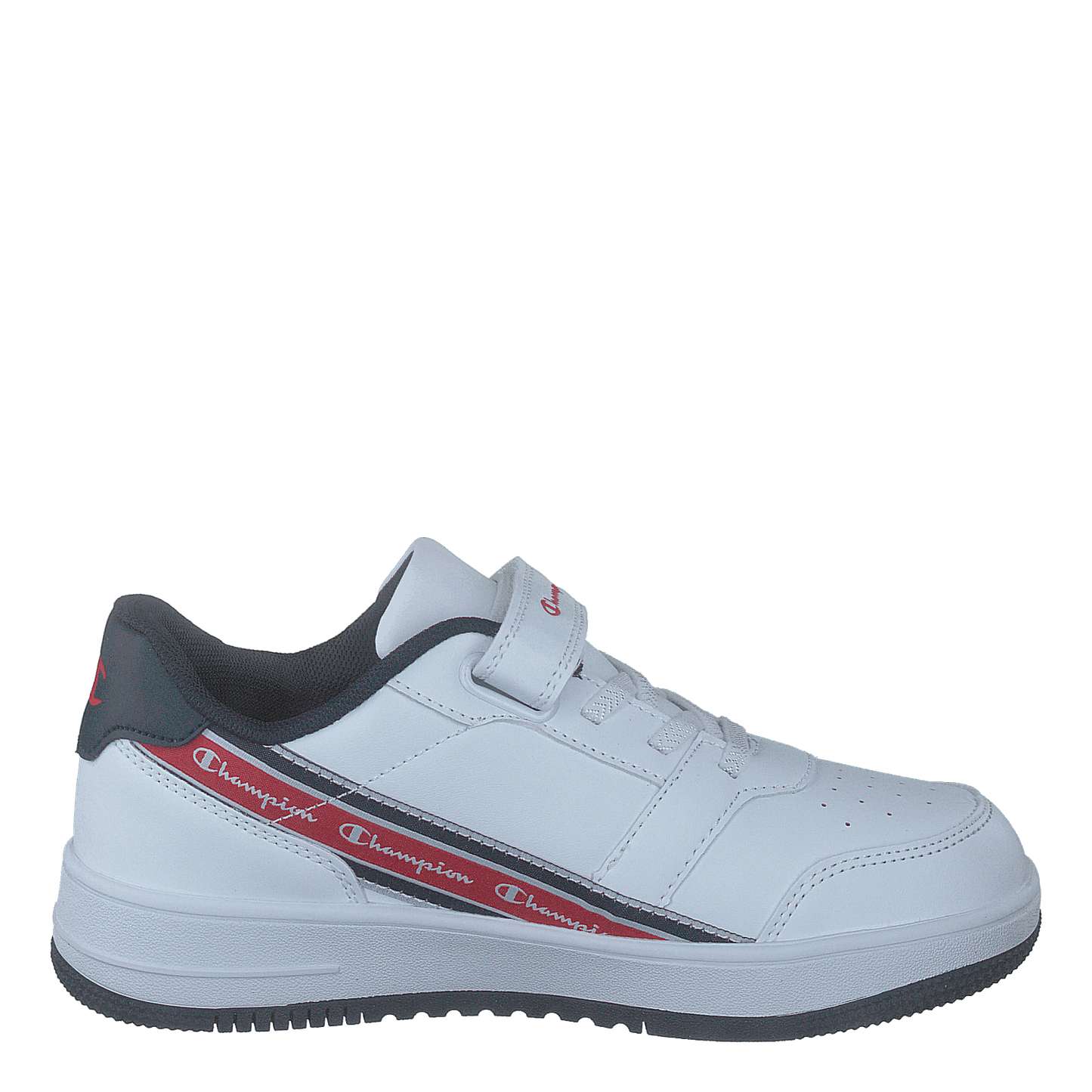 Champion's Alter Low B Ps White A is a sleek, low-top sneaker designed for easy wear. Featuring a predominantly white leather-like upper with a convenient velcro strap, it offers both style and practicality. The chunky white sole provides sturdy support, while the distinctive side stripe with Champion branding adds a sporty touch to this modern, casual footwear.