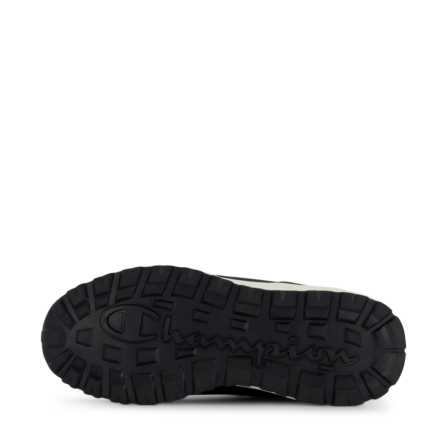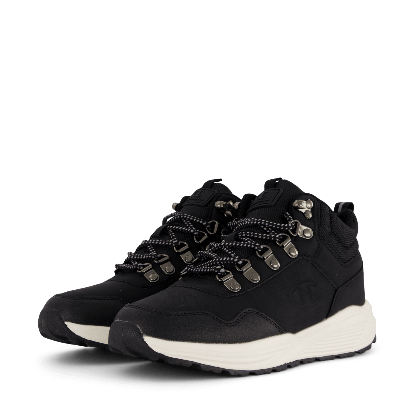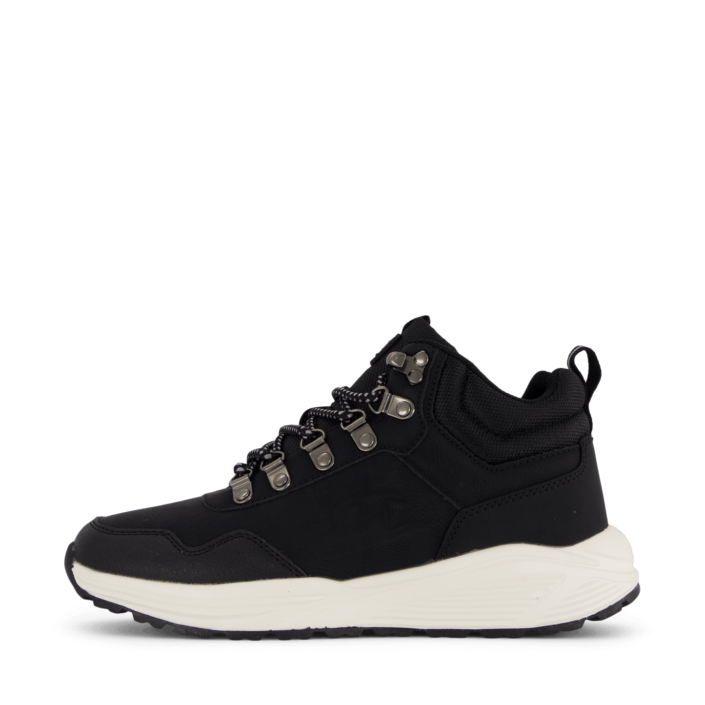 Champion's Mid Cut Shoe Climb Rx Mid B Gs in Black Beauty combines style and functionality. This sleek, black sneaker features a durable synthetic upper, lace-up closure with metal eyelets, and a padded ankle collar for support. The contrasting off-white sole provides a striking look, making it suitable for both urban wear and light outdoor activities.