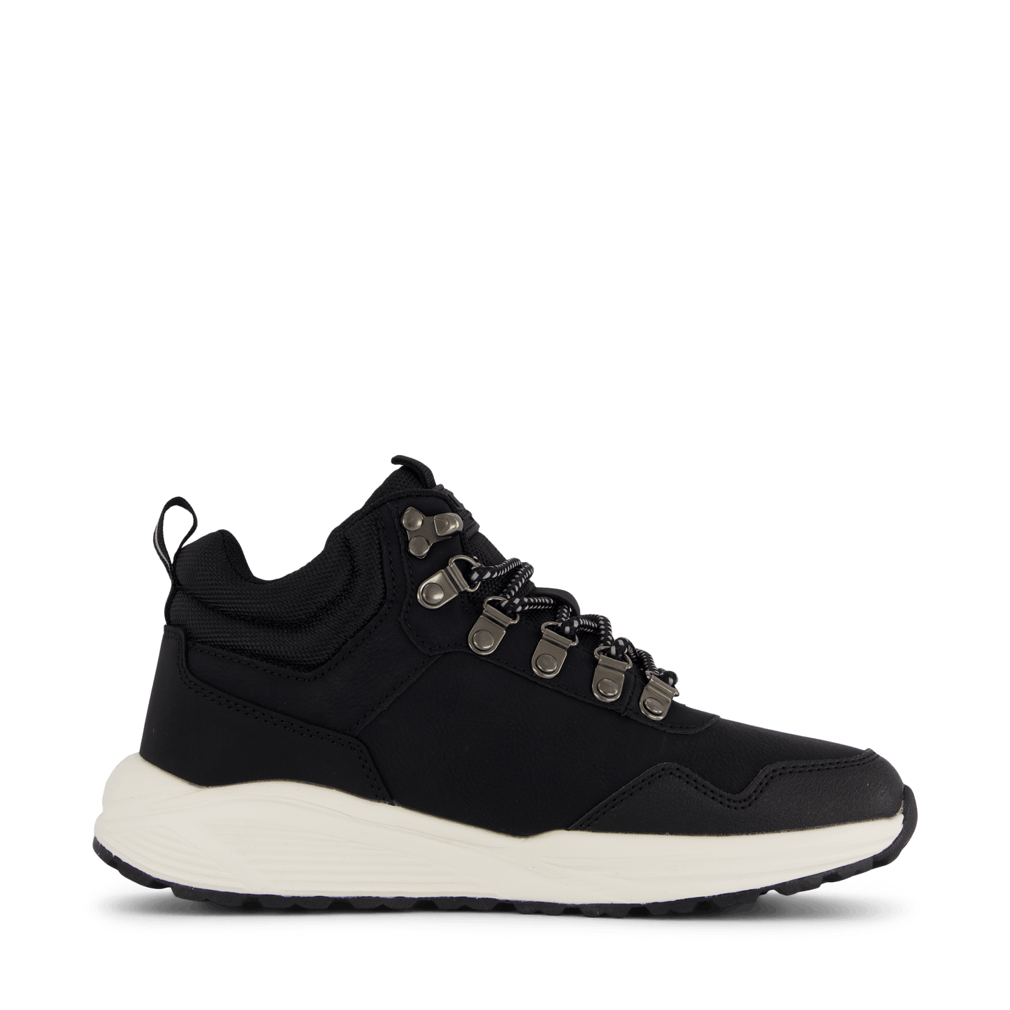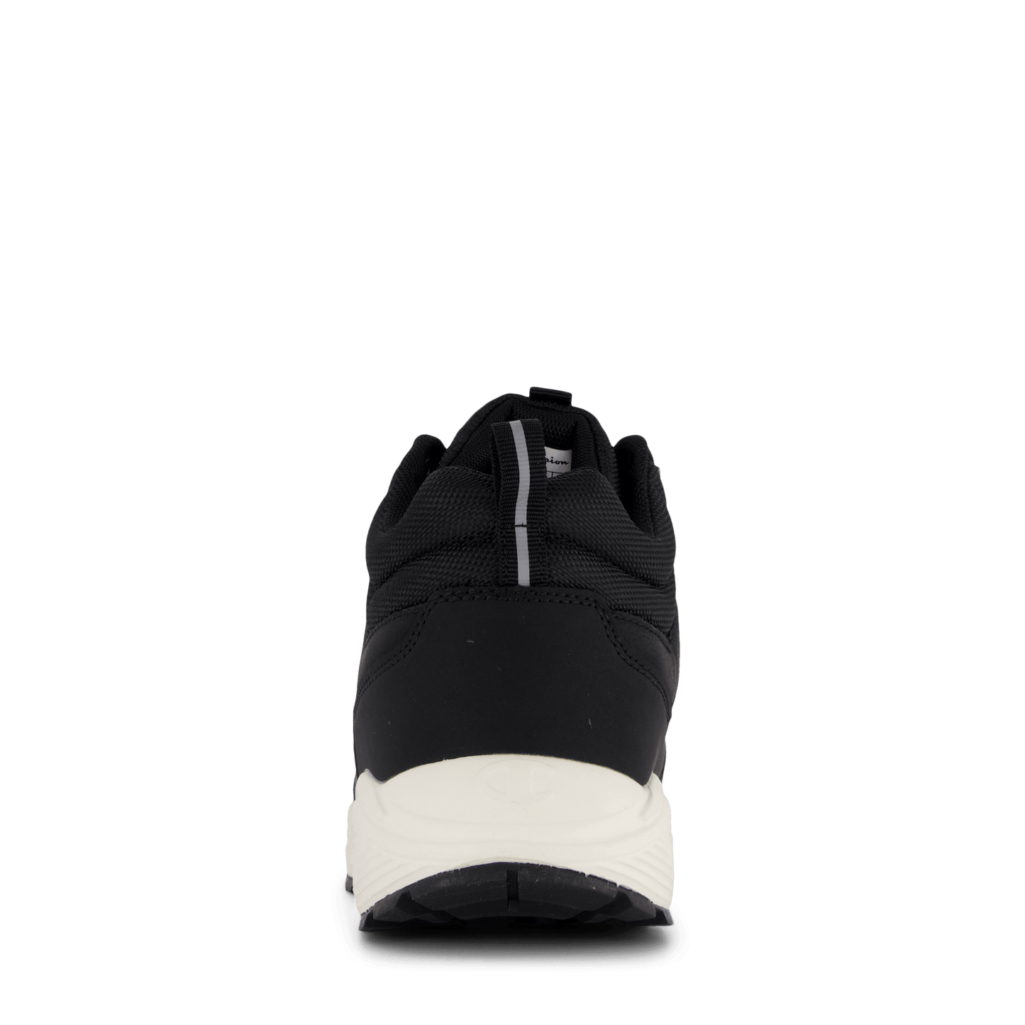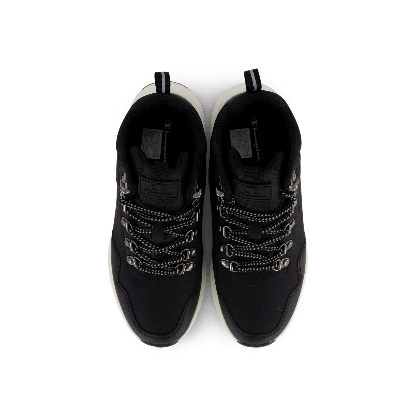 Champion's Mid Cut Shoe Climb Rx Mid B Gs in Black Beauty combines style and functionality. This sleek, black sneaker features a durable synthetic upper, lace-up closure with metal eyelets, and a padded ankle collar for support. The contrasting off-white sole provides a striking look, making it suitable for both urban wear and light outdoor activities.