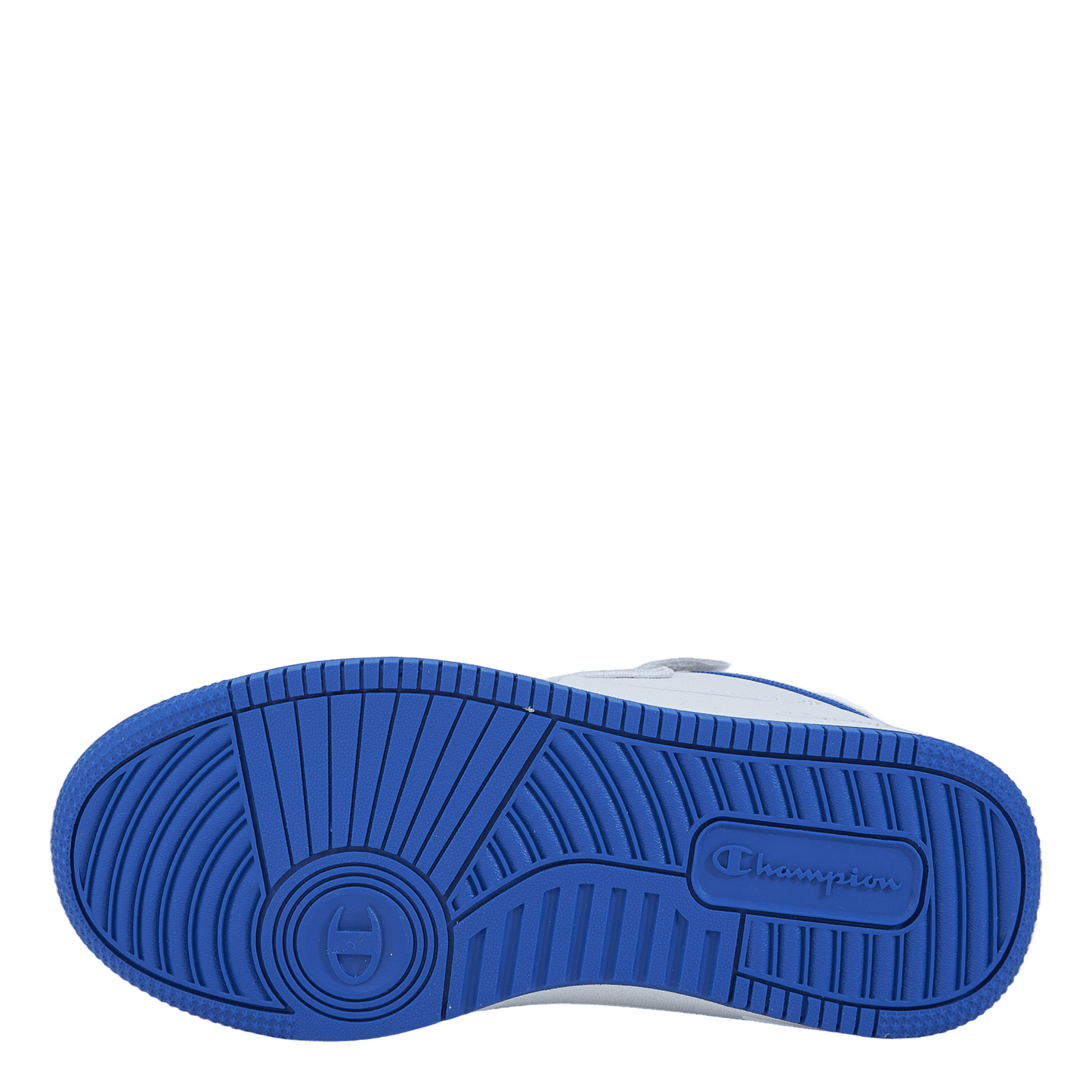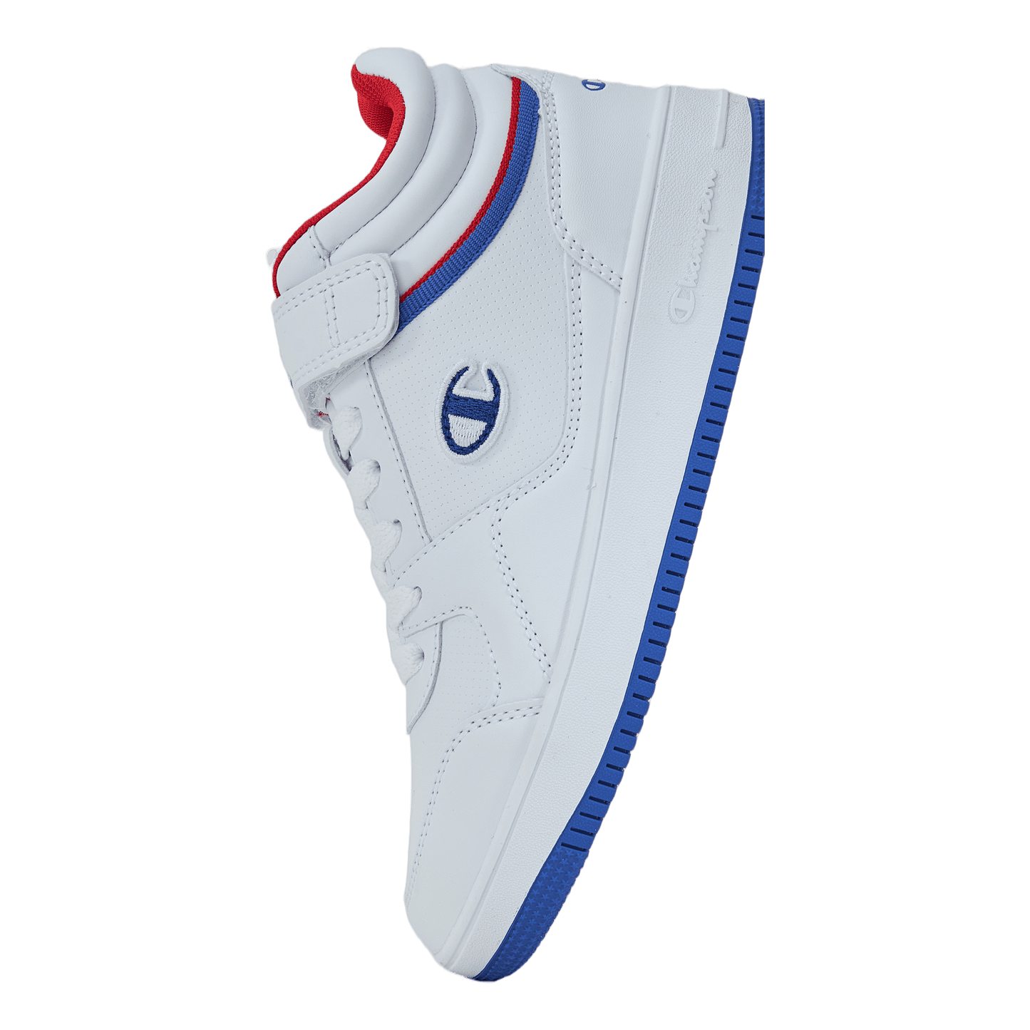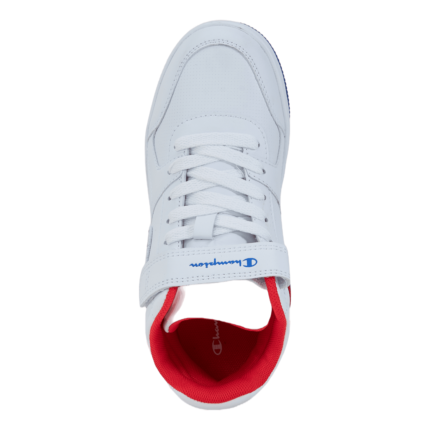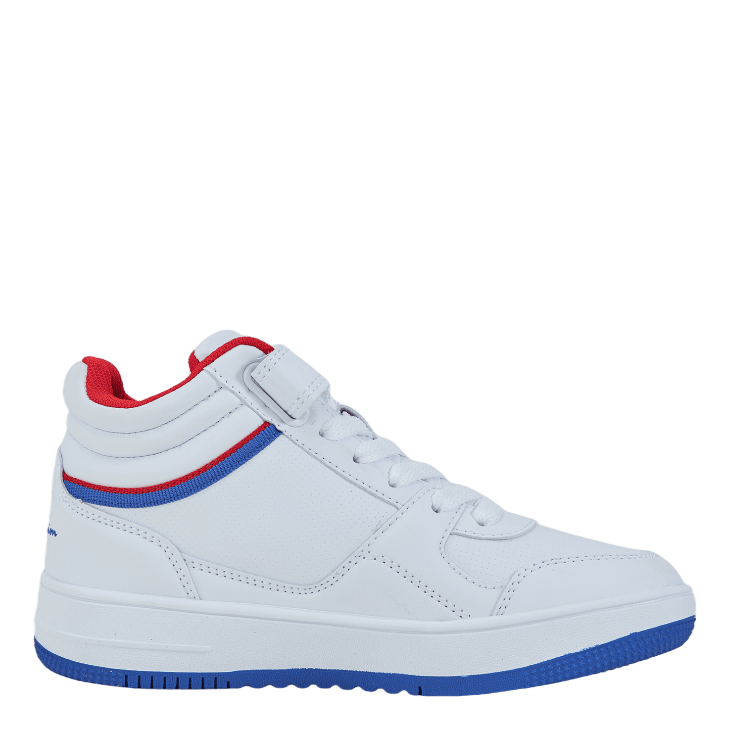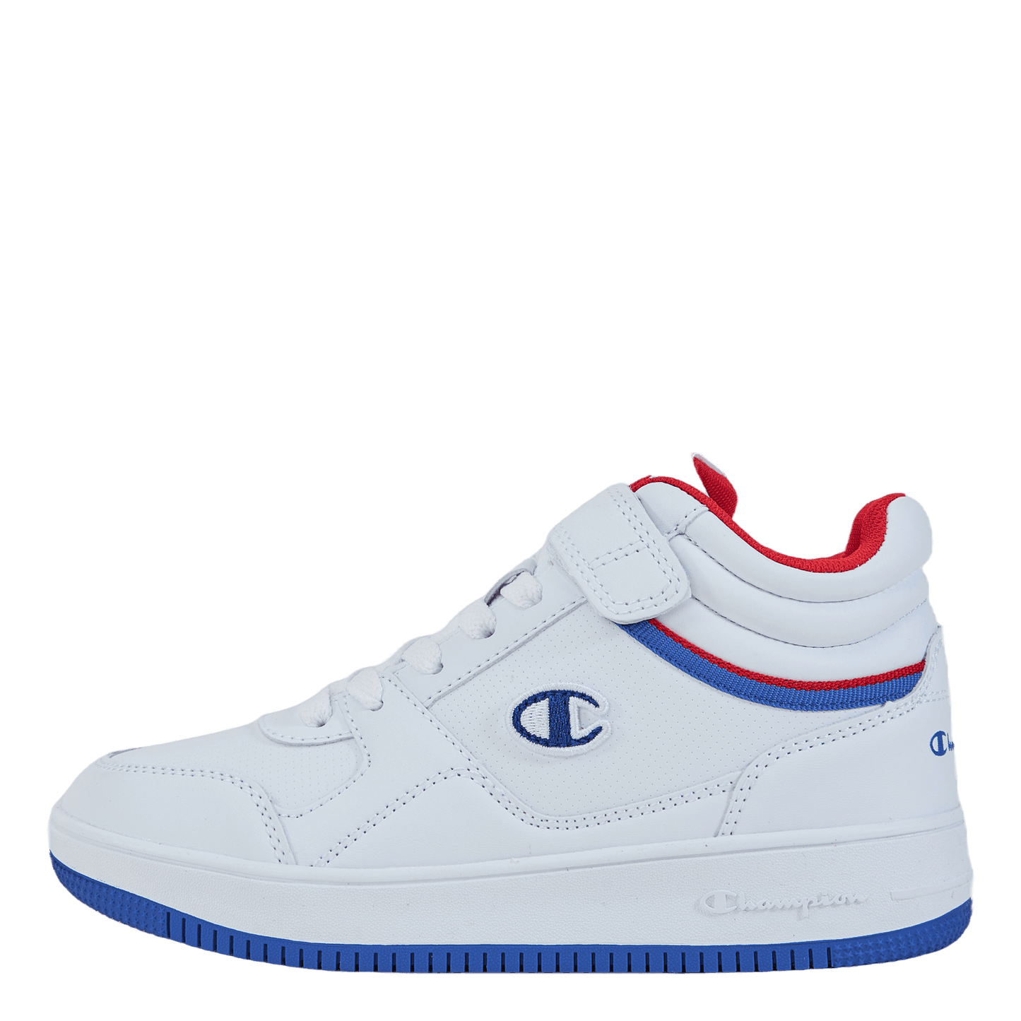 Champion's Mid Cut Shoe Rebound Vintage M Ww007 blends retro style with modern comfort. This white leather-like sneaker features striking red and blue accents, a velcro strap for adjustable fit, and laces for added security. The padded collar, embroidered Champion logo, and two-tone sole design complete this sporty, vintage-inspired look.