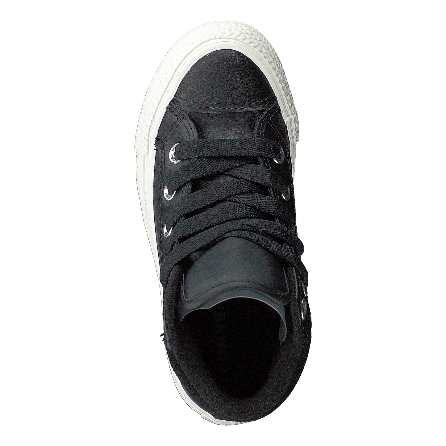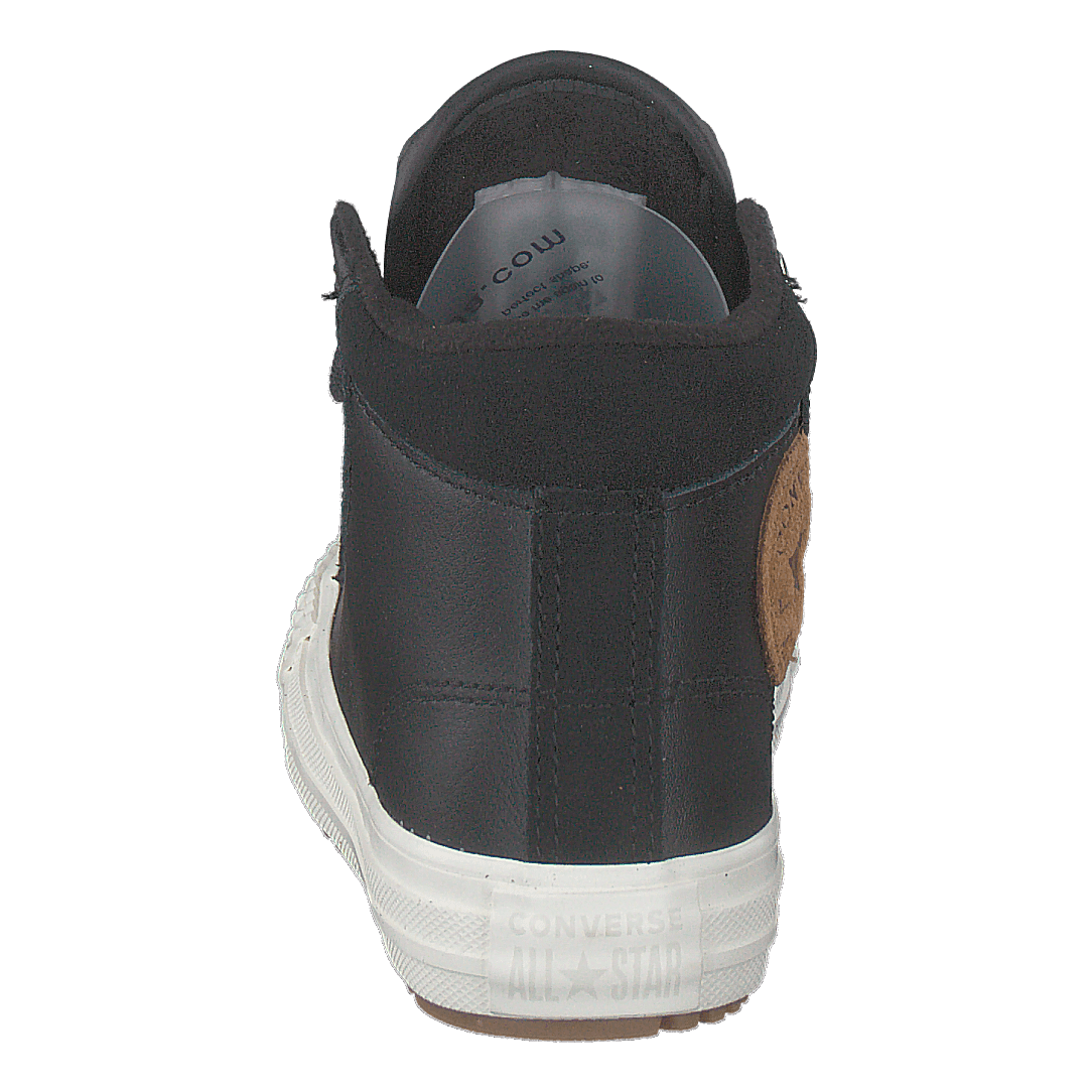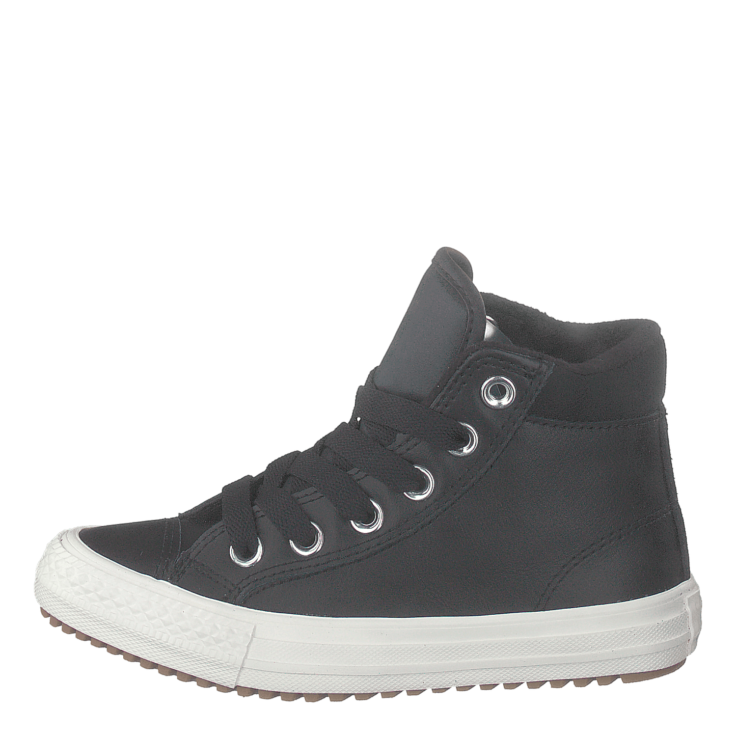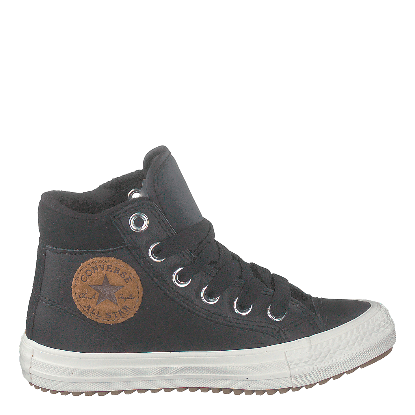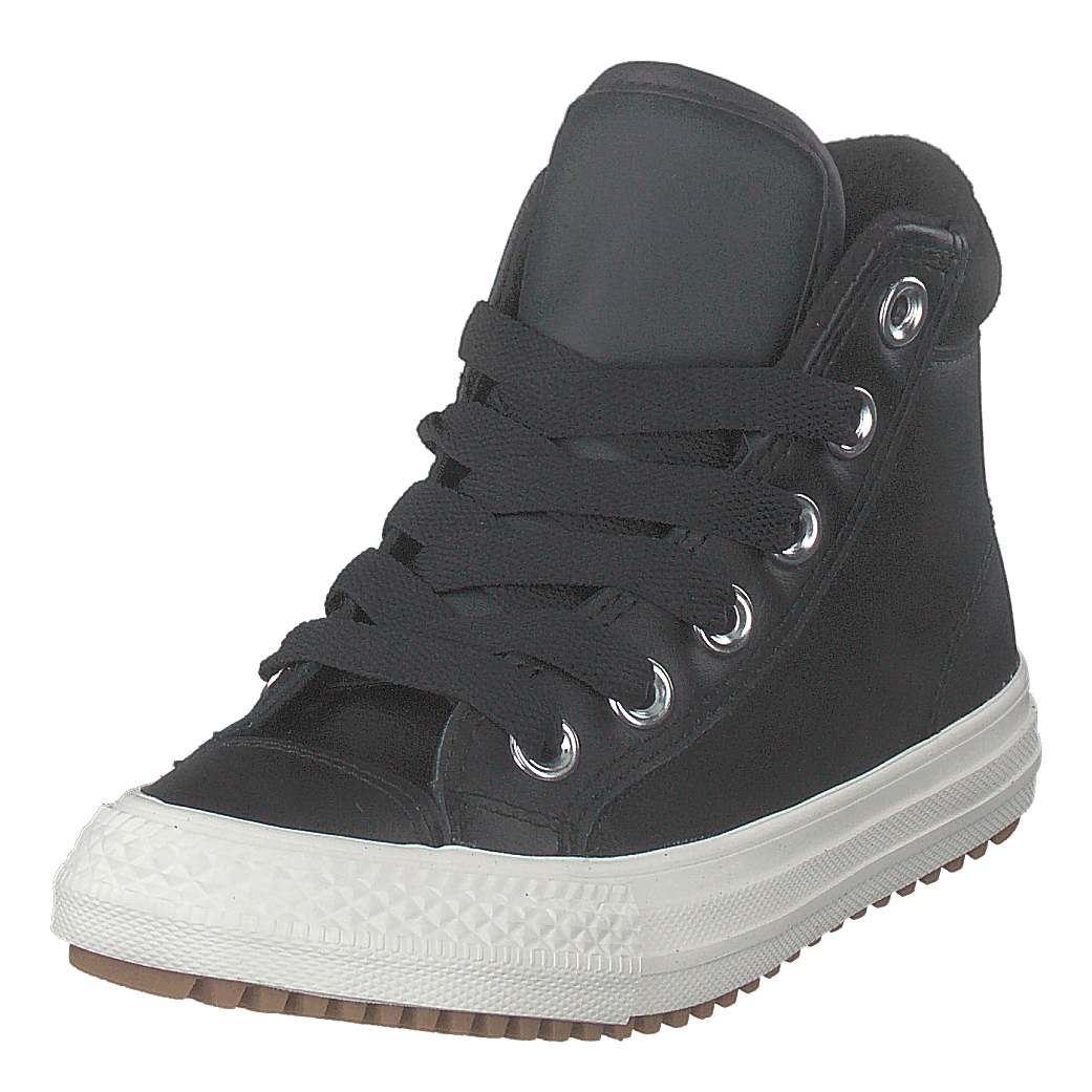 Experience year-round style with the Chuck Taylor All Star Pc Boot in classic black. This high-top sneaker boot features a premium leather upper, suede logo patch, and silver eyelets. Combining the iconic Chuck Taylor design with boot functionality, it offers a padded collar, white rubber toe cap, and EVA sole for superior cushioning and comfort in various conditions.
