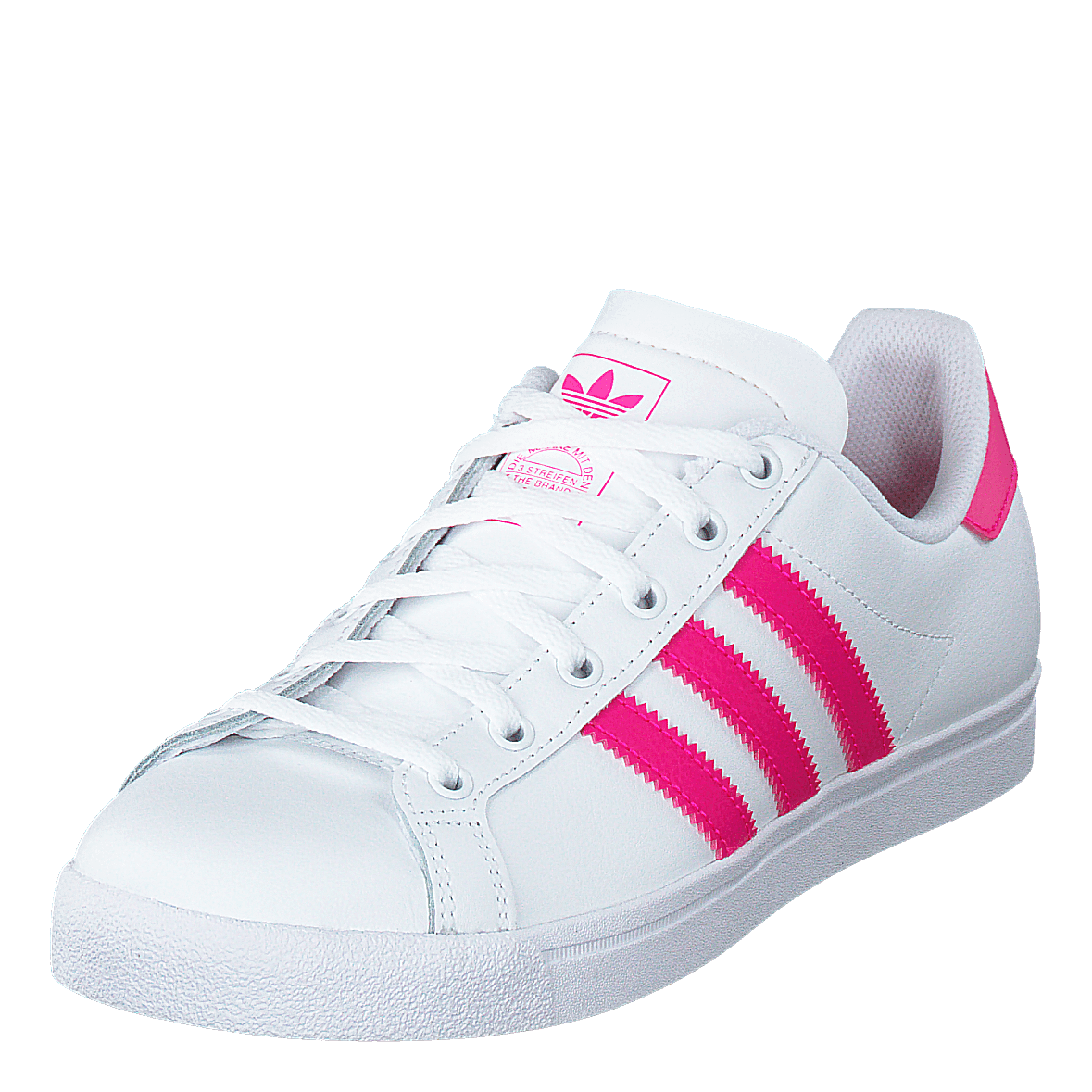 Elevate your style with these adidas Originals Coast Star J sneakers. Featuring a classic white leather upper with eye-catching shock pink stripes, these low-top shoes blend timeless design with modern flair. The rubber outsole provides excellent traction, while the padded tongue ensures comfort. Perfect for casual wear or light athletic activities.