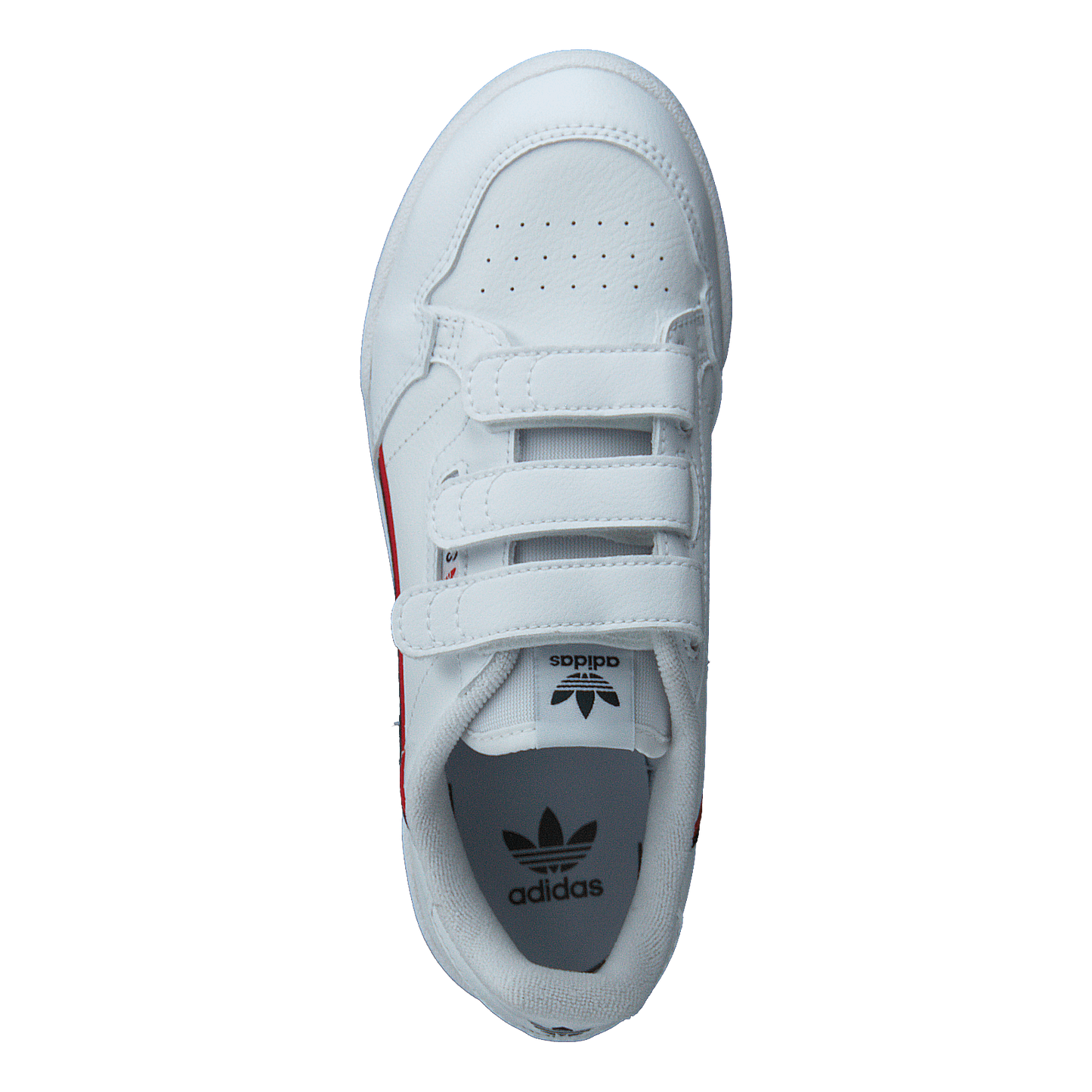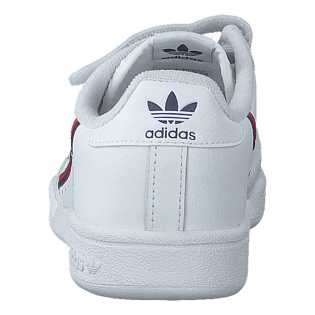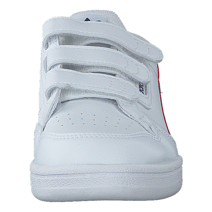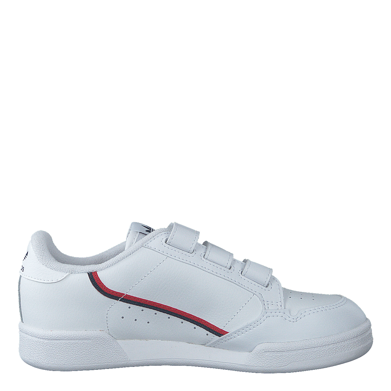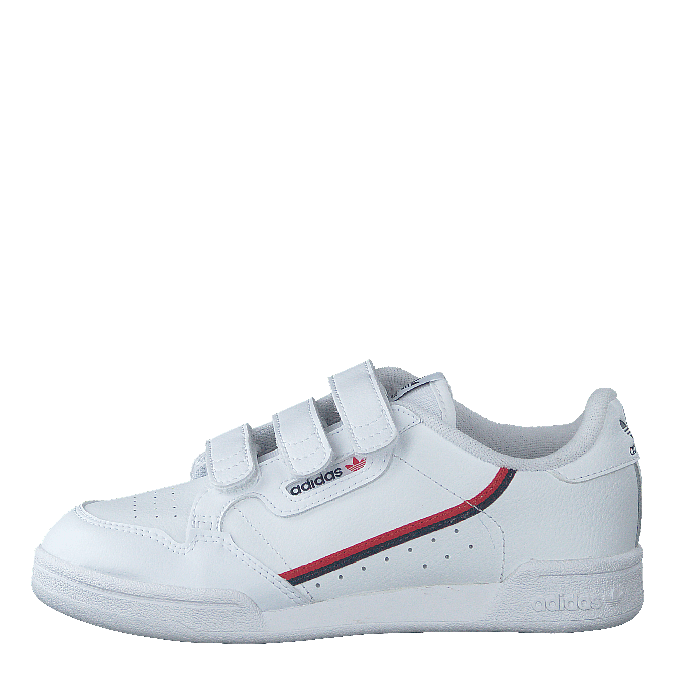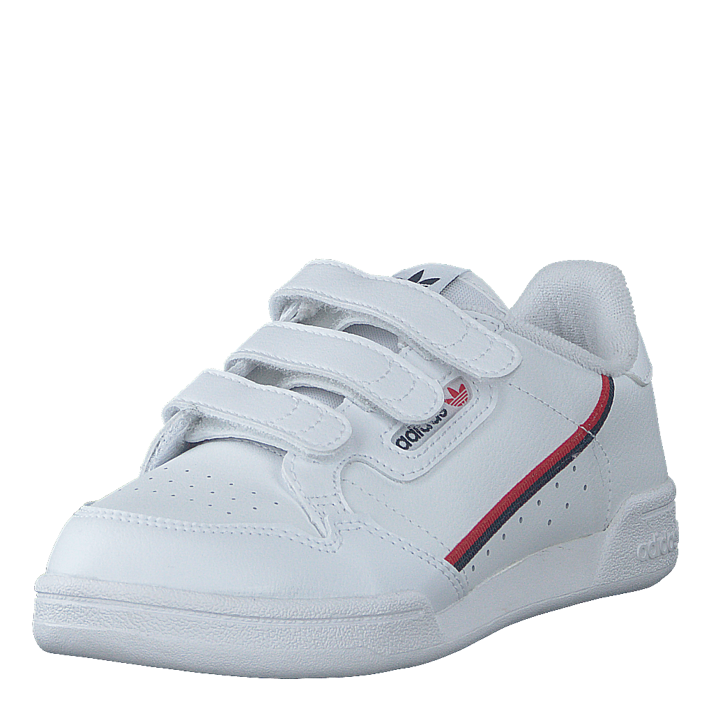 Adidas Continental 80 sneakers blend retro style with modern comfort. These low-top shoes feature a soft white leather upper, three Velcro straps for easy fastening, and a distinctive red stripe with navy outline. The OrthoLite® sockliner and Adifit insole ensure a comfortable fit, making them ideal for all-day wear from school to play.
