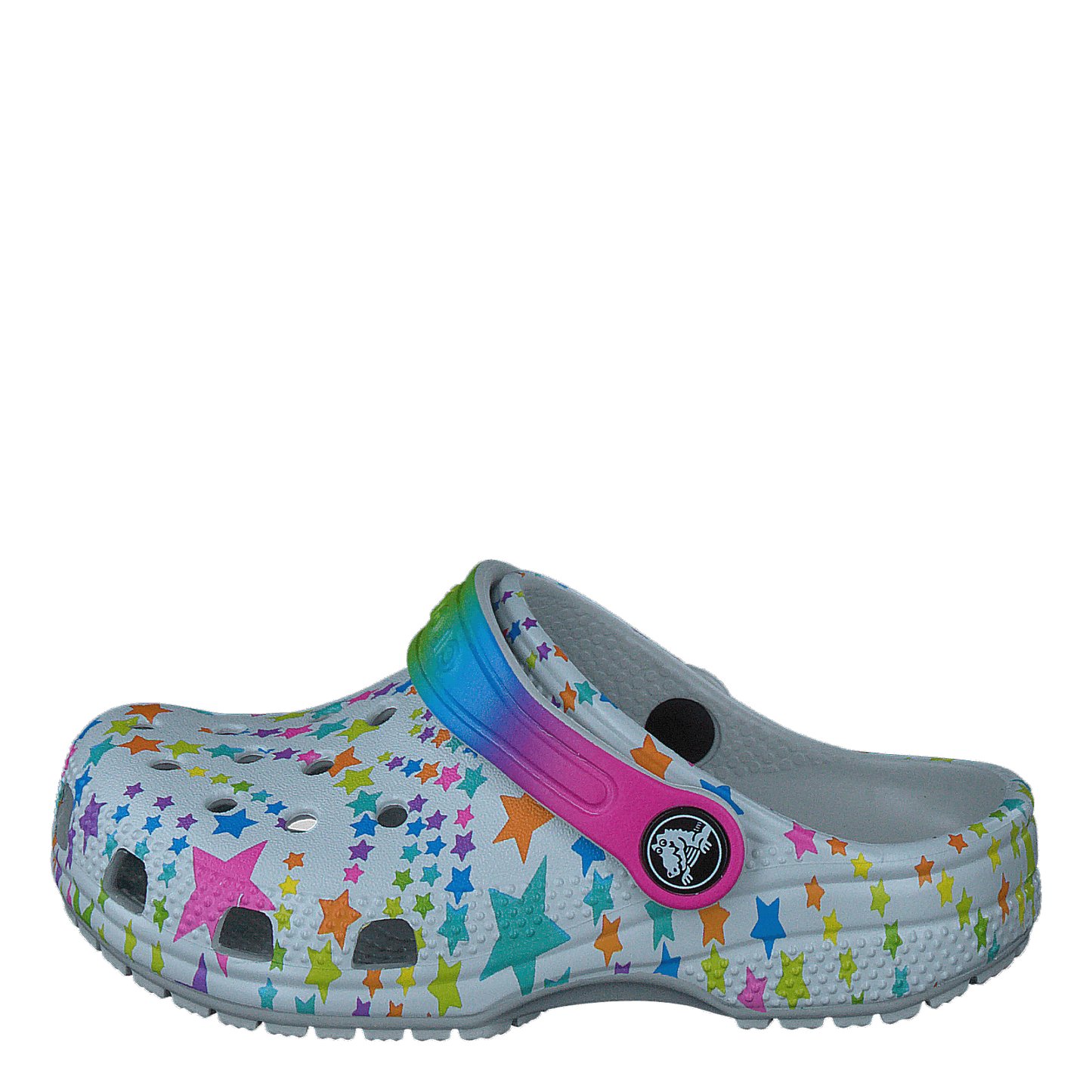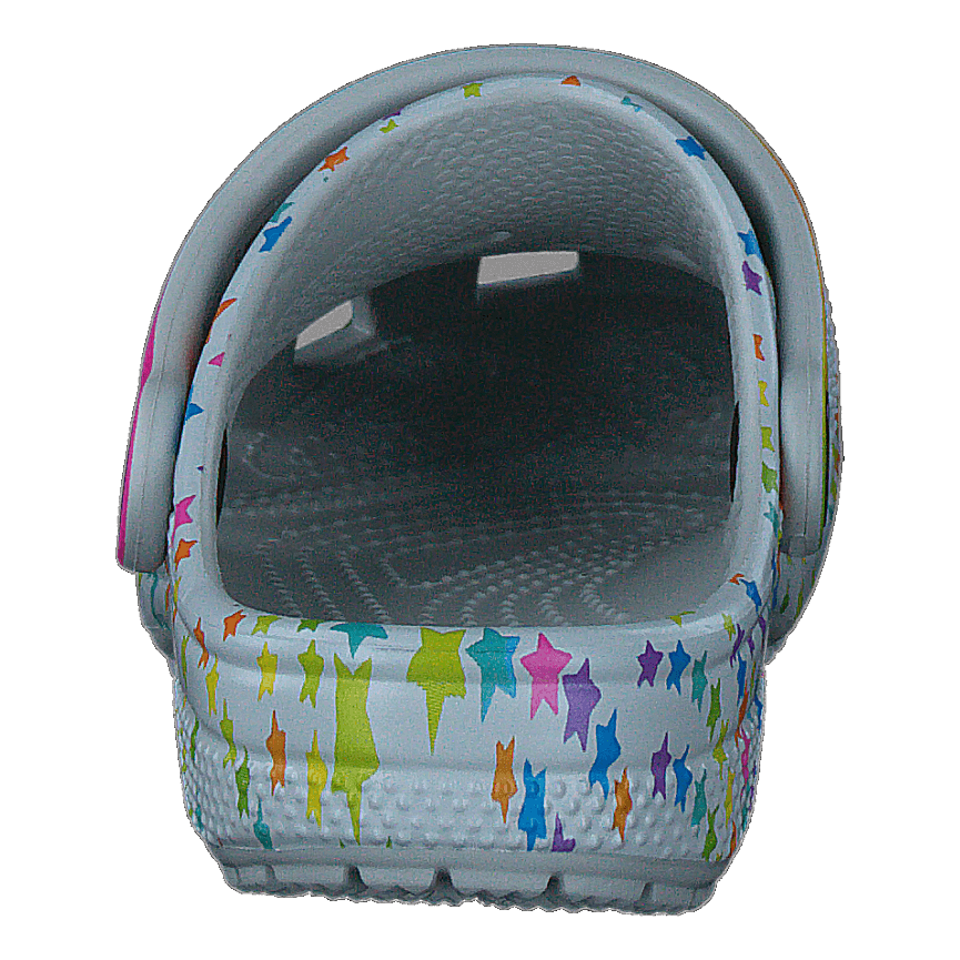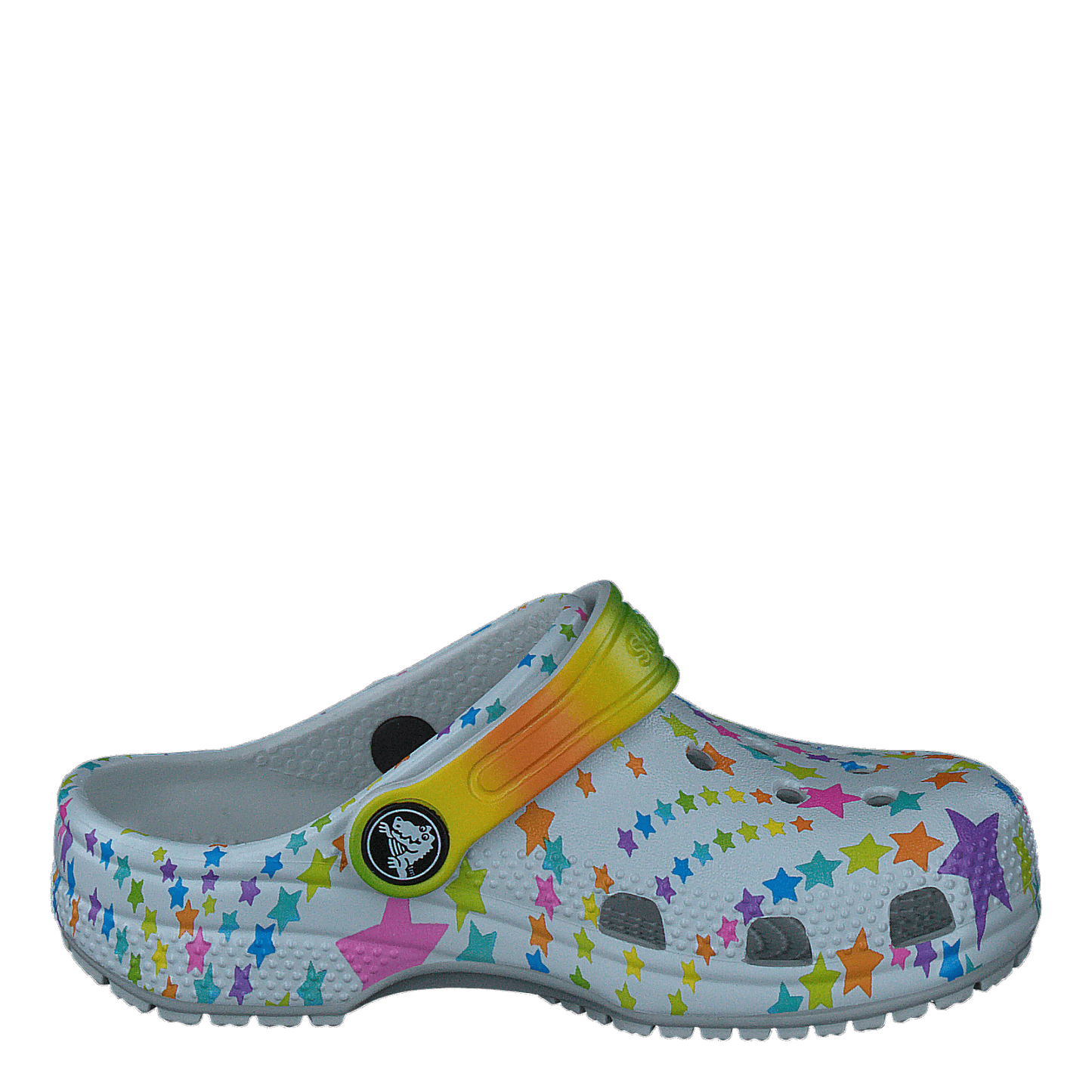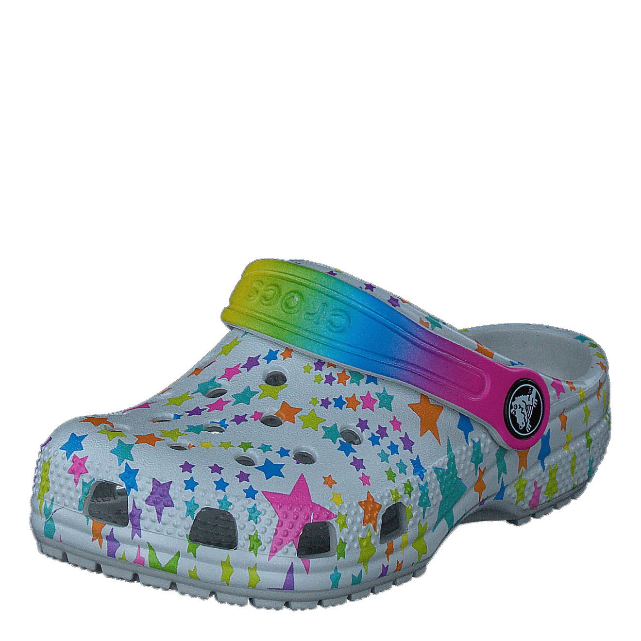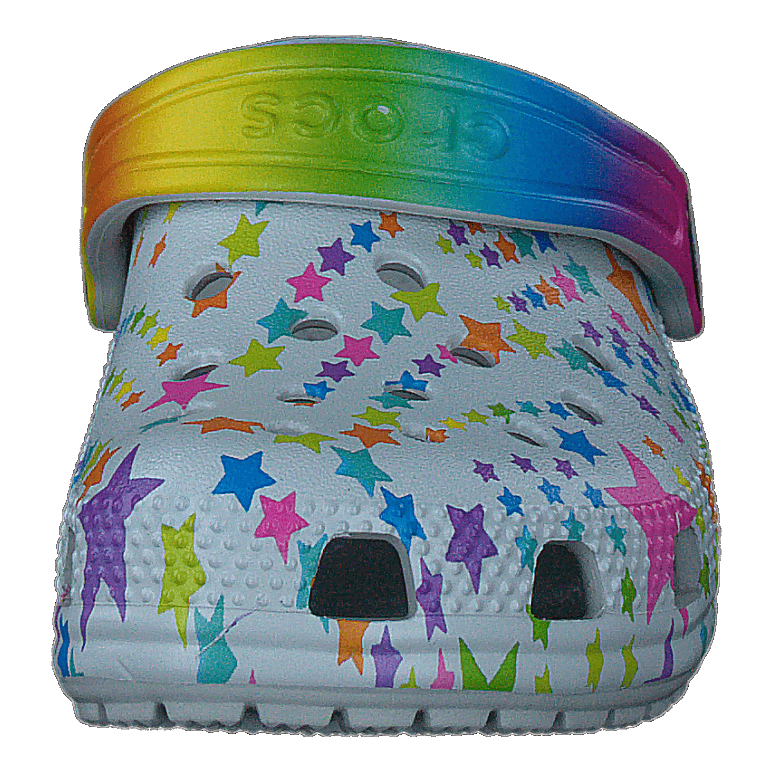 Elevate your style with these vibrant Classic Disco Dance Party Crocs. Featuring a white base adorned with multicolored stars, these clogs offer a playful, festive look. The signature perforated design ensures breathability, while the gradient heel strap adds extra flair. Lightweight and comfortable, these party-ready Crocs combine fun and functionality for any celebratory occasion.