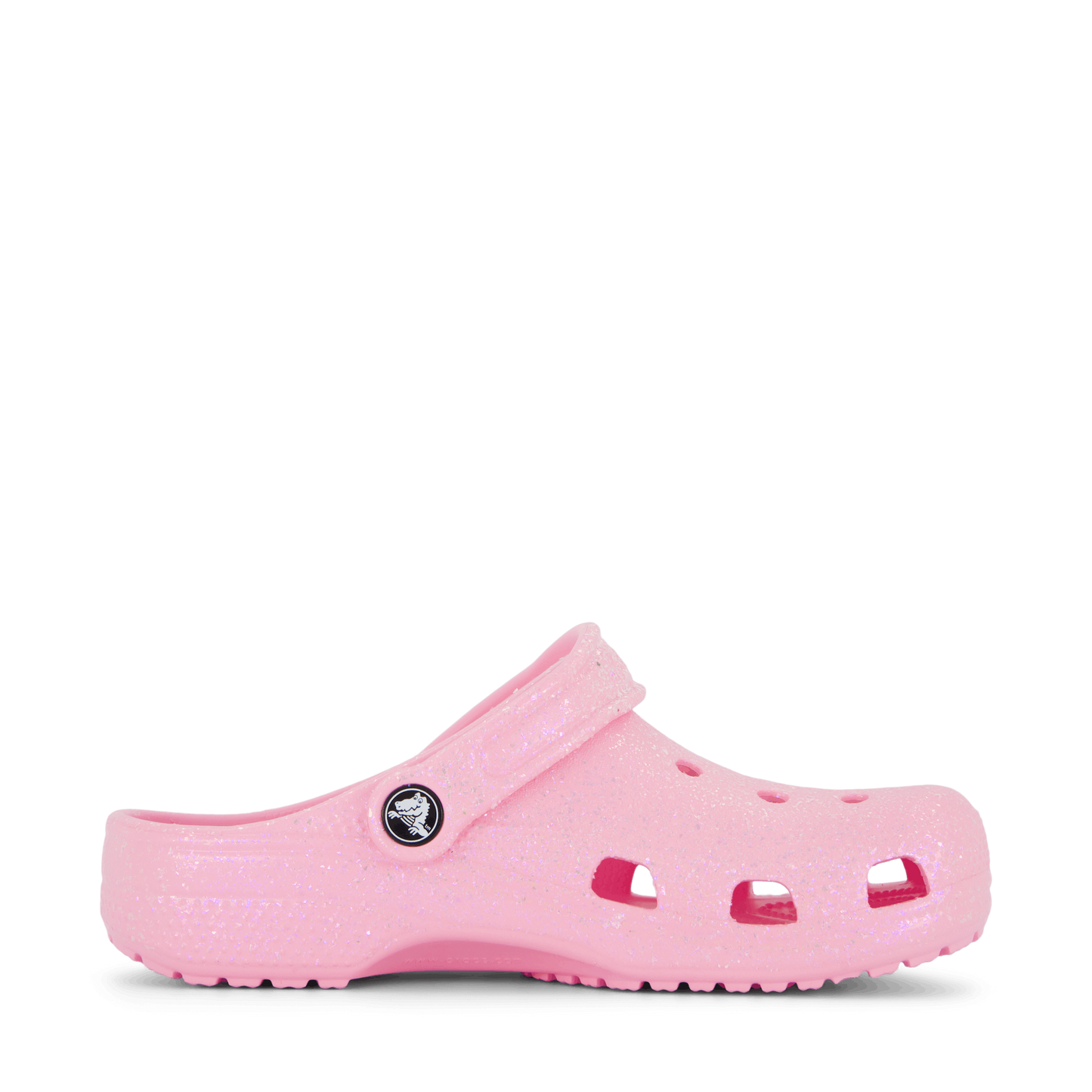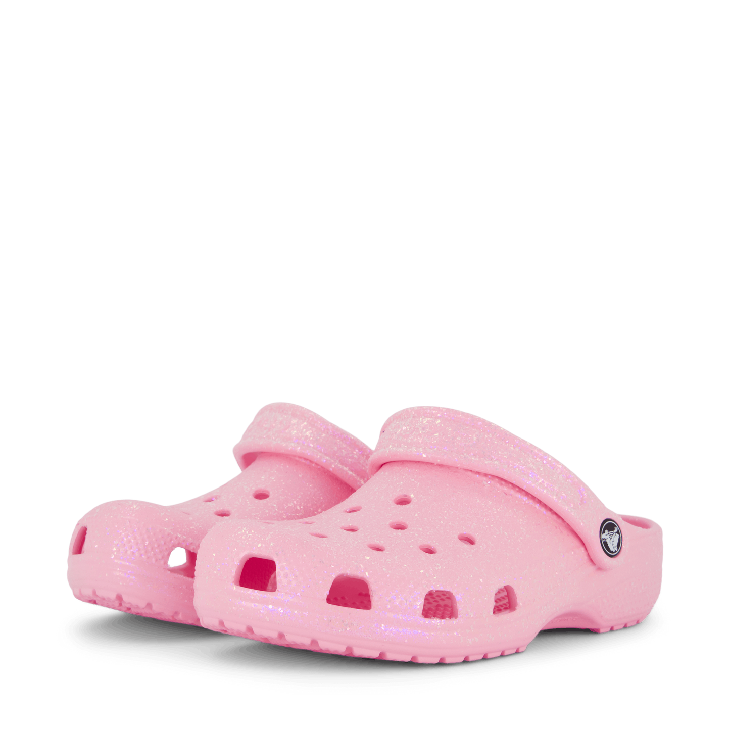 Sparkle and comfort combine in these Classic Glitter Clog K Flamingo shoes from Crocs. Crafted in soft pink with a shimmering, glittery finish, these children's clogs feature the iconic ventilation holes and pivoting heel strap. Made from durable molded material, they offer a playful and eye-catching design perfect for young feet seeking both style and practicality.