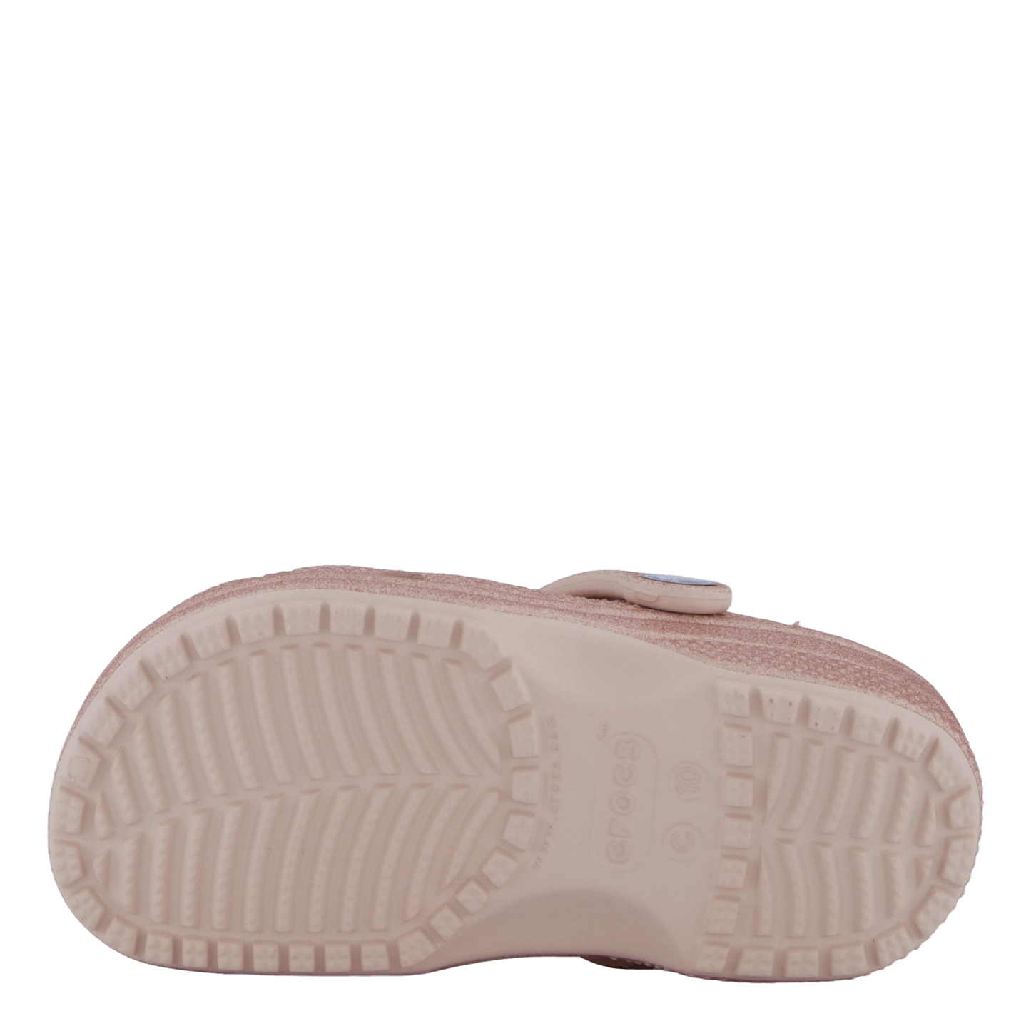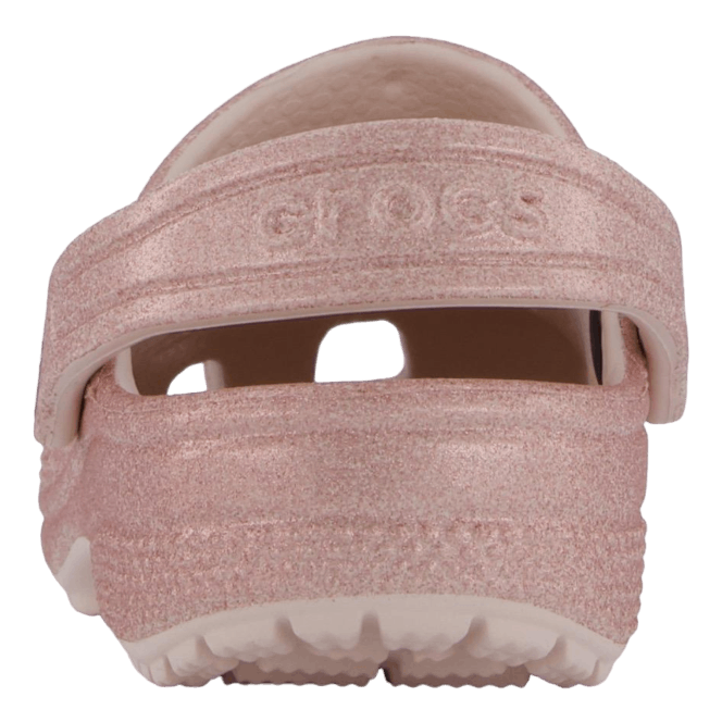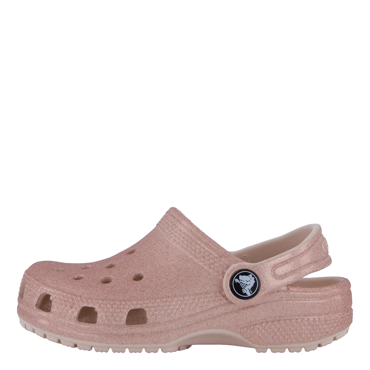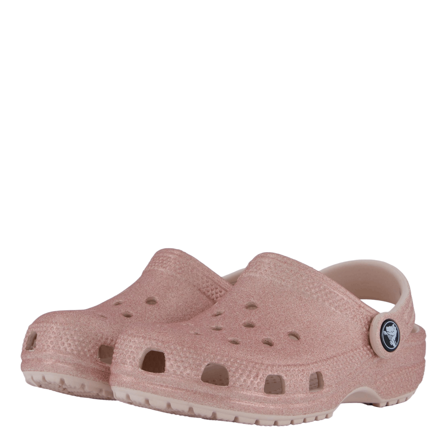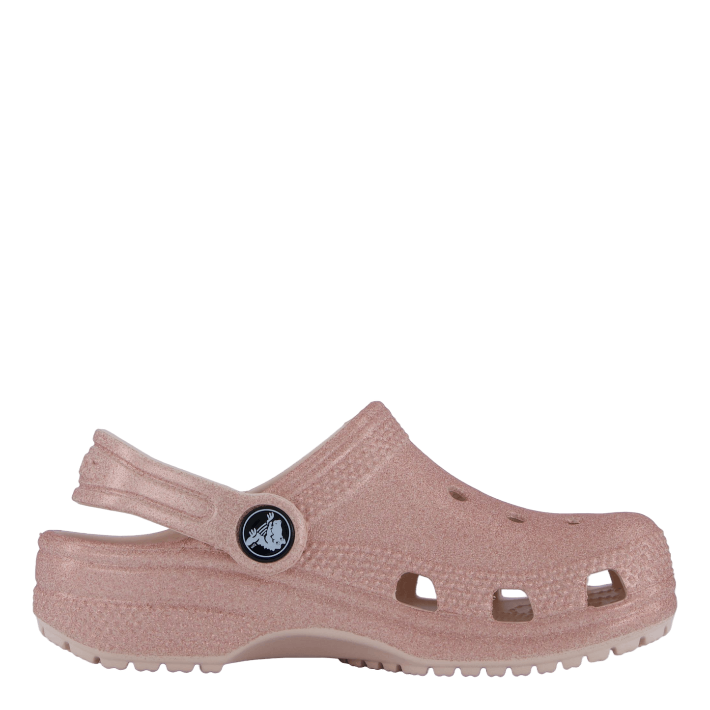 Elevate your child's style with these Classic Glitter Clog T Quartz shoes from Crocs. Crafted in light pink glittery material, these clogs feature the iconic Crocs design with a rounded toe, raised heel, and ventilation holes. The adjustable strap offers versatile wear, while the glittery finish adds a playful touch to the practical, comfortable design.