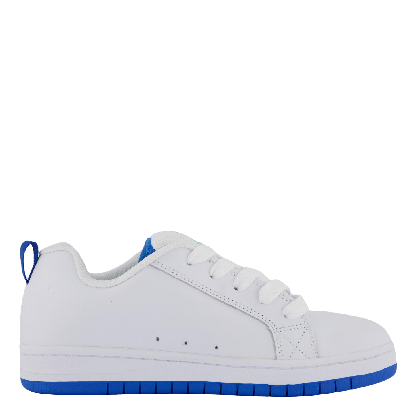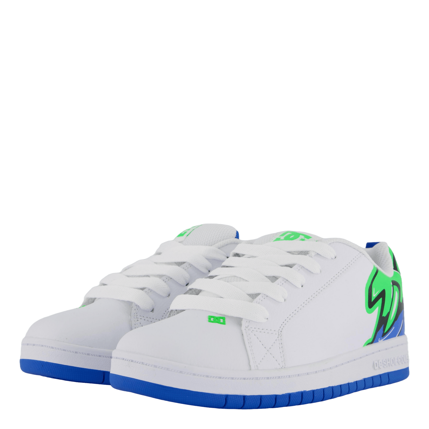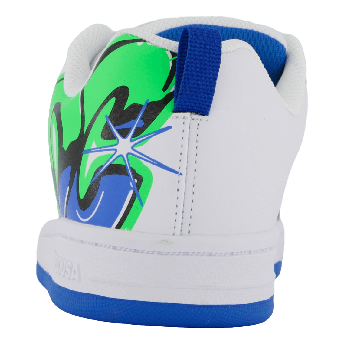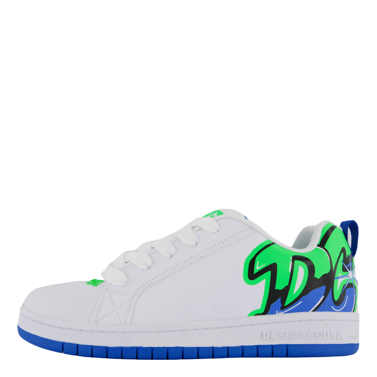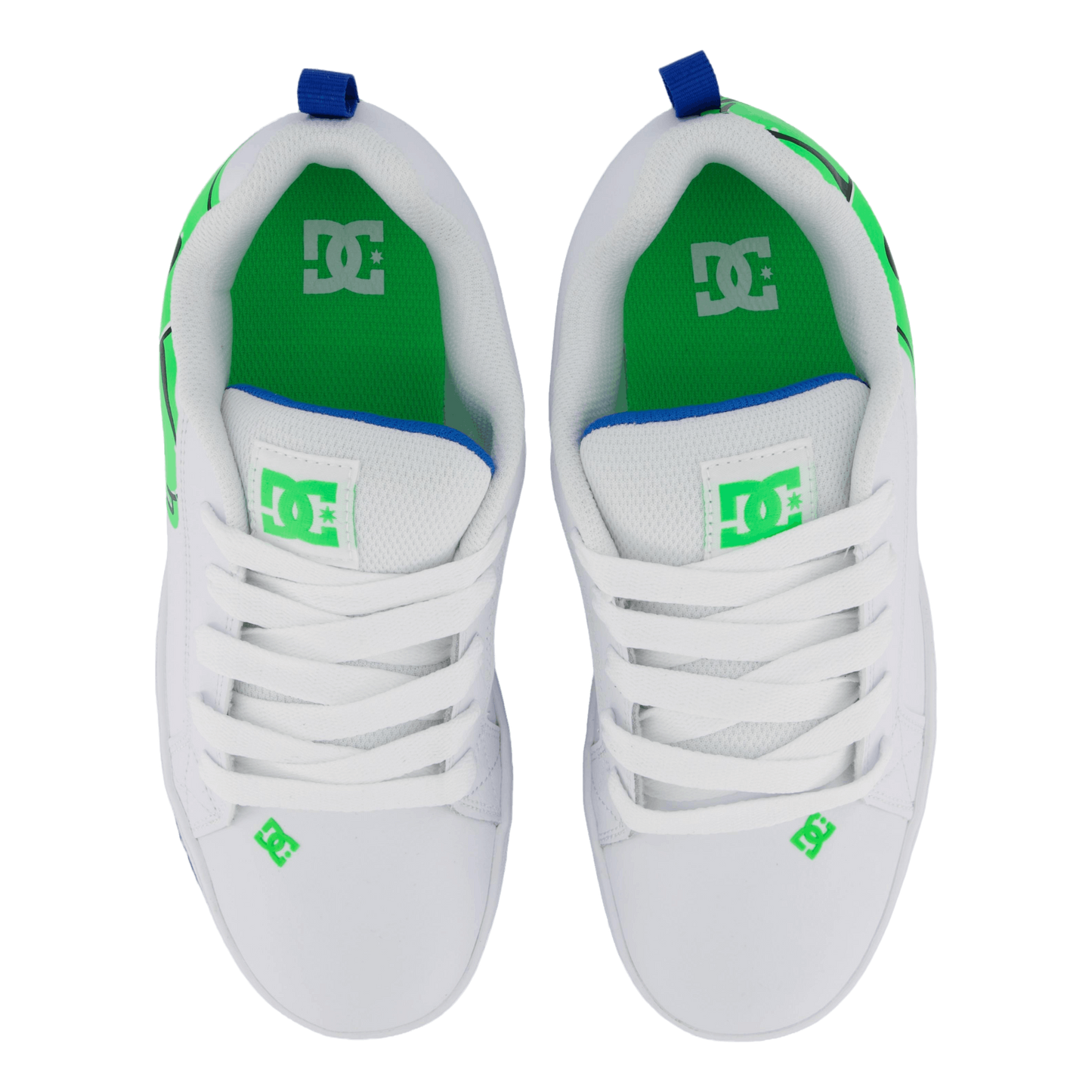 DC Shoes presents the Court Graffik White/graffiti Print, a striking blend of classic and urban style. This skateboarding-inspired sneaker features a clean white leather-like upper, accented by vibrant graffiti-style designs in green and blue on the heel and side. With its white laces, blue sole, and street art aesthetics, this shoe offers a youthful and eye-catching look for casual wear.