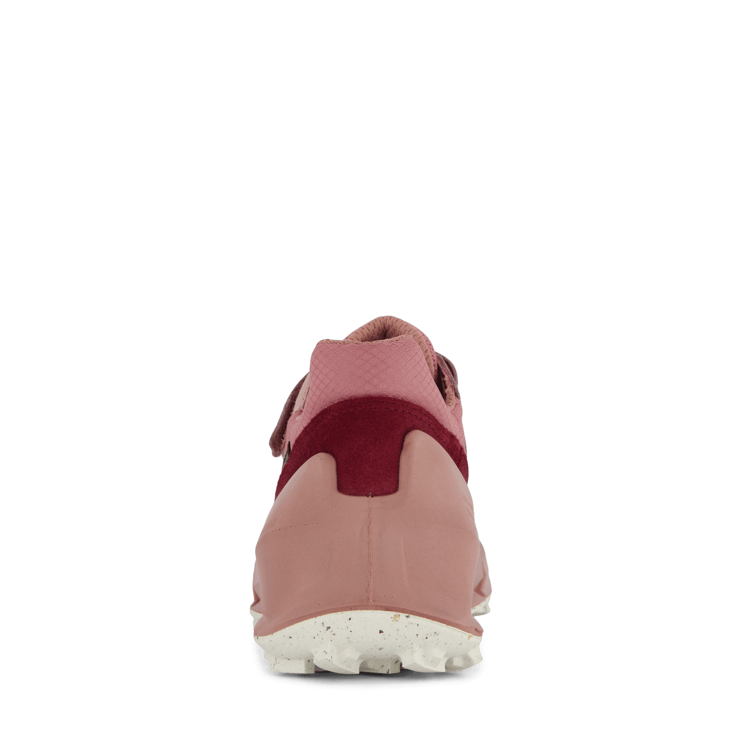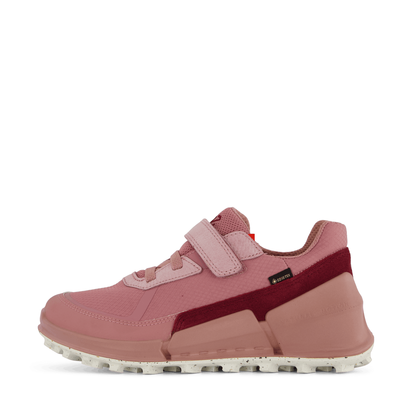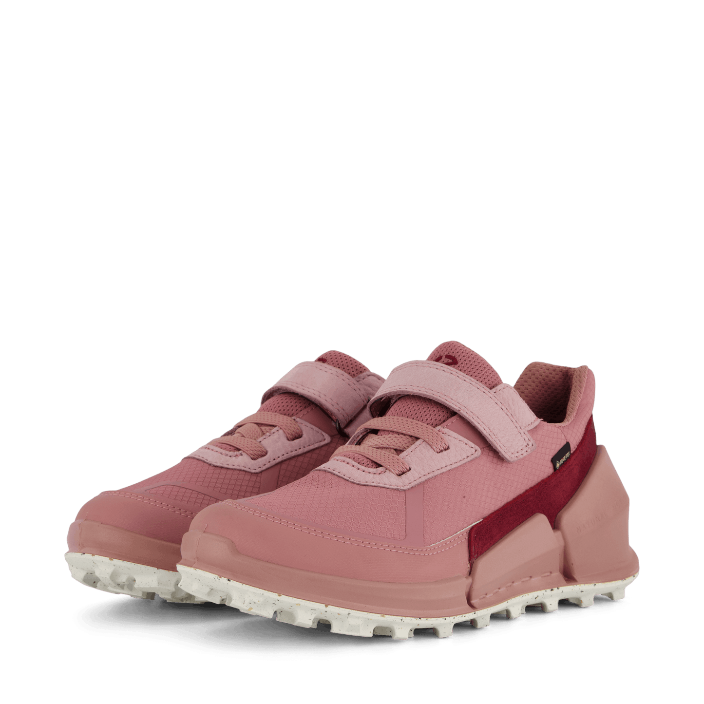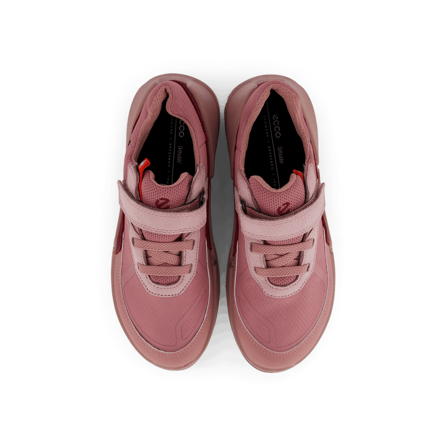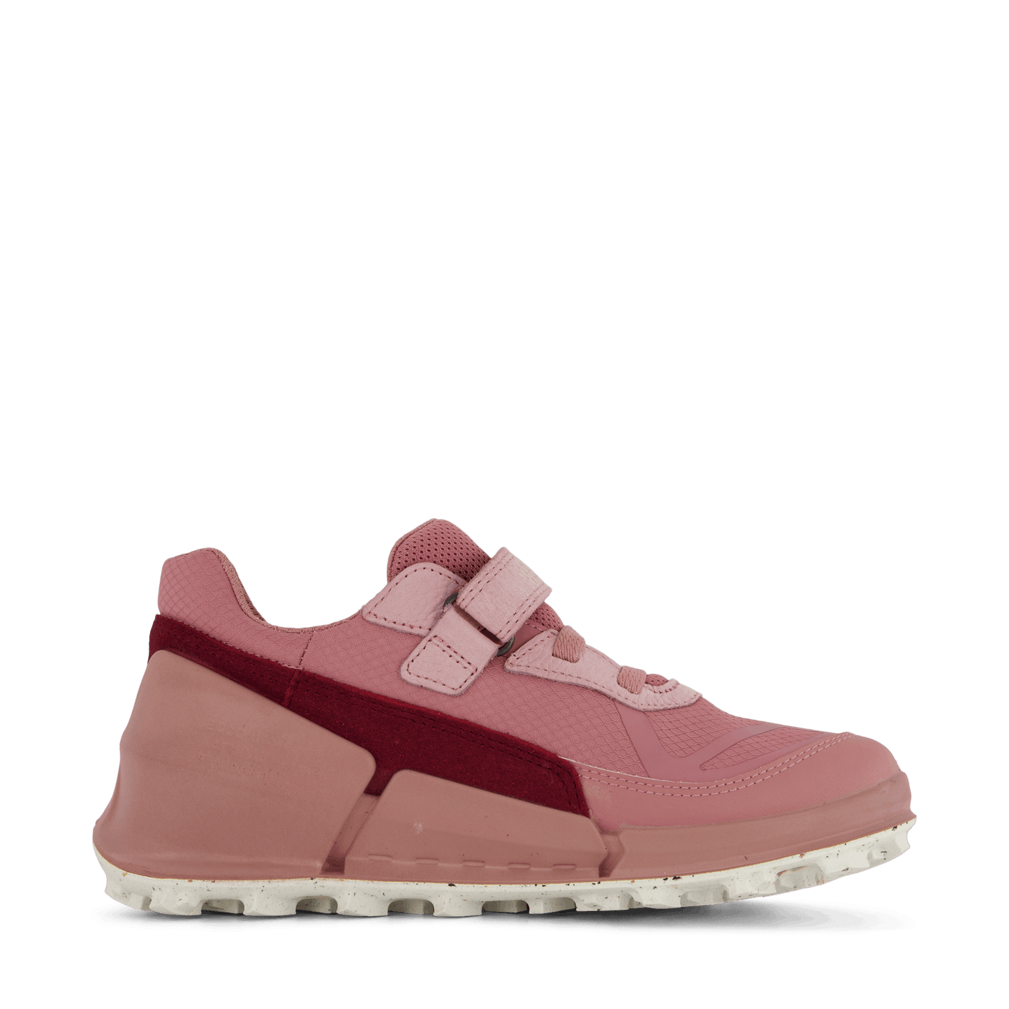 Elevate your child's footwear with the Ecco Biom K2 sneaker in blush tones. This stylish shoe features a combination of suede and breathable mesh, complemented by a convenient velcro strap and elastic laces for a secure fit. The chunky, speckled white sole provides excellent support, while the color-blocked pink design offers a modern, sporty look perfect for active kids.