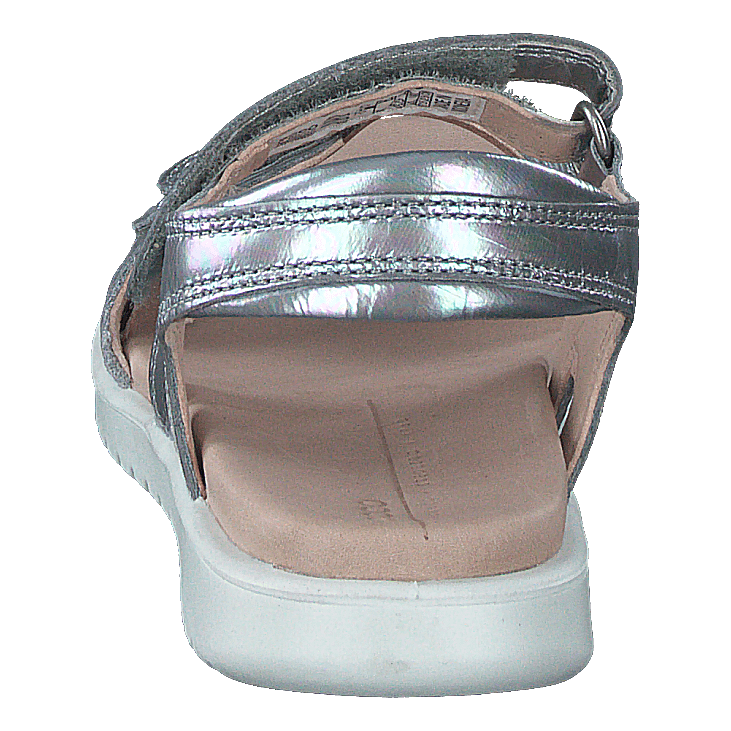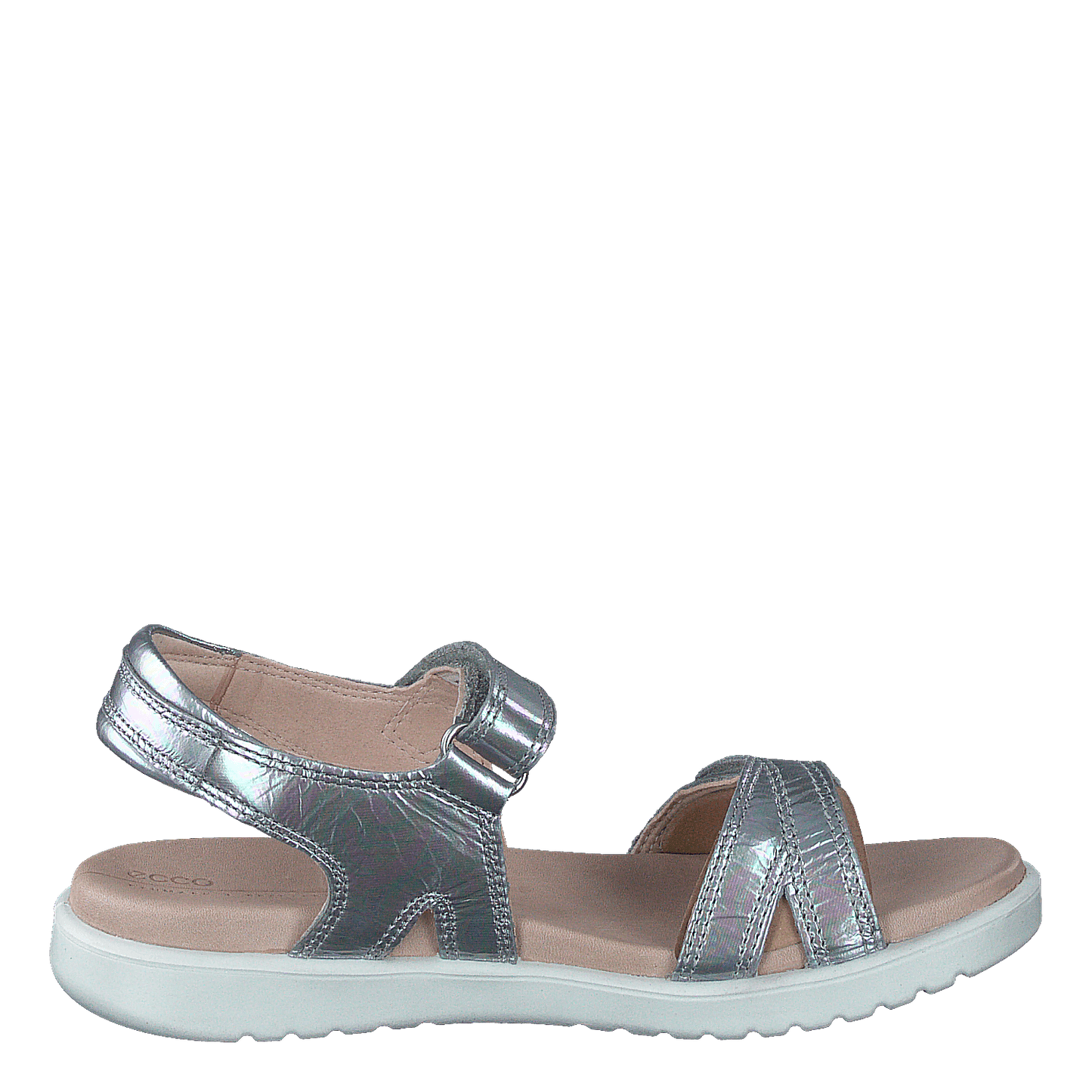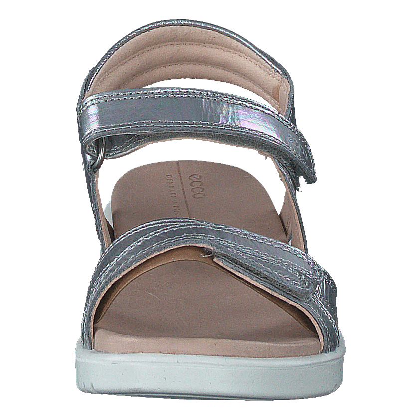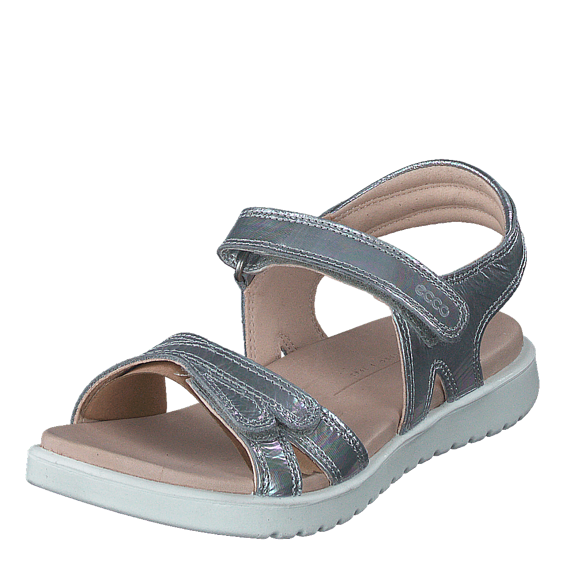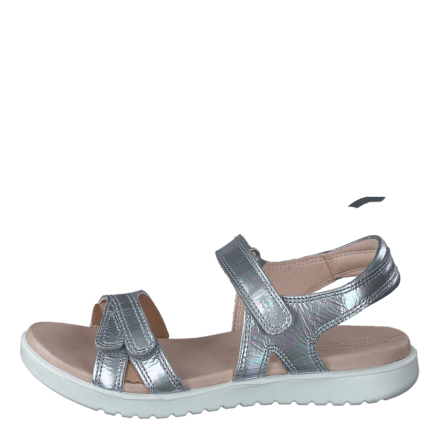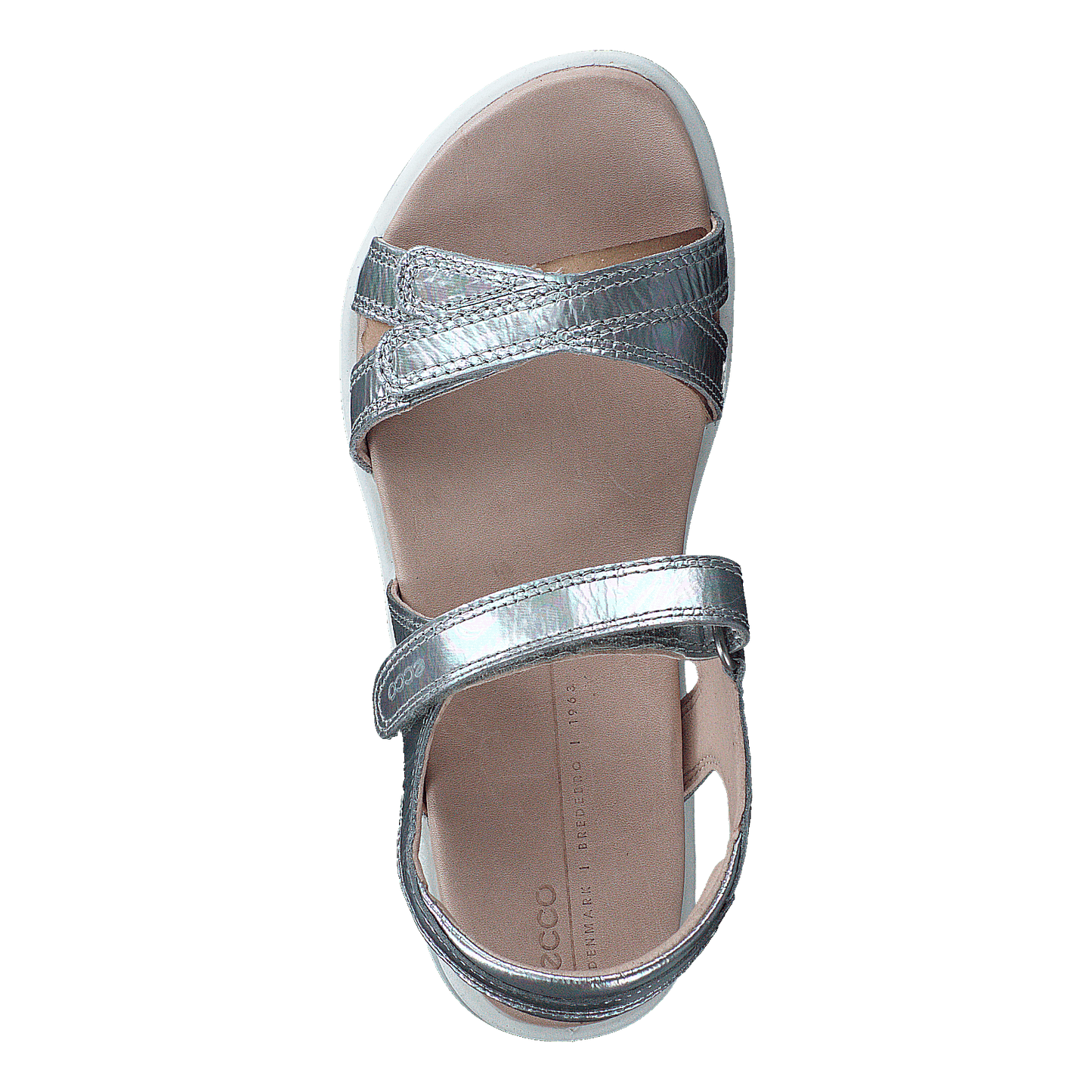 Elevate your style with Ecco Flora Silver Iridescent sandals. These versatile women's shoes feature a metallic silver upper with an eye-catching iridescent finish. The dual-strap design with ankle support offers secure fitting, while the thick, cushioned sole ensures comfort. Perfect for both casual and dressier occasions, these modern sandals combine practicality with sleek, minimalist aesthetics.