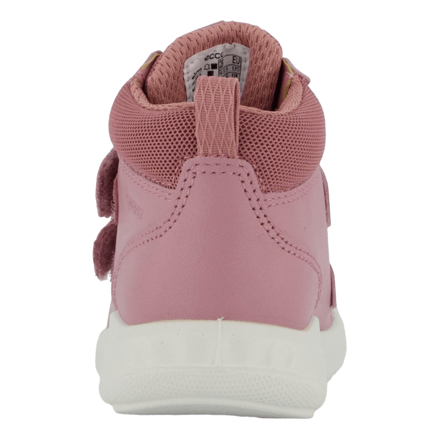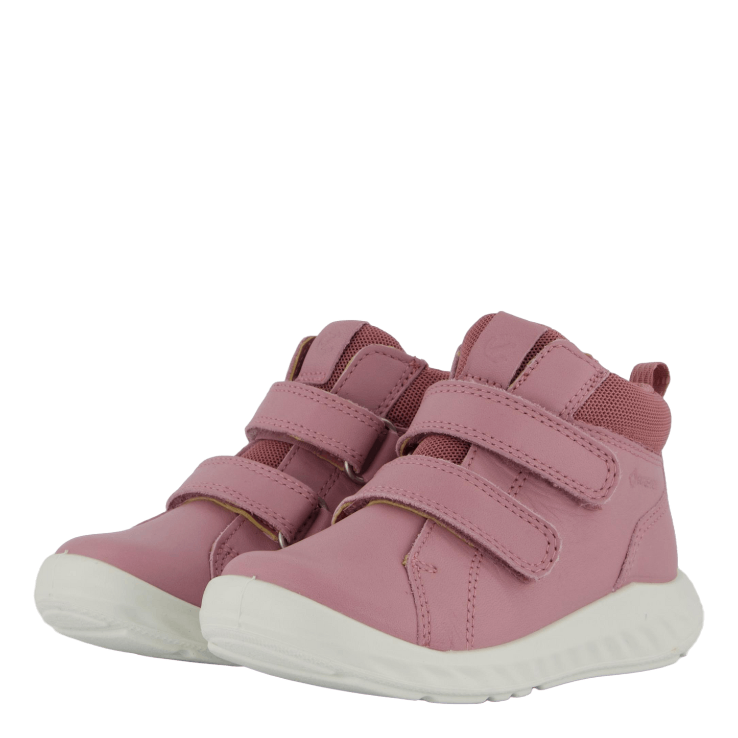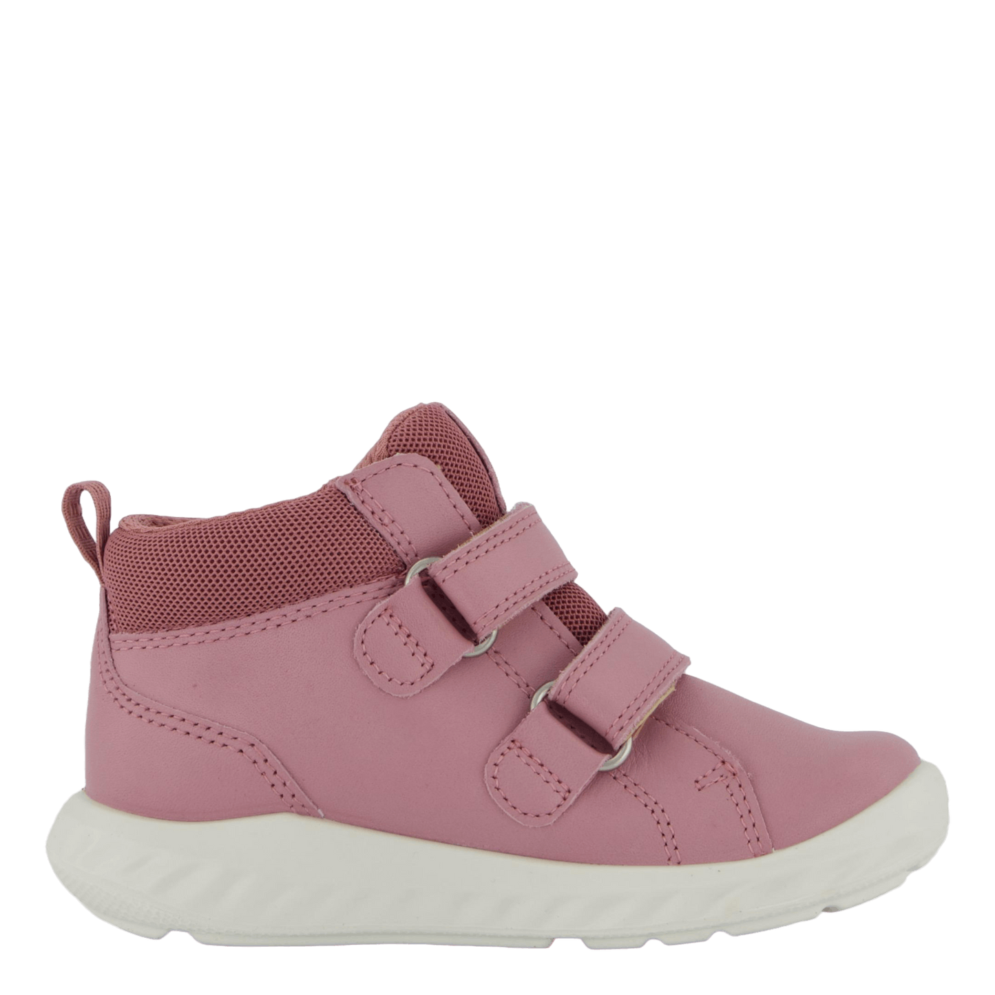 Ecco Sp.1 Lite Infant shoe in blush pink combines style and practicality for little feet. This high-top sneaker features smooth leather upper, breathable mesh ankle collar, and two easy-to-use Velcro straps. With a white contrasting sole and raised ankle support, it offers both comfort and a trendy look for your little one.