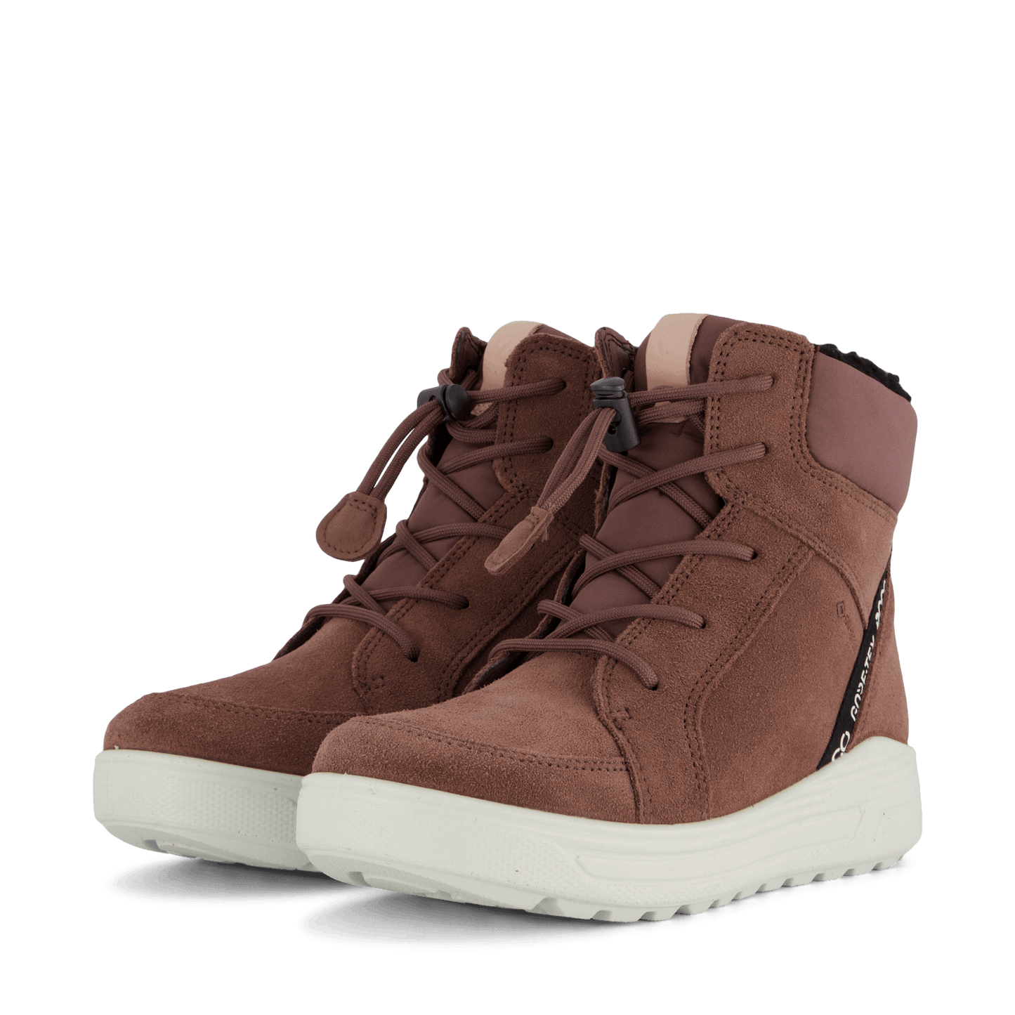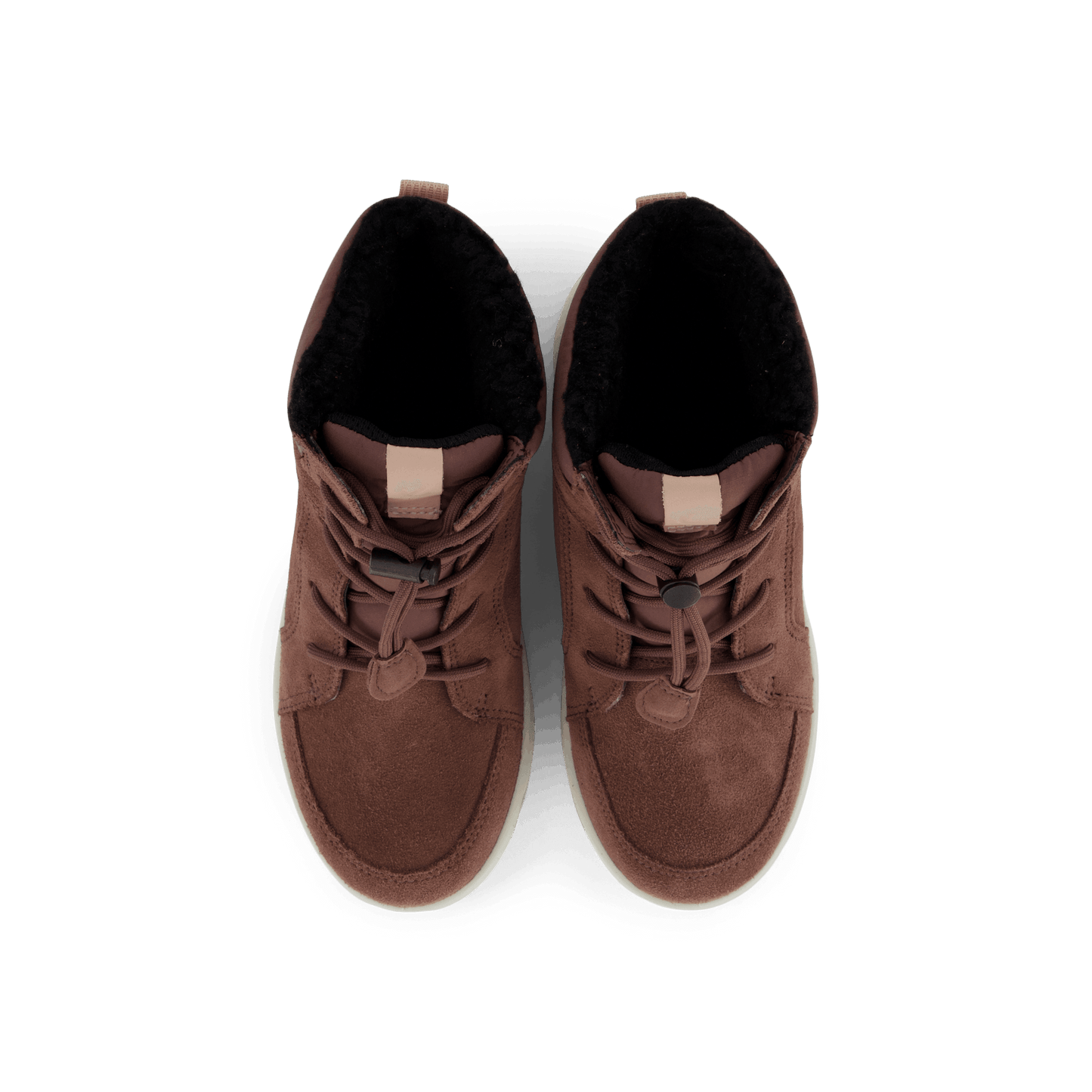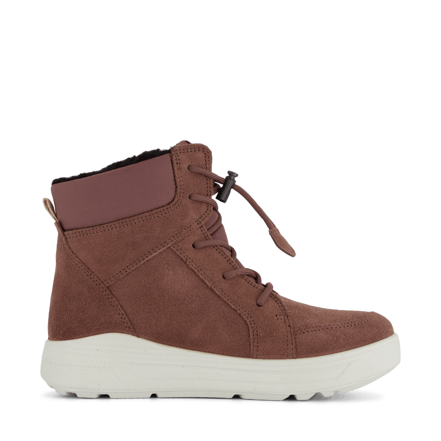 Experience urban style and winter comfort with the Ecco Urban Snowboarder in dusty purple. This high-top sneaker boot features a suede leather upper, lace-up closure with toggle adjuster, and a warm fleece-lined collar. The thick white rubber sole provides traction, while the modern design blends casual fashion with functional cold-weather footwear.