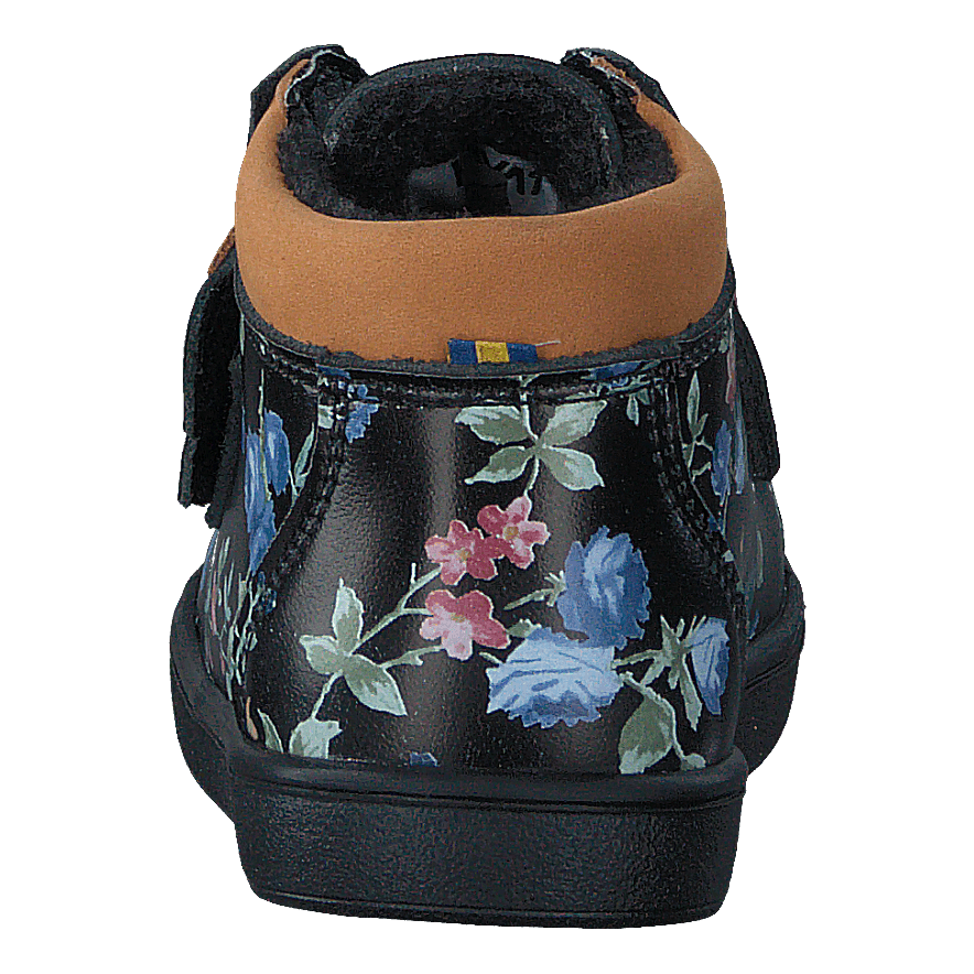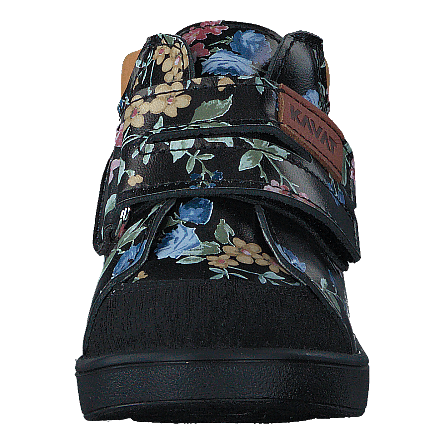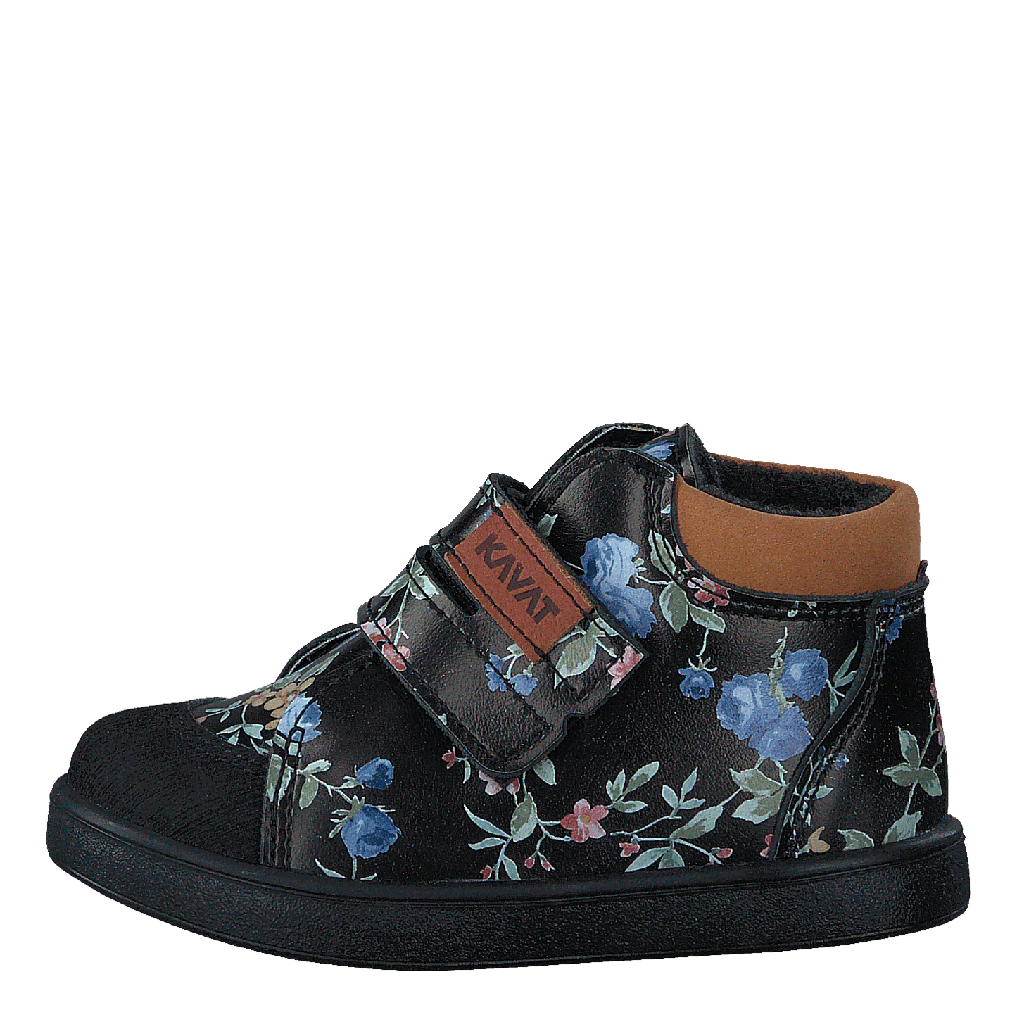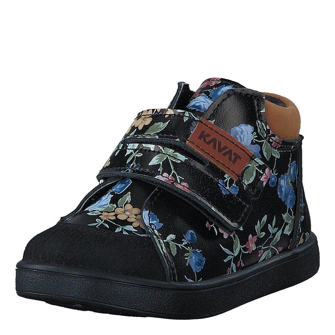Kavat's Fiskeby XC Floral children's ankle boot combines style and practicality. This black leather shoe features a vibrant blue rose and green leaf pattern, complemented by a brown leather ankle collar. With a velcro strap closure, reinforced toe cap, and durable rubber sole, it offers both comfort and durability for active kids who love nature-inspired designs.