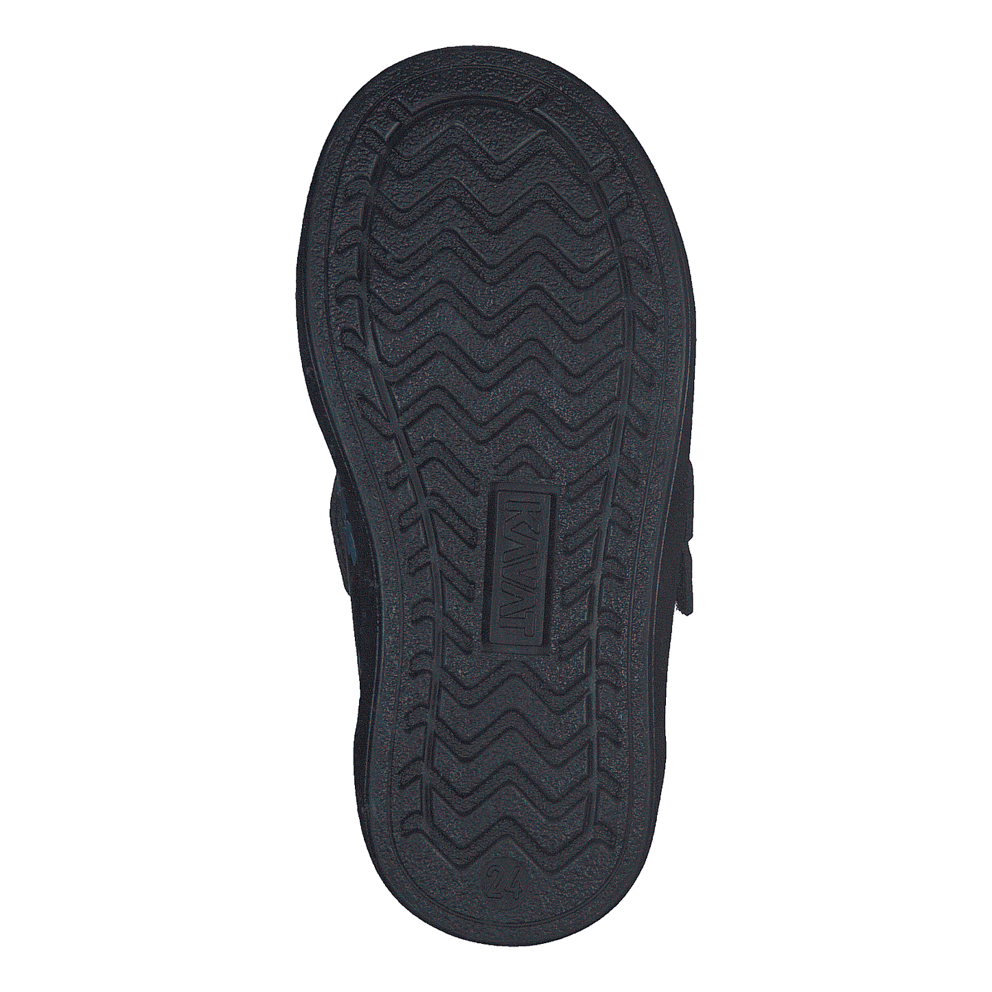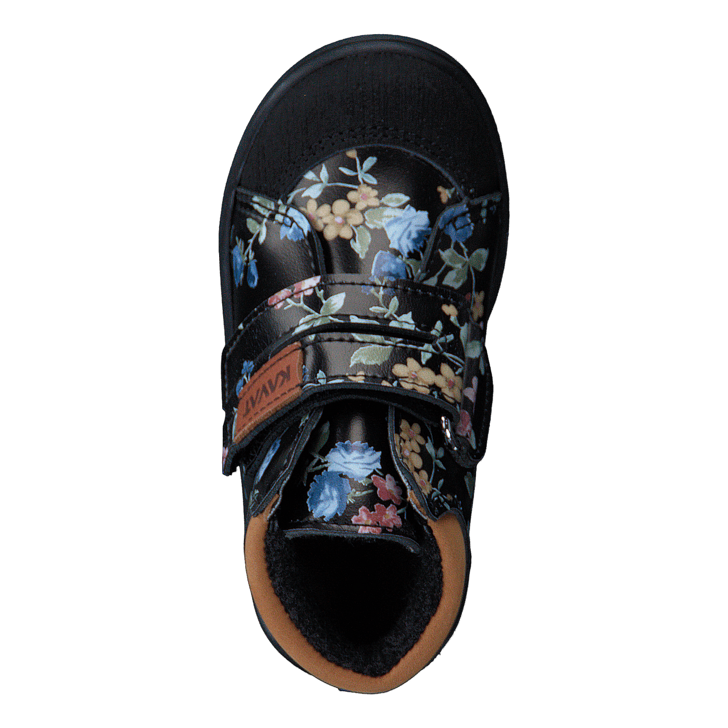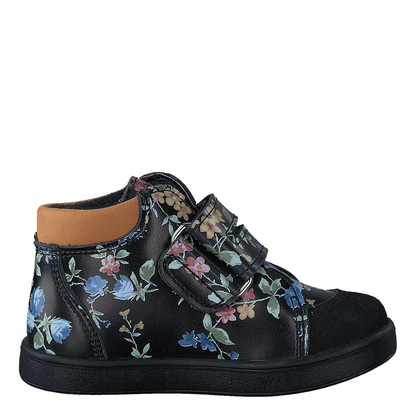 Kavat's Fiskeby XC Floral children's ankle boot combines style and practicality. This black leather shoe features a vibrant blue rose and green leaf pattern, complemented by a brown leather ankle collar. With a velcro strap closure, reinforced toe cap, and durable rubber sole, it offers both comfort and durability for active kids who love nature-inspired designs.
