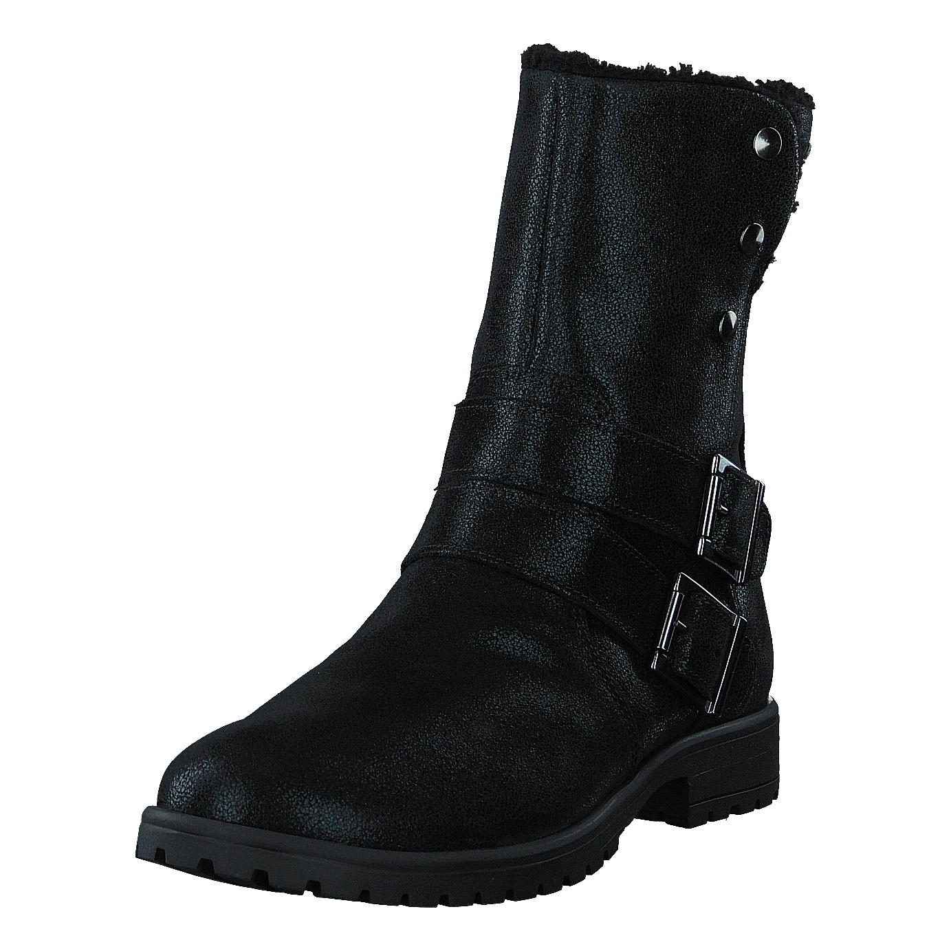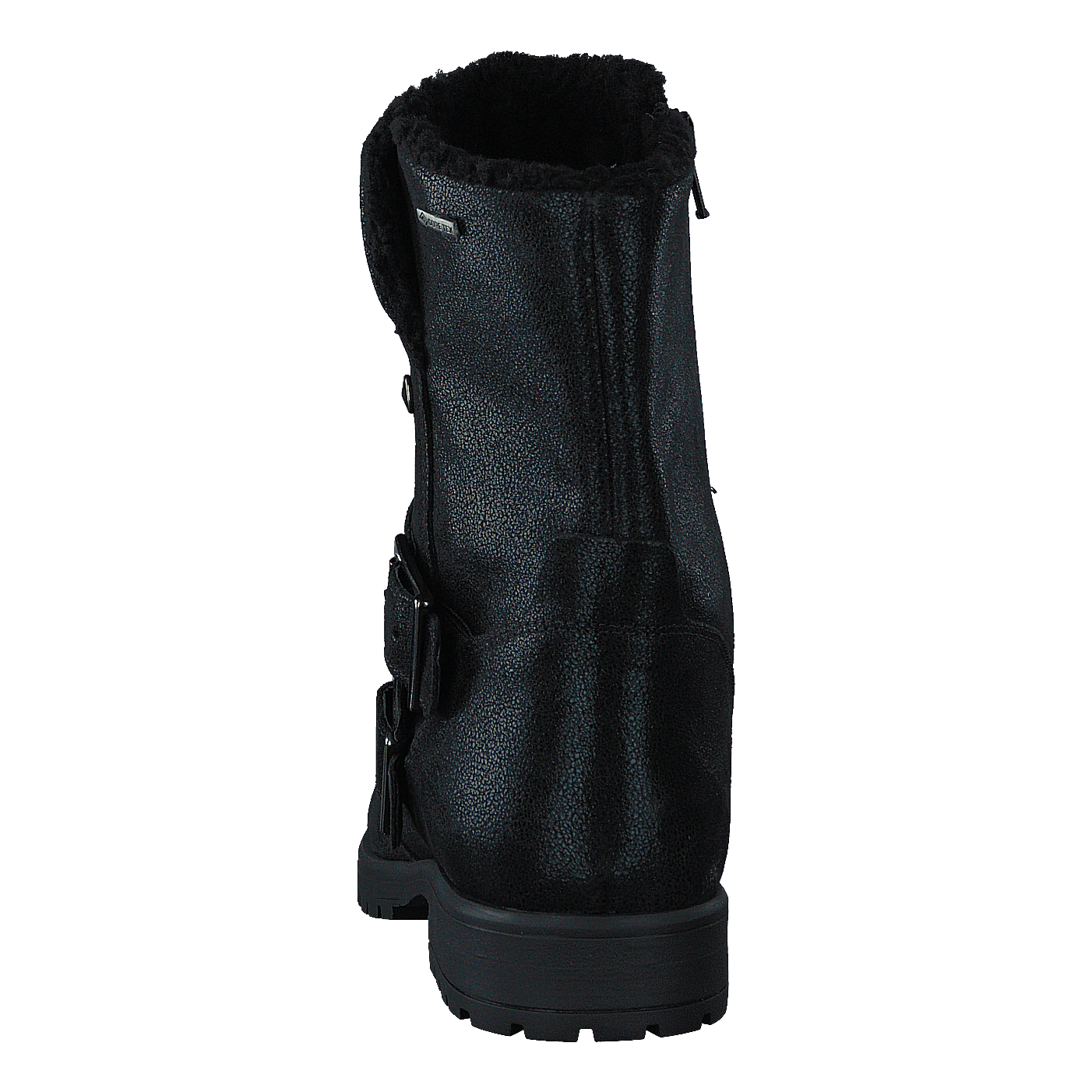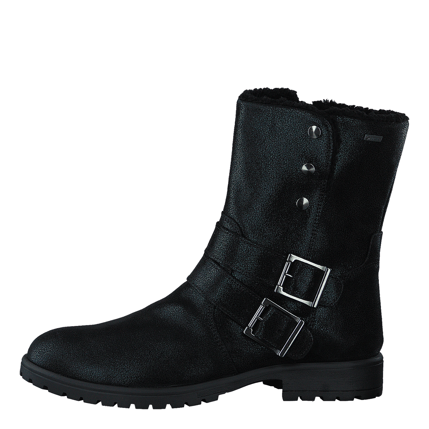Stylish and functional, these Galaxy Gore-tex Black ankle boots by Superfit blend fashion with practicality. Featuring waterproof GORE-TEX technology, they keep feet warm and dry in various conditions. The black leather-like exterior boasts a subtle metallic sheen, adorned with silver buckles and studs for an edgy look. A thick, rugged sole provides durability and traction, while the fleece-like lining ensures comfort.