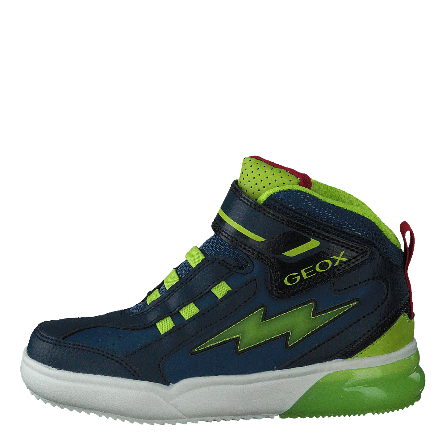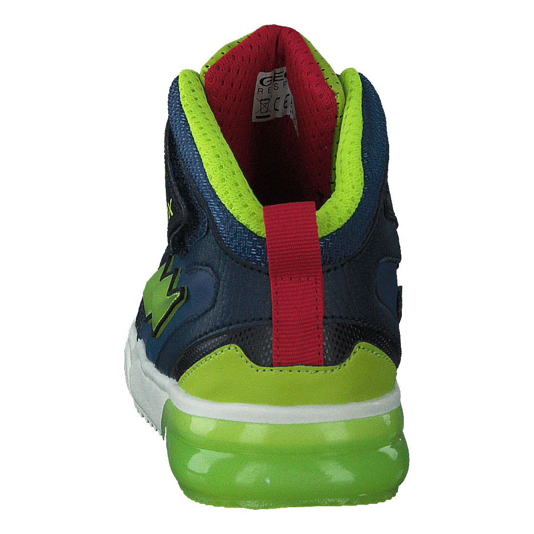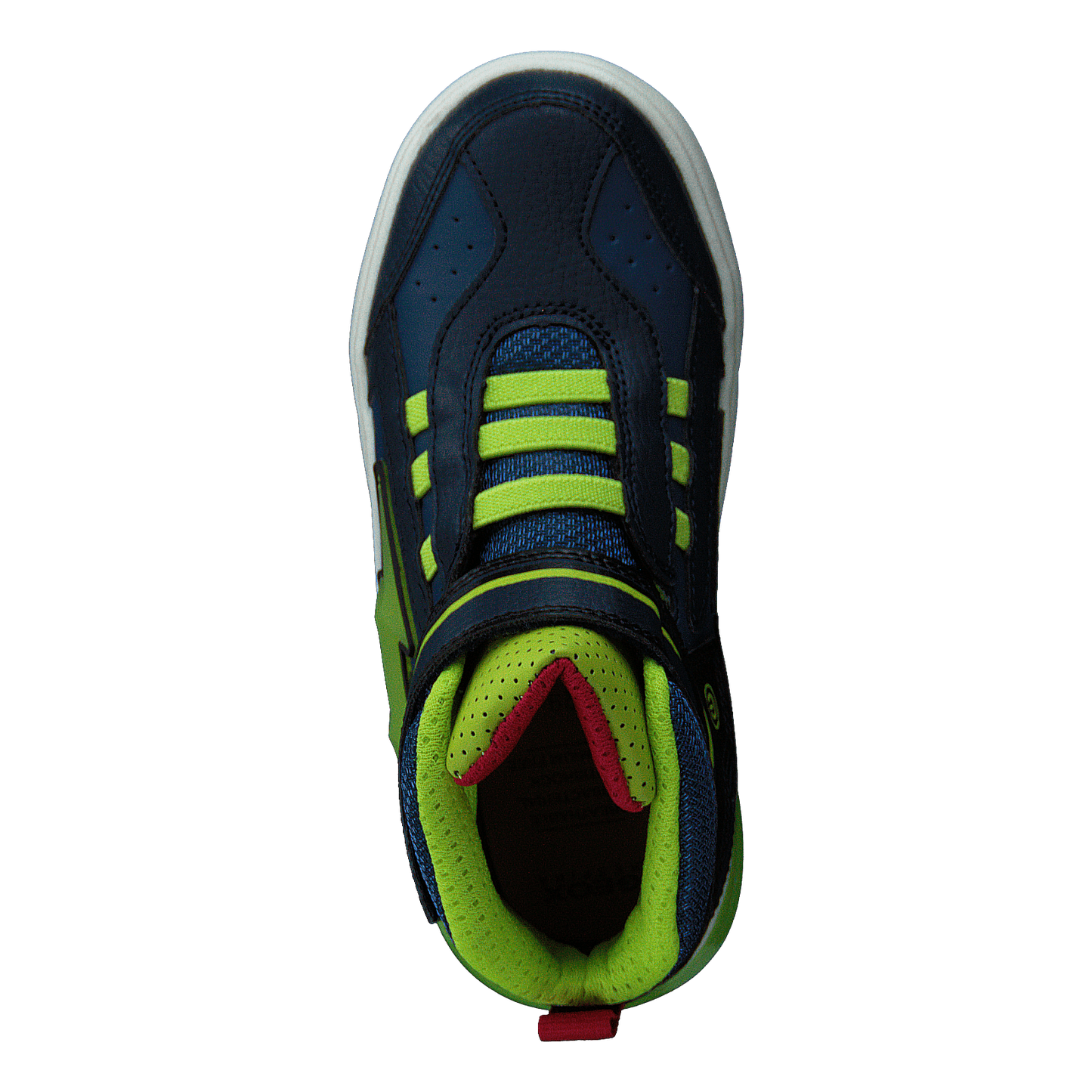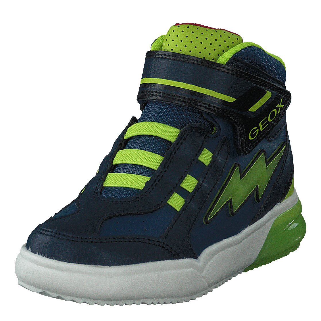 Geox presents a stylish children's high-top sneaker in navy blue with vibrant lime green accents. This sporty shoe features a velcro strap for easy fastening, a breathable perforated tongue, and eye-catching lightning bolt designs. The chunky white and lime sole provides cushioning, while red pull tabs ensure easy on-off. Combining comfort and bold aesthetics, it's perfect for active kids.