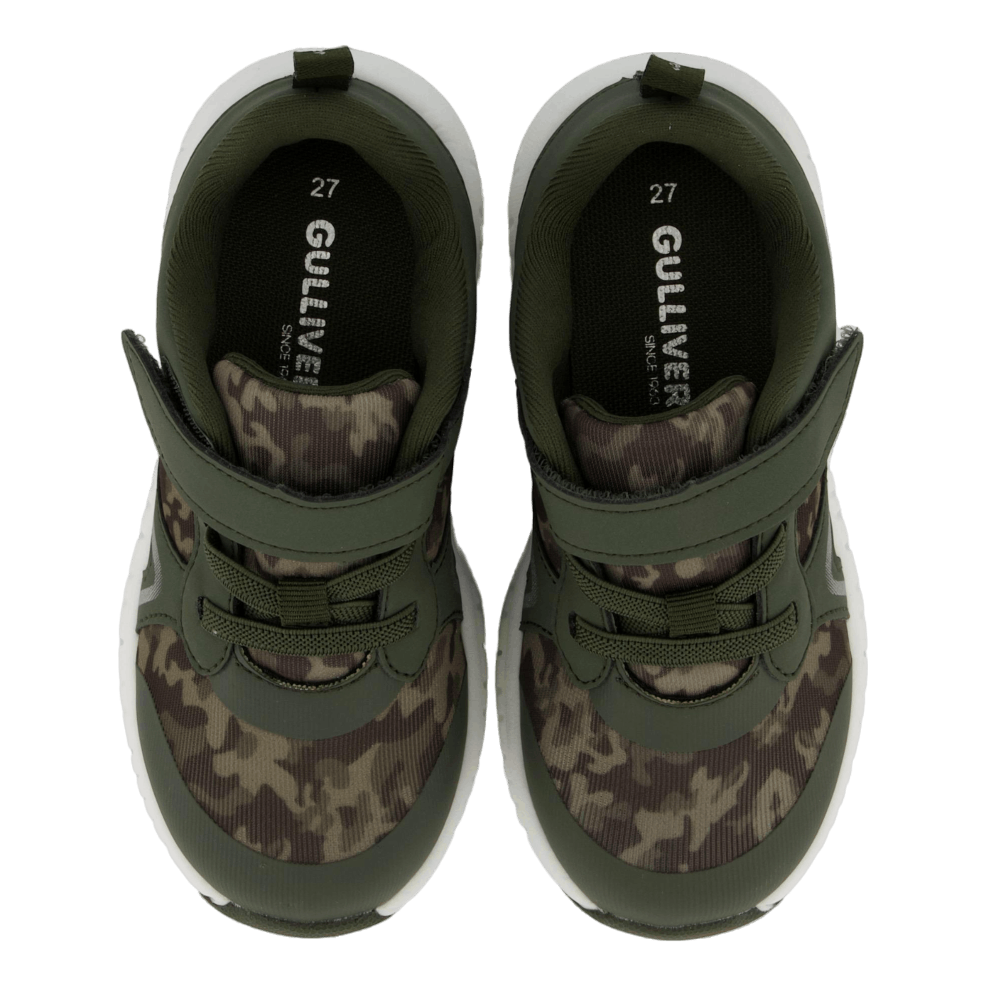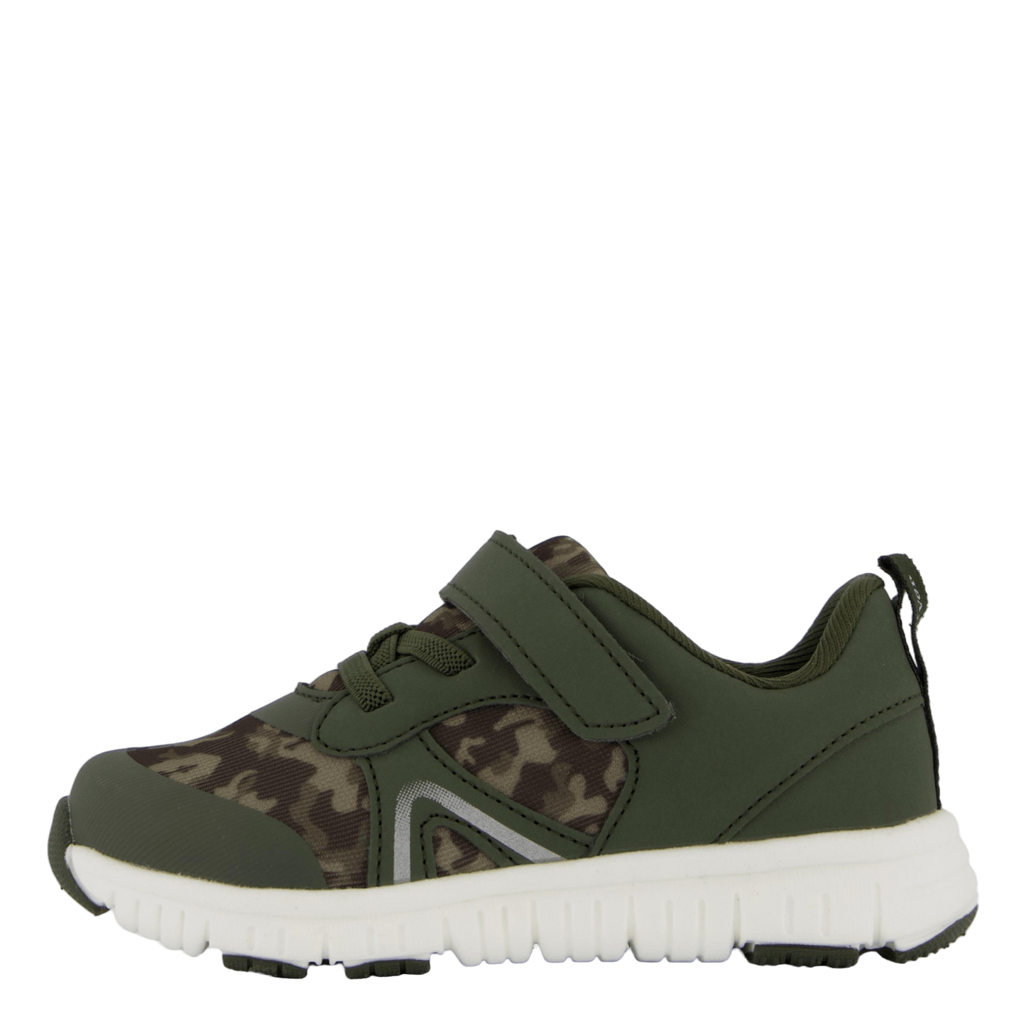 Garpen Green athletic shoes for children combine style and practicality. Featuring a dark green camouflage pattern, these shoes offer easy wear with a velcro strap and elastic laces. The durable synthetic upper and thick, cushioned white sole provide comfort and support for active kids. A reflective silver accent adds visibility, making these shoes ideal for outdoor adventures.