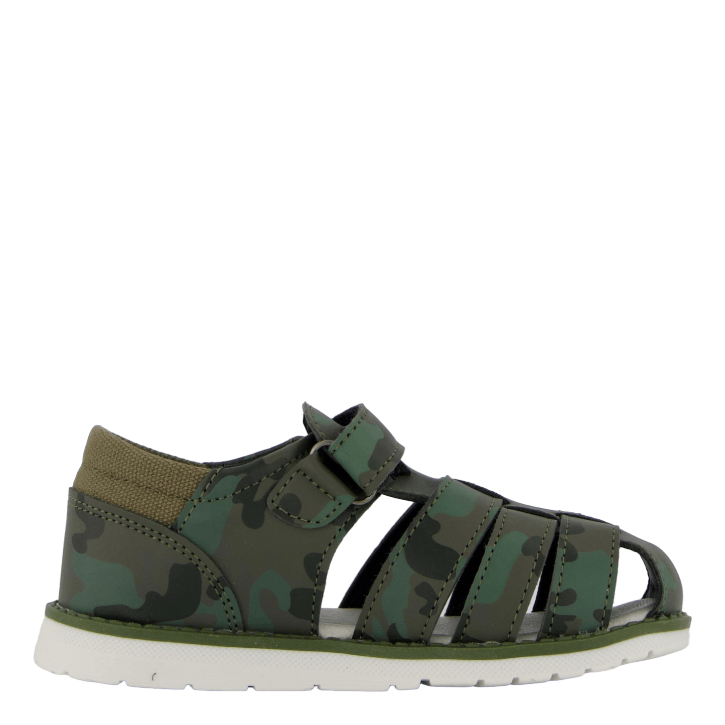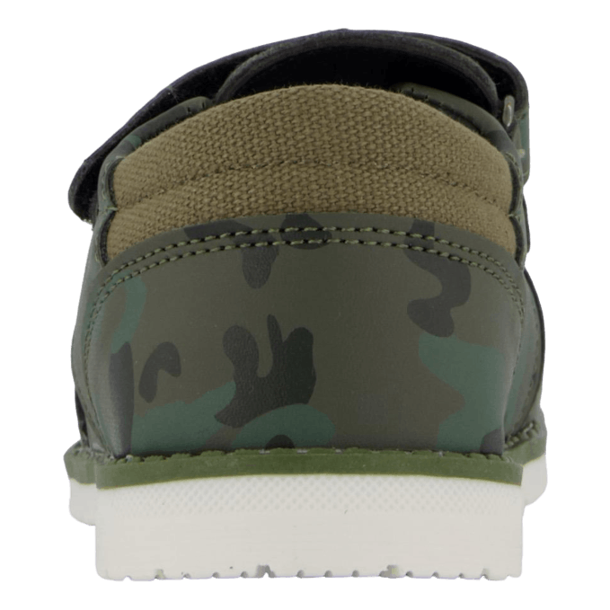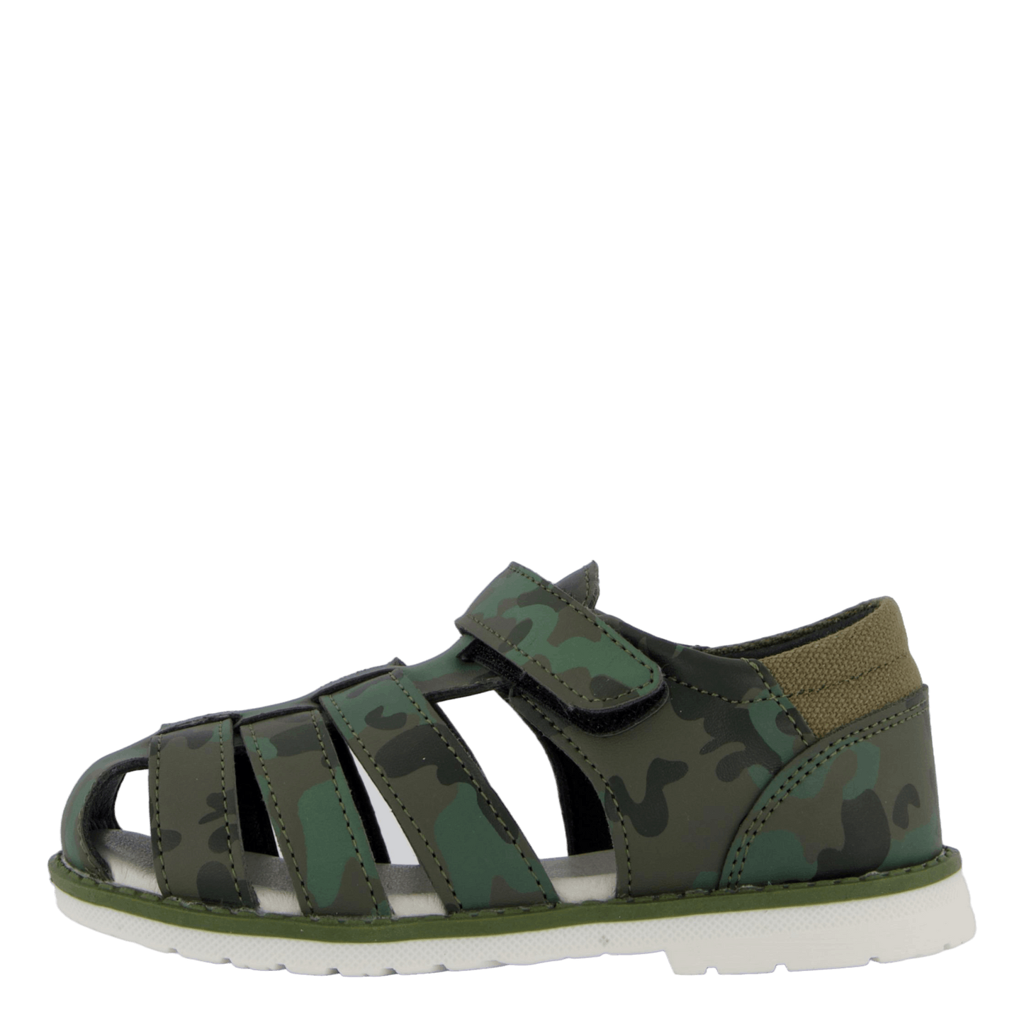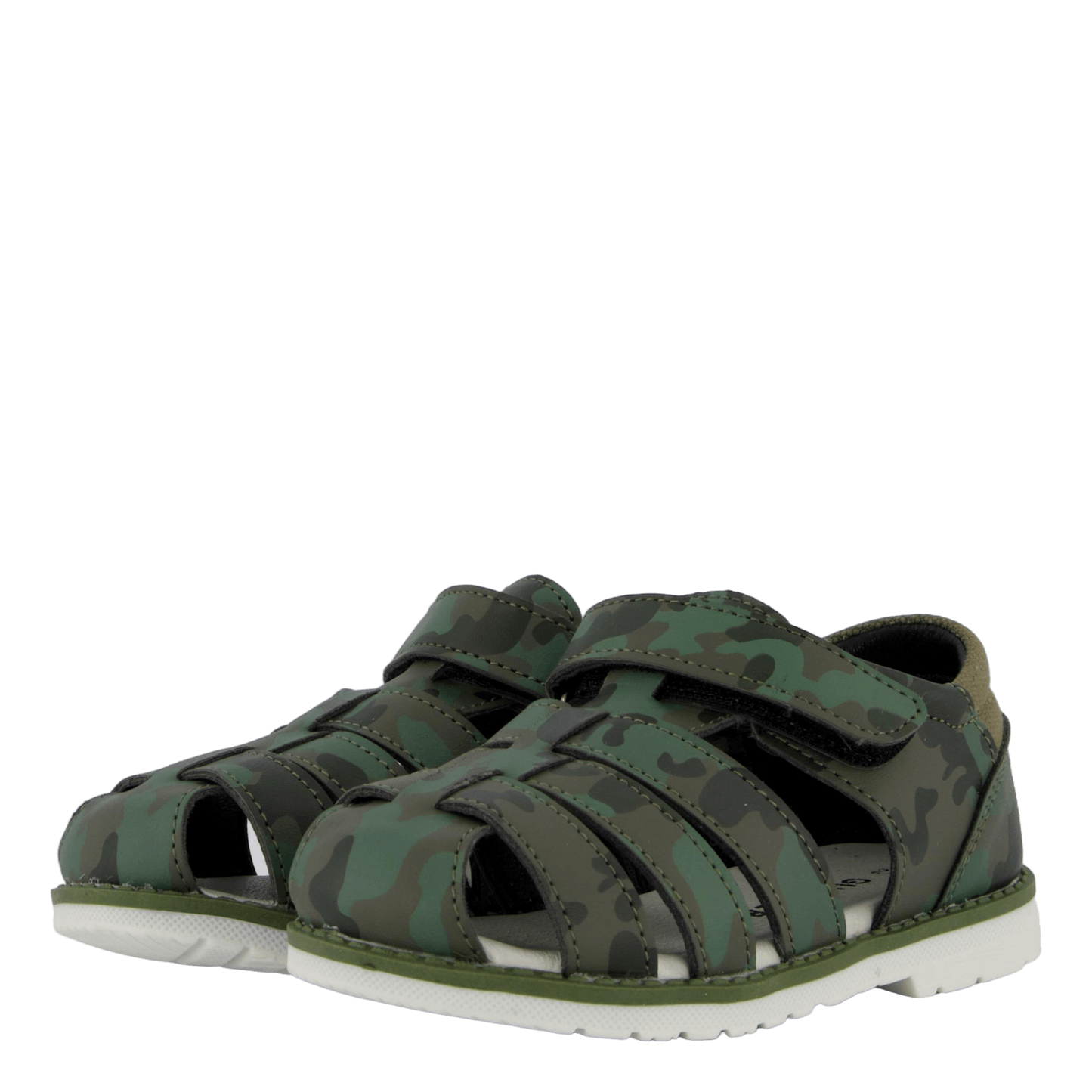 Discover the Humlan Green sandal for children, featuring a stylish camouflage pattern in various green shades. This closed-toe sandal boasts a synthetic leather upper with side cutouts for breathability and a secure velcro strap for easy adjustment. The white, flexible sole provides comfort and contrast, making it ideal for outdoor activities and everyday wear with a military-inspired flair.