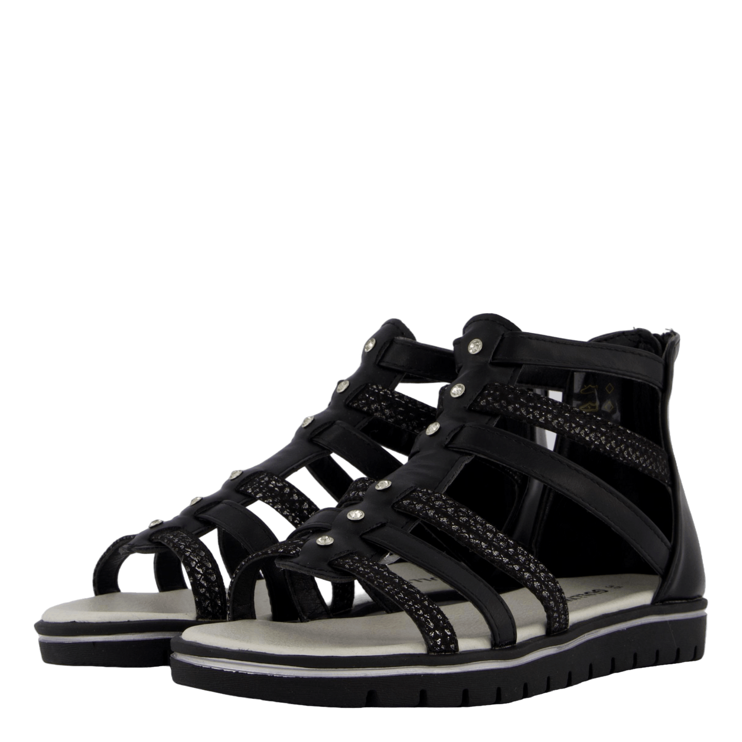 Elevate your style with the Mygga Black sandals by Gulliver. These sleek gladiator-inspired flats feature multiple leather-like straps, some with textured embellishments and metallic studs for edgy flair. The black design offers versatility, while a white-edged platform sole adds contrast. A rear zipper ensures easy wear, making these sandals perfect for day-to-night urban looks.
