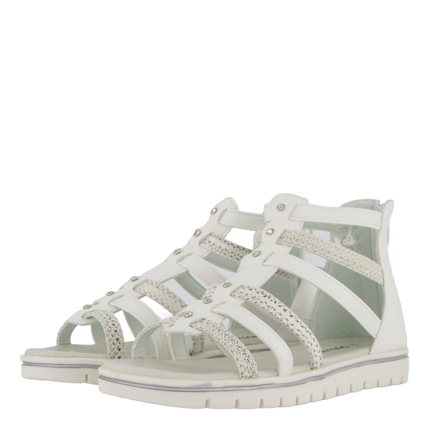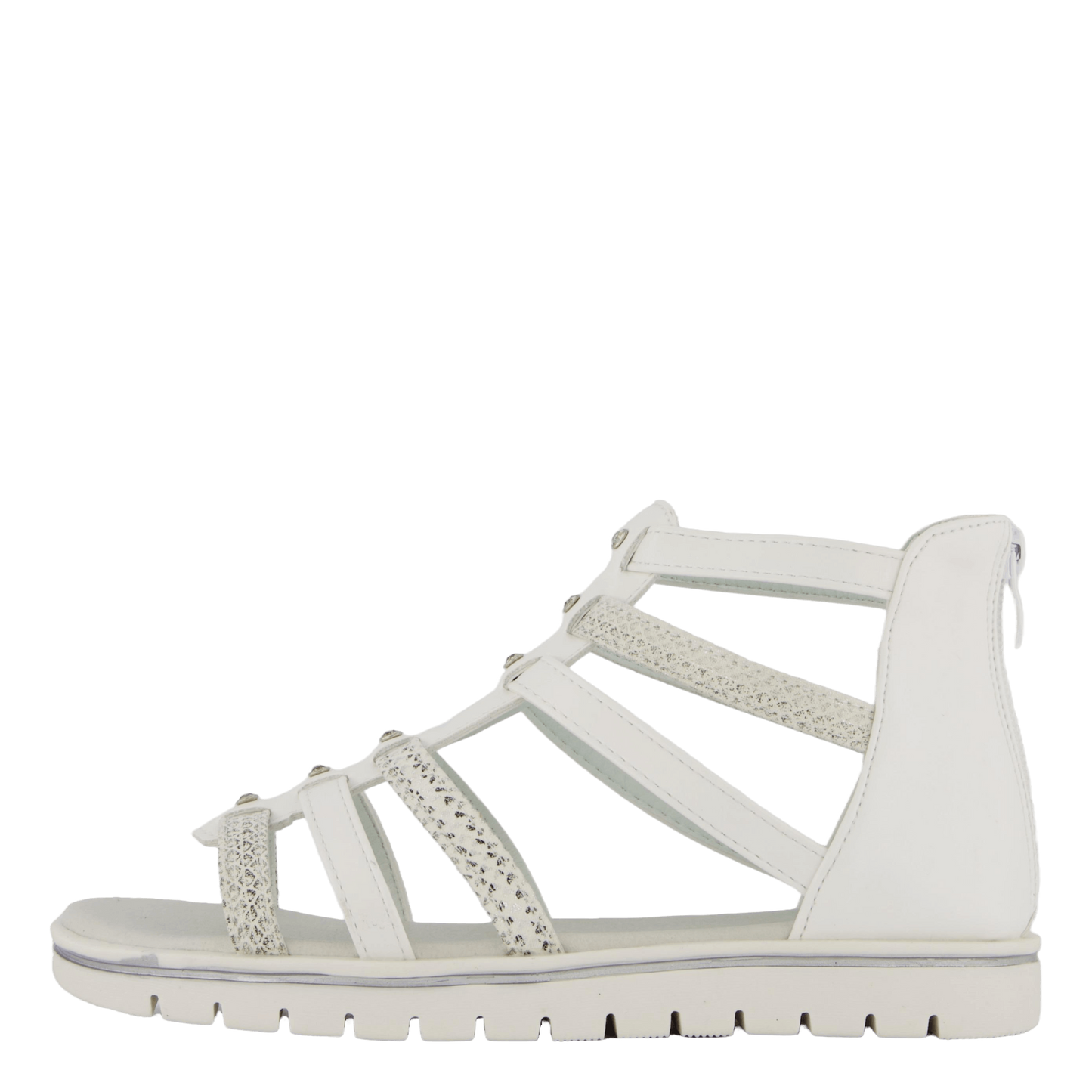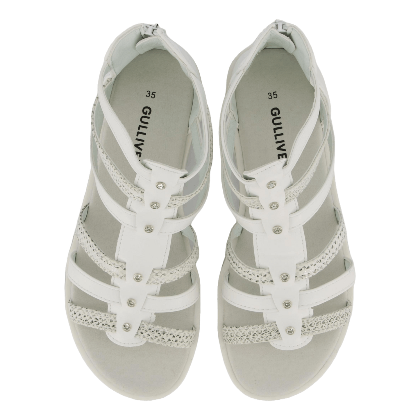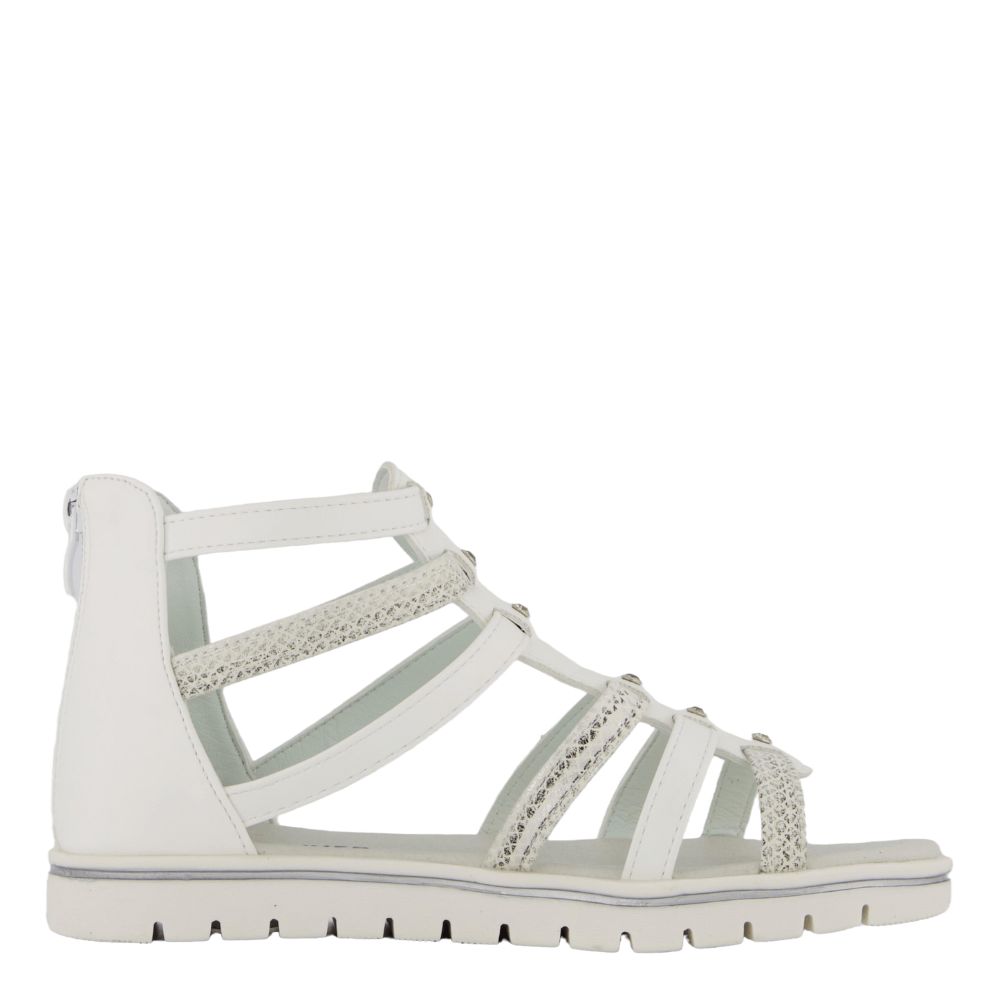 Elevate your summer style with the Mygga White sandals. These elegant gladiator-style shoes feature intricate white leather straps adorned with textured details and subtle metallic studs. The thick, flexible sole ensures comfort, while the back zipper offers easy wear. Perfect for casual and dressy occasions, these versatile sandals blend fashion and functionality.