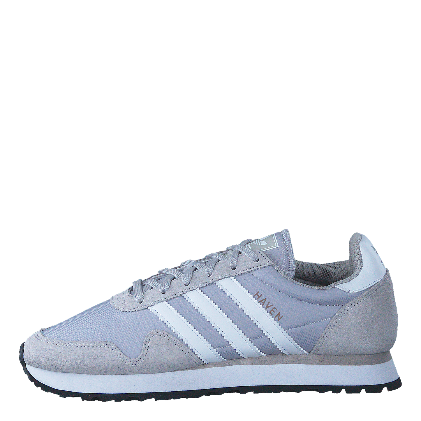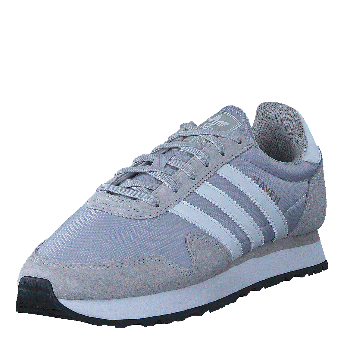 Elevate your casual style with the Haven Lgh sneaker from adidas Originals. This retro-inspired shoe features a light grey upper with white accents, combining mesh fabric and suede overlays for texture and durability. The iconic three-stripe design in white adds a classic touch, while the white sole provides contrast and comfort. Perfect for everyday wear, these sneakers blend vintage charm with modern aesthetics.