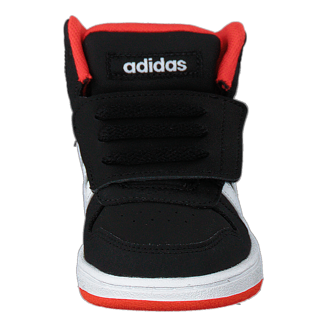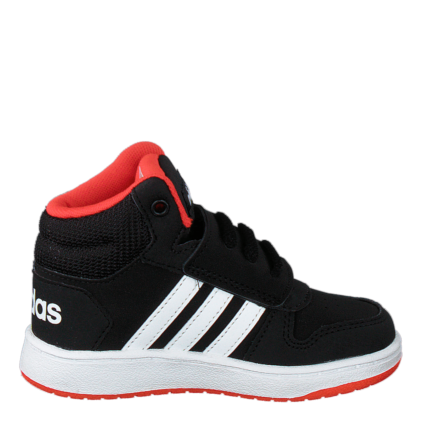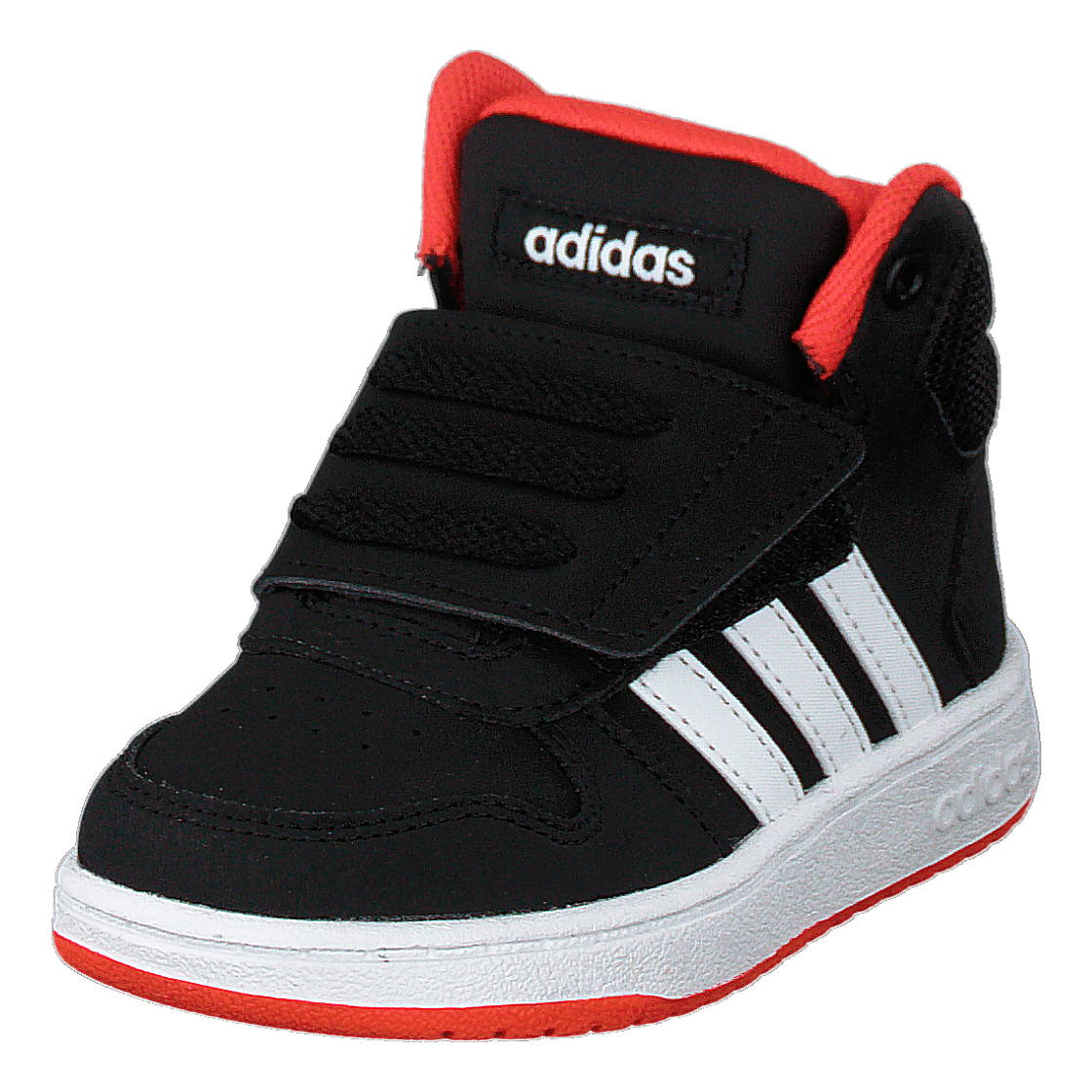 Adidas Originals Hoops Mid 2.0 I offers a stylish blend of comfort and support for little feet. This basketball-inspired shoe features a black synthetic upper with iconic white stripes and vibrant red accents. The mid-top design includes a padded collar, mesh for breathability, and a convenient velcro strap for easy on-off. Perfect for active toddlers and young children.