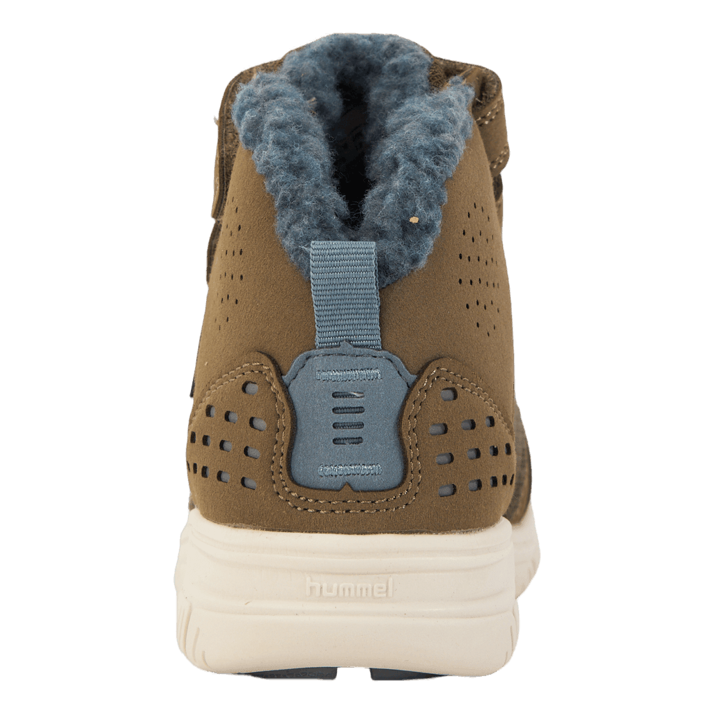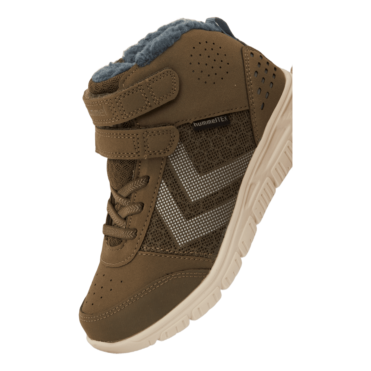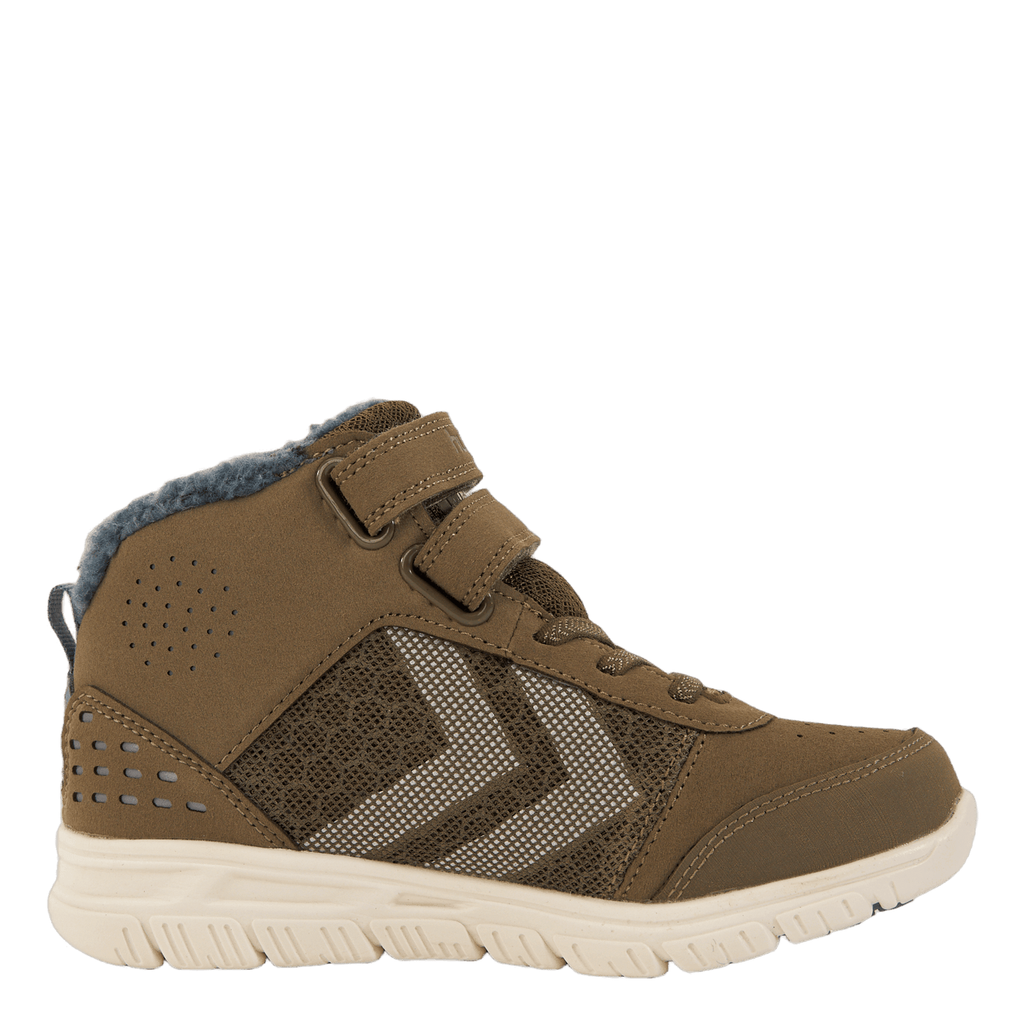 Hummel's Crosslite Winter Mid Tex Jr in Dark Olive is a versatile children's winter boot designed for comfort and functionality. Featuring a mid-top design with a velcro strap and traditional laces, these boots offer easy adjustment and a secure fit. The suede leather and mesh construction provides durability and breathability, while the padded collar with fleece lining ensures warmth. A chunky, light-colored sole offers reliable traction for winter activities.