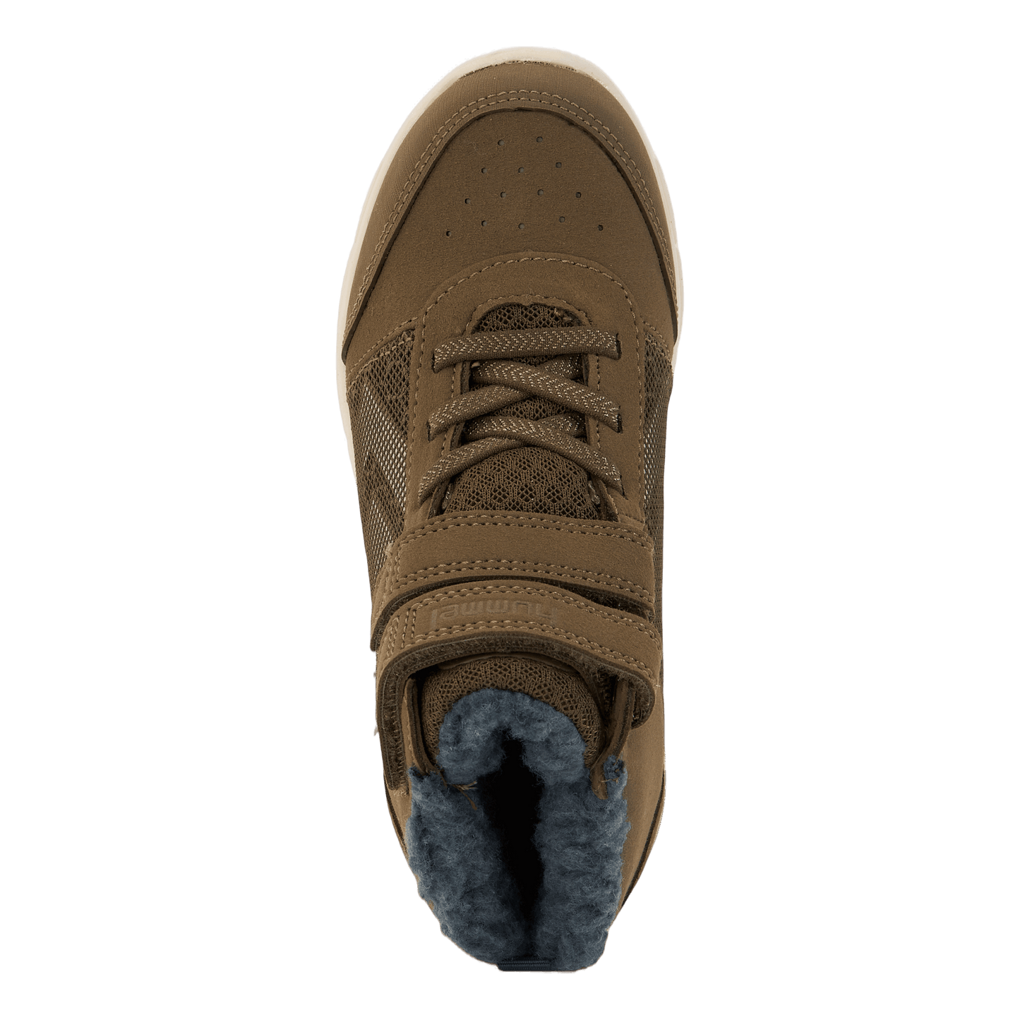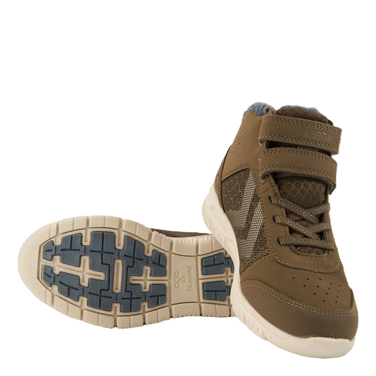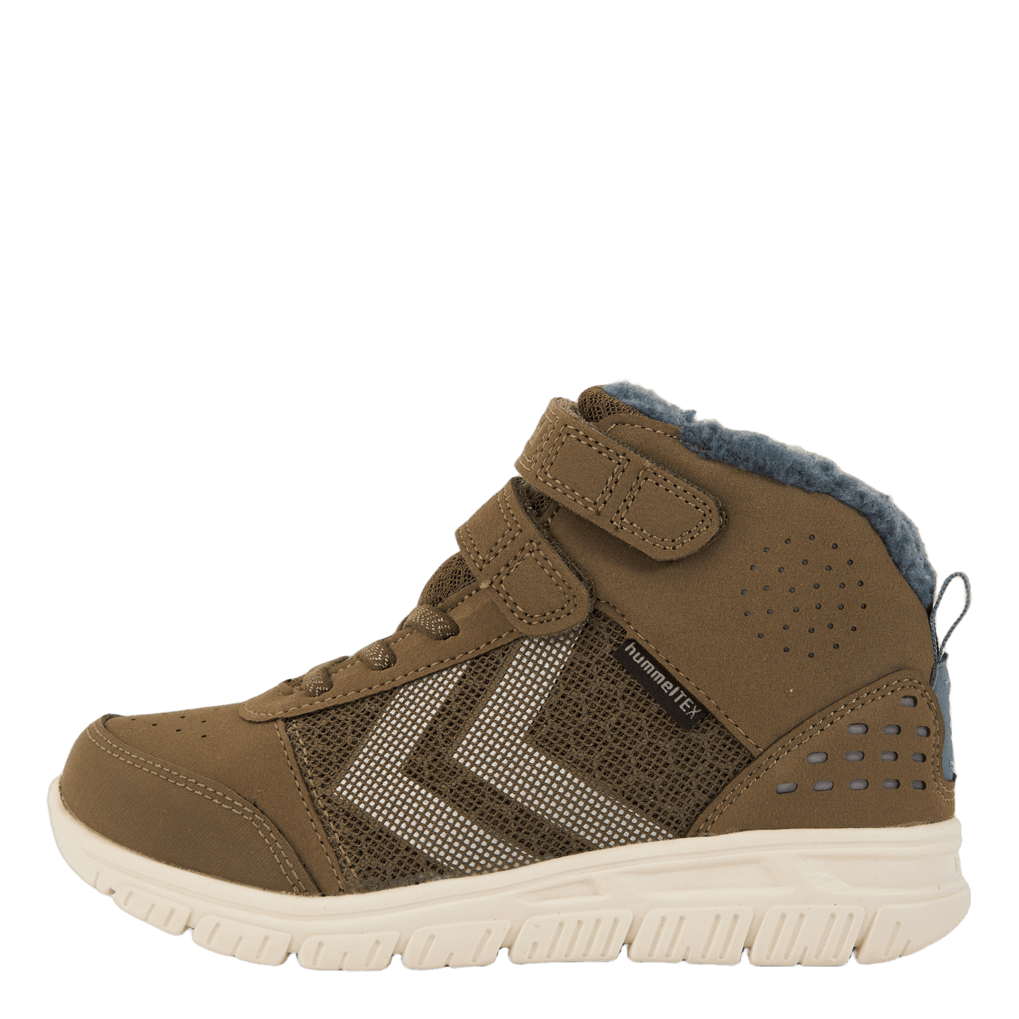Hummel's Crosslite Winter Mid Tex Jr in Dark Olive is a versatile children's winter boot designed for comfort and functionality. Featuring a mid-top design with a velcro strap and traditional laces, these boots offer easy adjustment and a secure fit. The suede leather and mesh construction provides durability and breathability, while the padded collar with fleece lining ensures warmth. A chunky, light-colored sole offers reliable traction for winter activities.