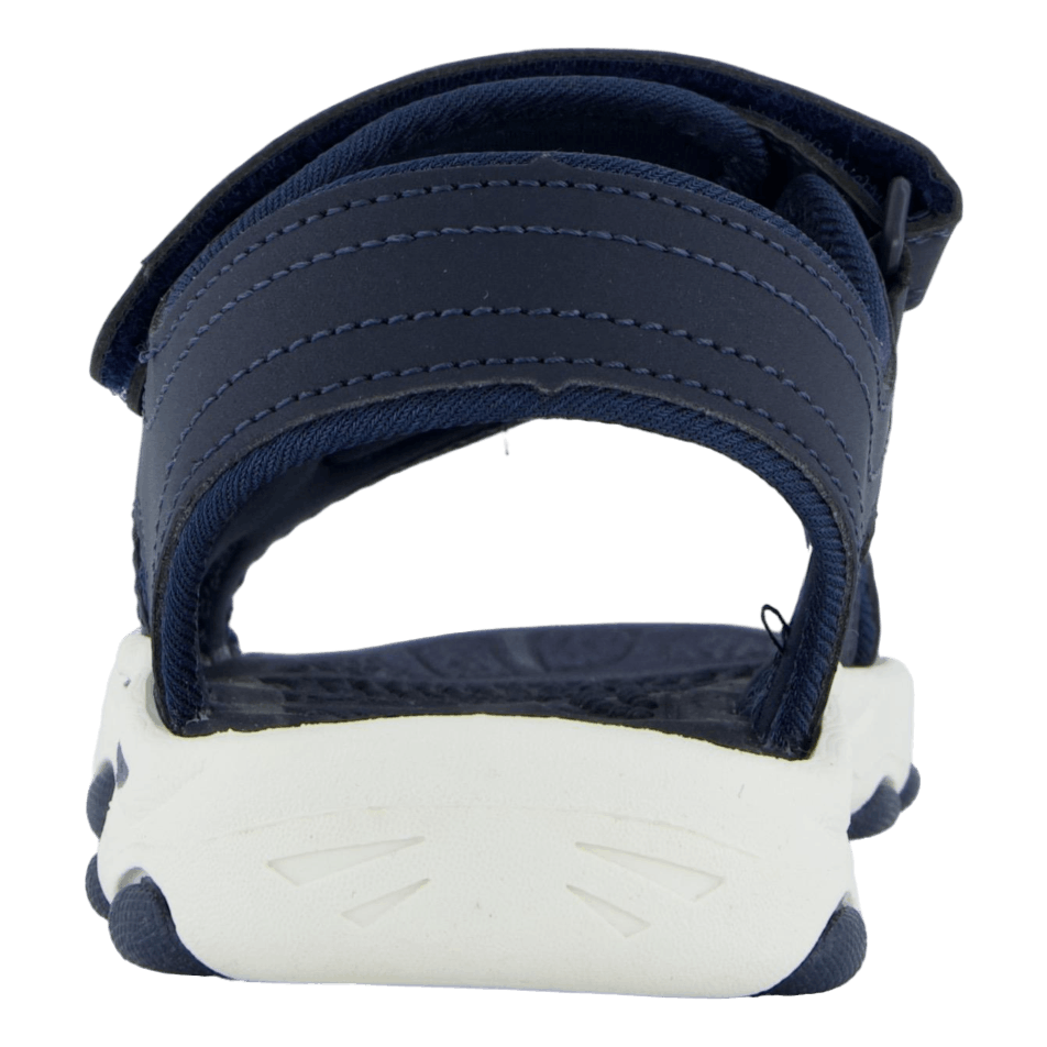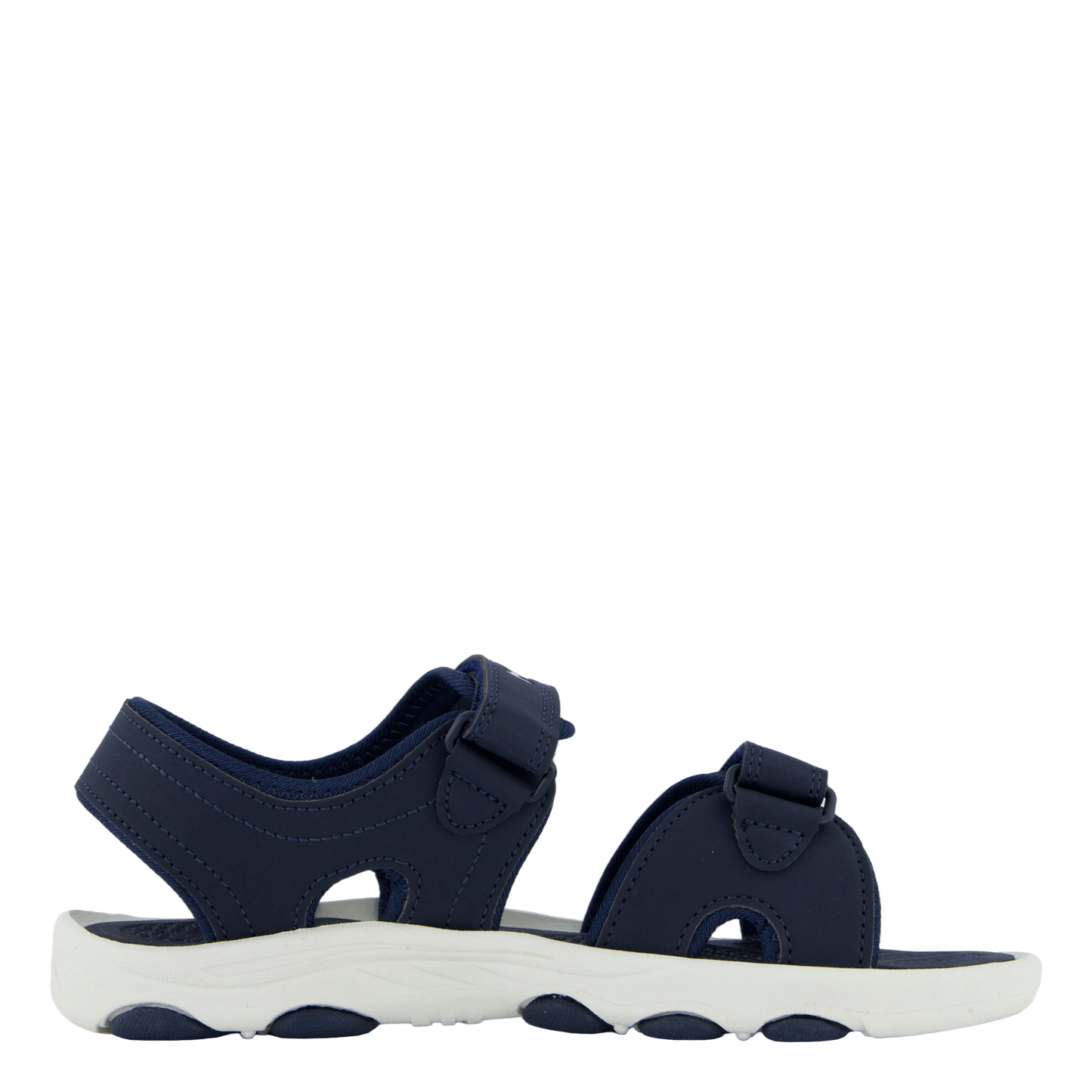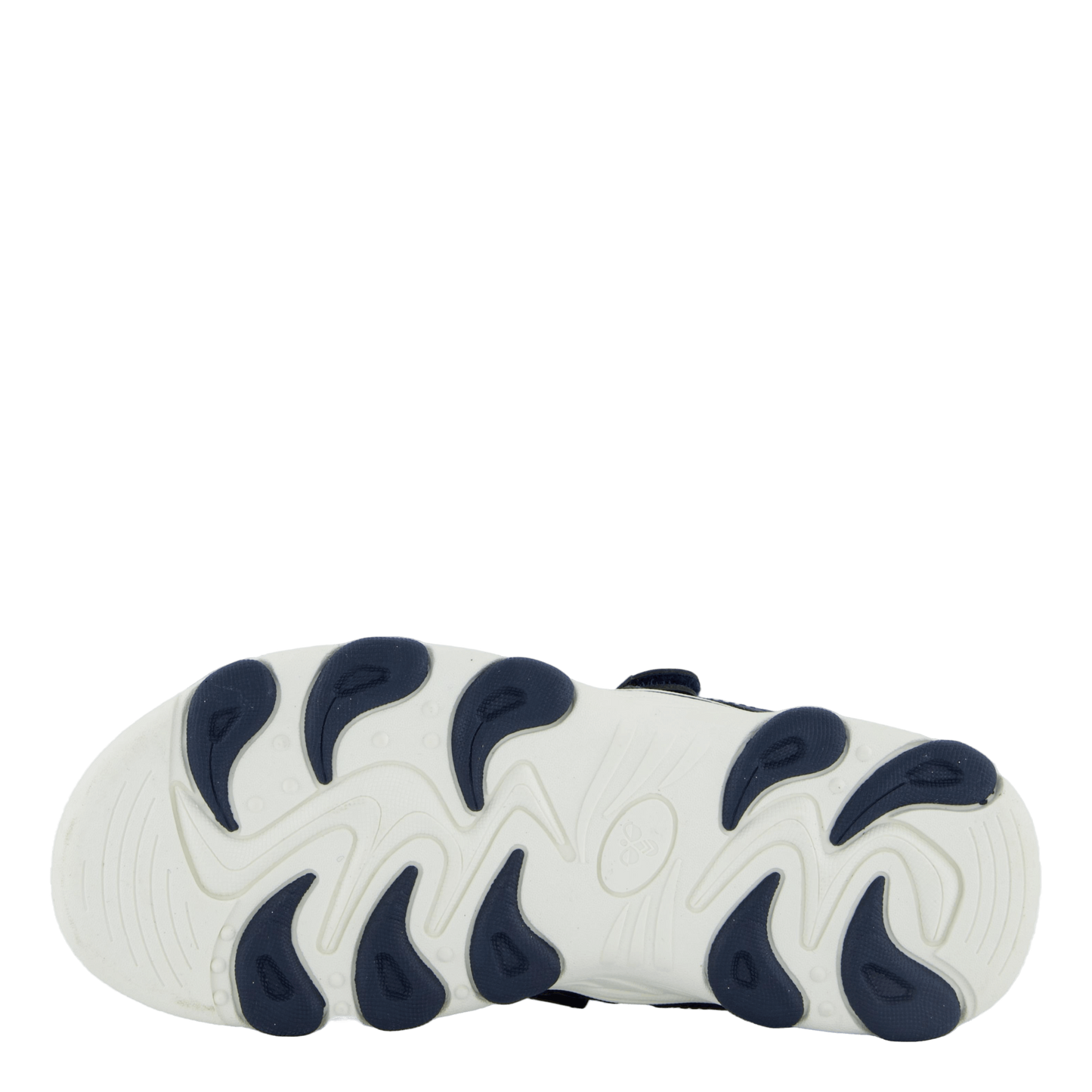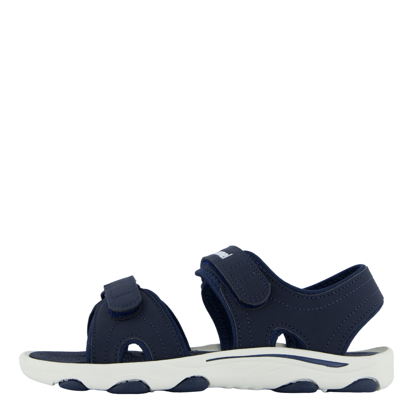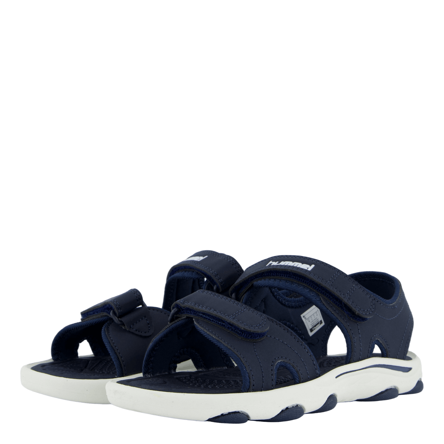 Hummel's Sandal Wave Jr in Black Iris offers a perfect blend of style and functionality for active kids. This navy blue sandal features a comfortable white sole and two adjustable velcro straps for a customizable fit. Made with water-friendly synthetic material, it's ideal for various activities. The contoured sole provides support, while its modern, minimalist design ensures versatility.