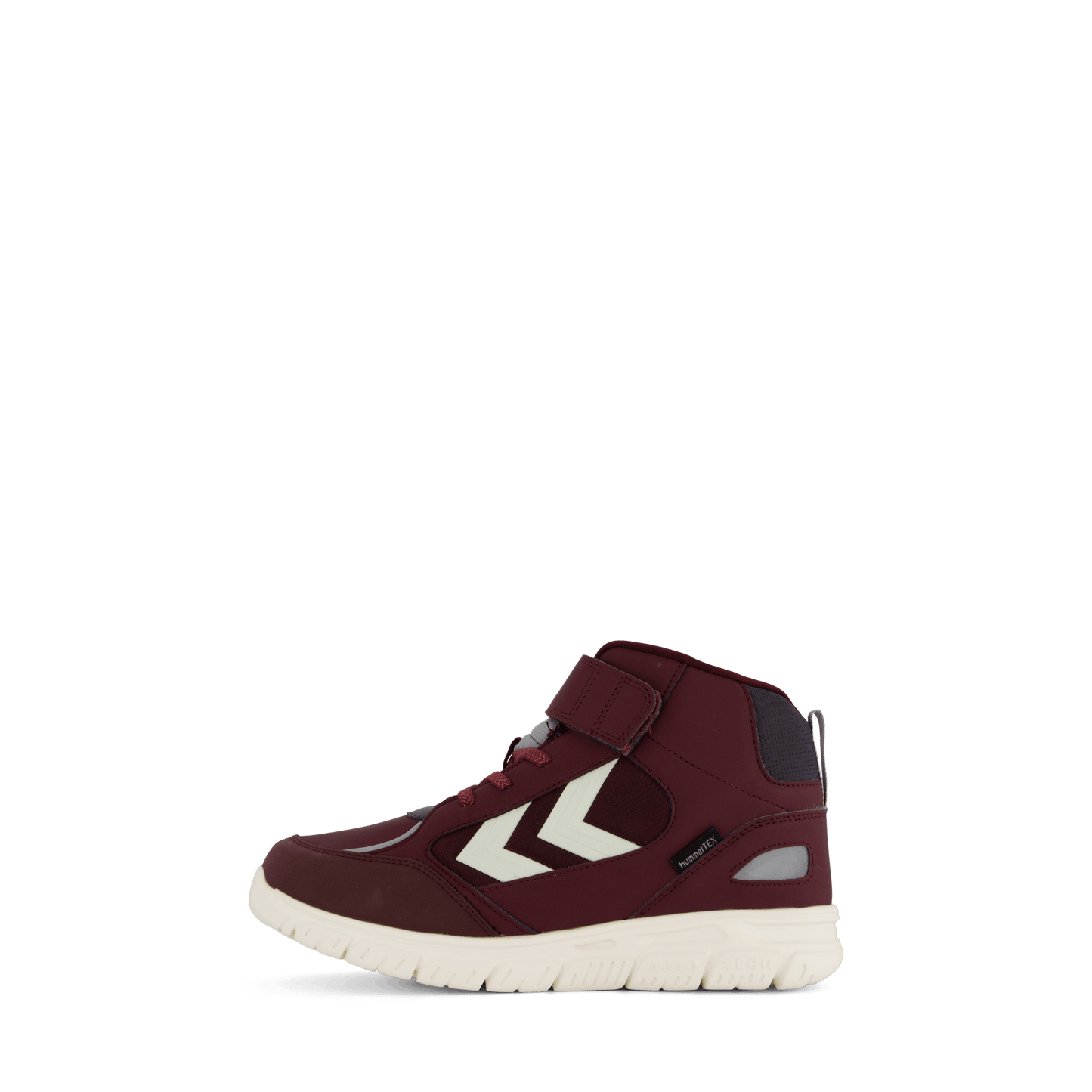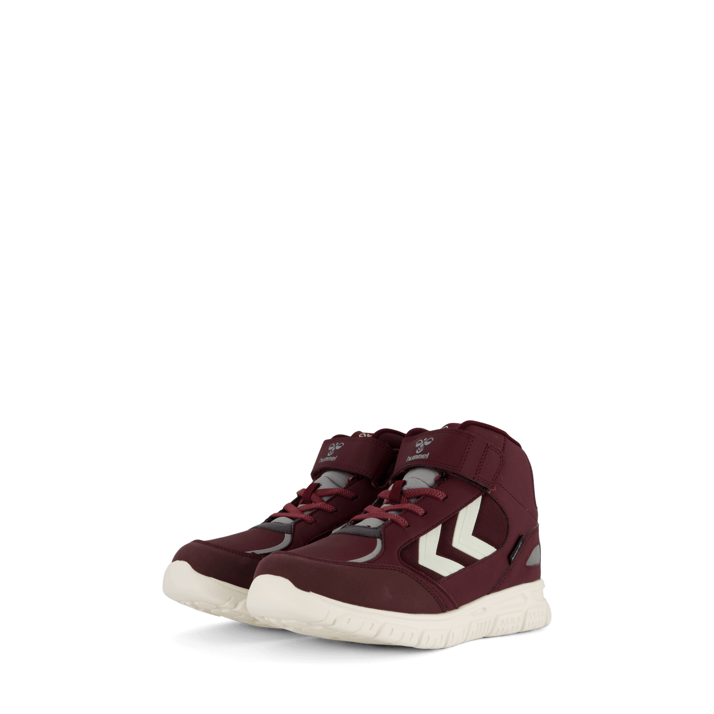 Elevate your child's athletic style with the X-light 2.0 Mid Tex Jr in Catawba Grape. This mid-top sneaker features a deep burgundy hue with white accents, a velcro strap for easy adjustment, and a padded ankle collar for comfort. The water-resistant design, reflective details, and flexible sole make it perfect for active kids, blending performance and casual wear.