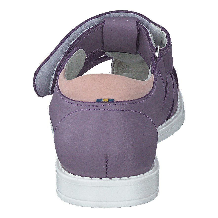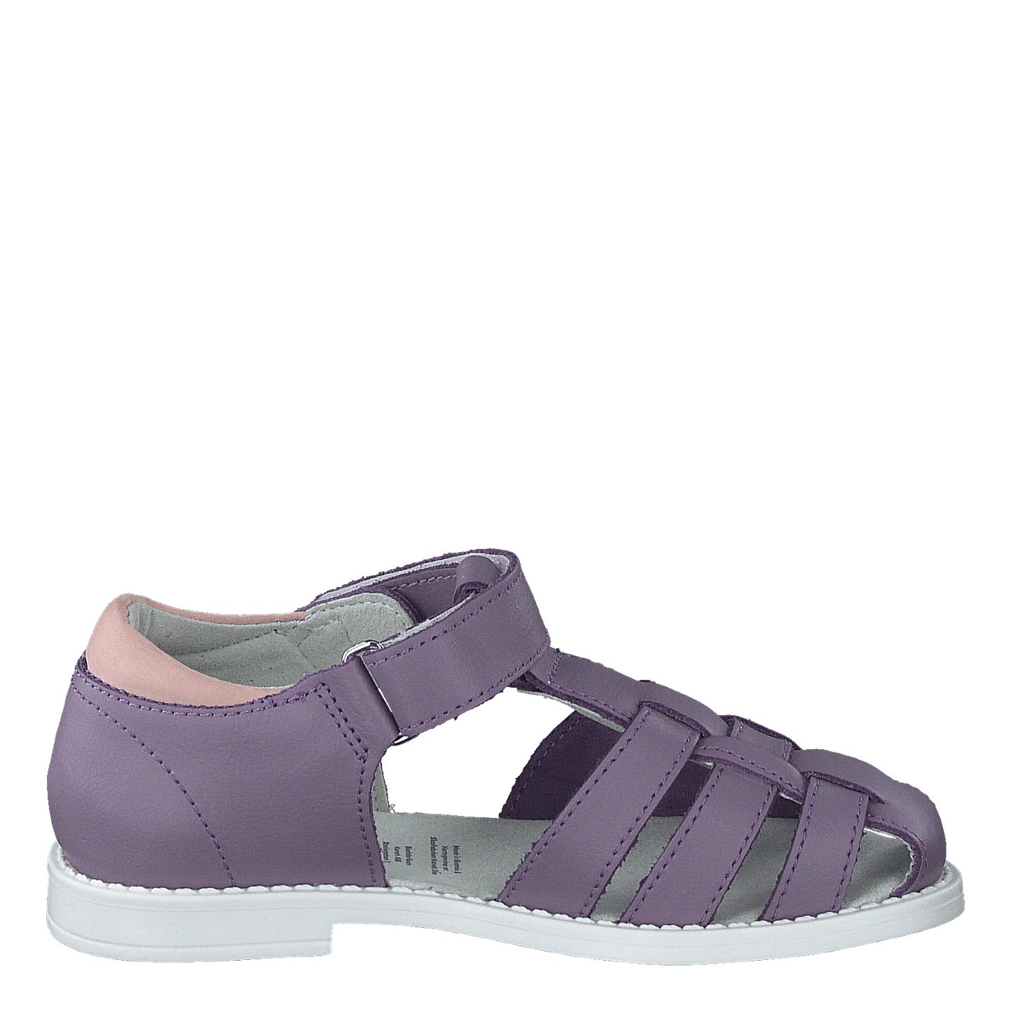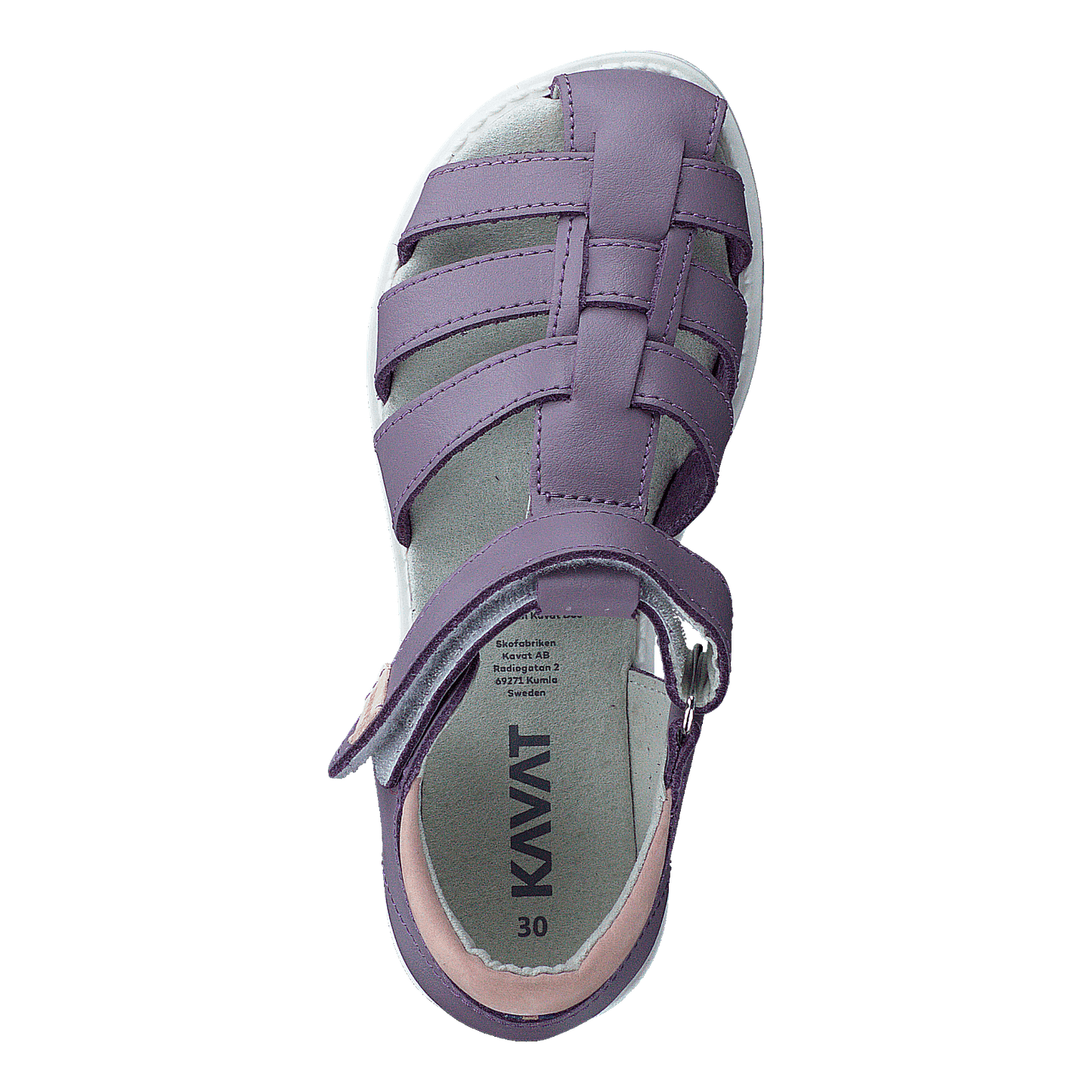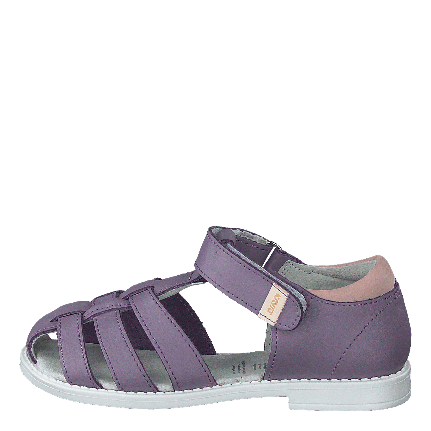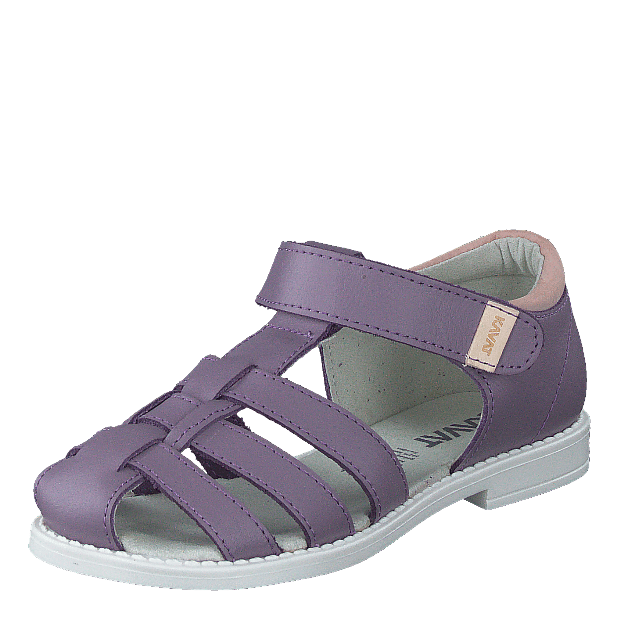 Kavat Forsvik XC Lavendel is a stylish and comfortable children's sandal. Crafted from soft, flexible leather in a muted lavender hue with pale pink accents, it features a closed-toe design with multiple narrow straps for a caged effect. The adjustable ankle strap with metal buckle ensures a secure fit, while the white sole provides contrast and durability for active kids.